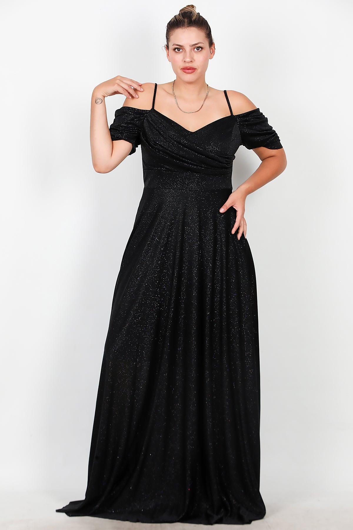 Glam Büyük Beden Payetli Dantel Kollu Siyah Bluz