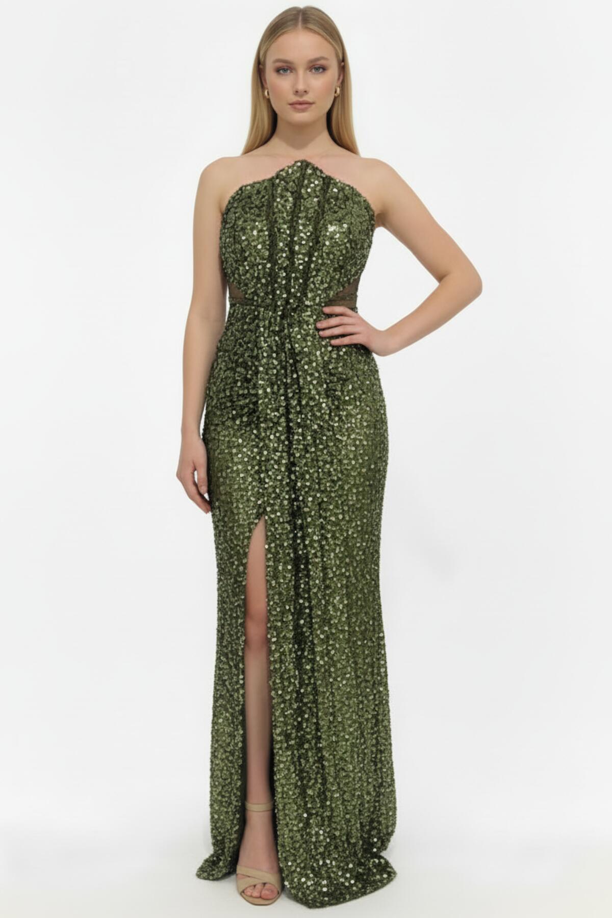 Büyük Beden Uzun Kol Kare Yaka Pullu Boncuklu Abiye Bej