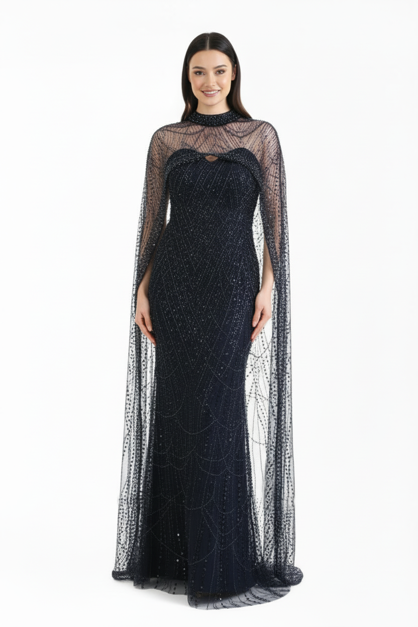 Kadın Pelerinli Pullu Boncuklu İkili Abiye Lacivert