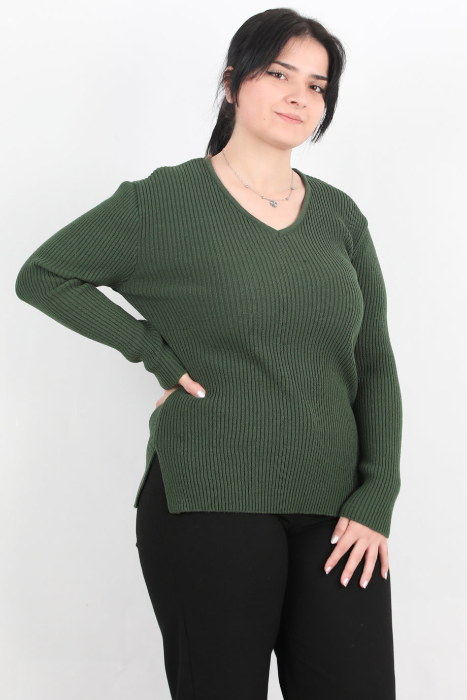 Warmth Büyük Beden V Yaka Triko Kazak Haki