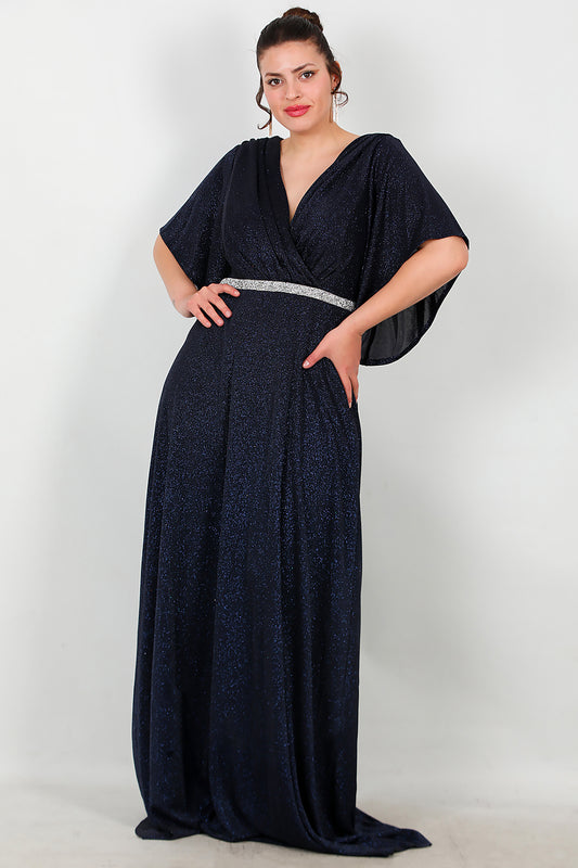 Büyük Beden Dirsek Kol Simli Uzun Abiye Lacivert