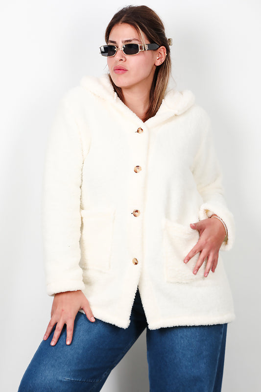 Büyük Beden Önü Düğmeli Peluş Ceket Ekru