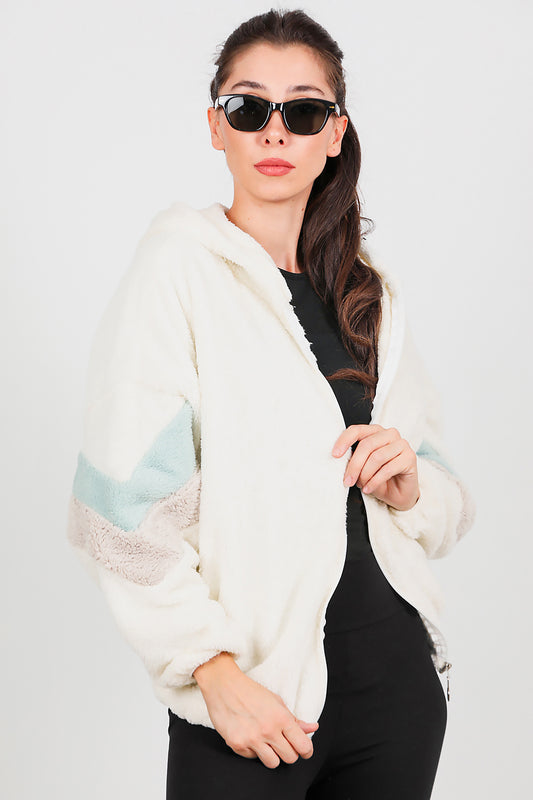 Kadın Kapşonlu Kol Çizgi Detay Peluş Ceket Ekru