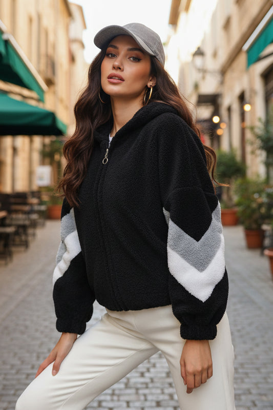 Kadın Kapşonlu Kol Çizgi Detay Peluş Ceket Siyah