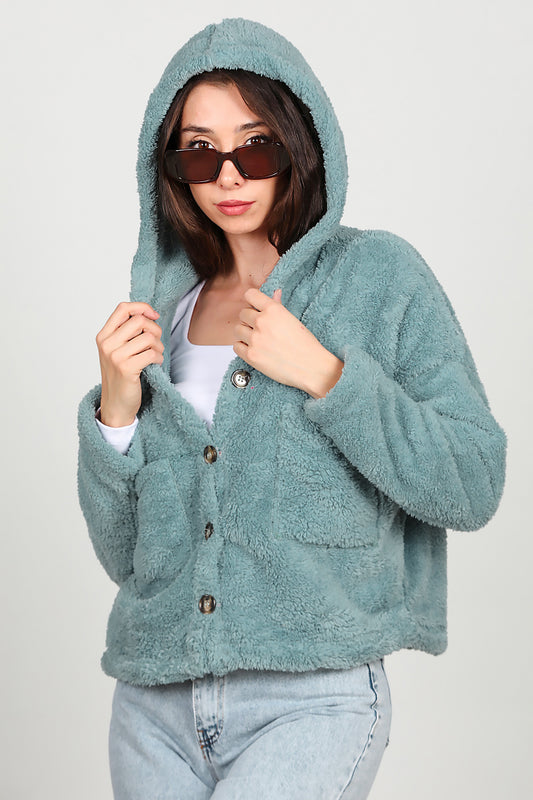 Kadın Kısa Kapşonlu Düğmeli Peluş Ceket Mint