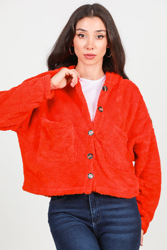 Kadın Kısa Kapşonlu Düğmeli Peluş Ceket Nar