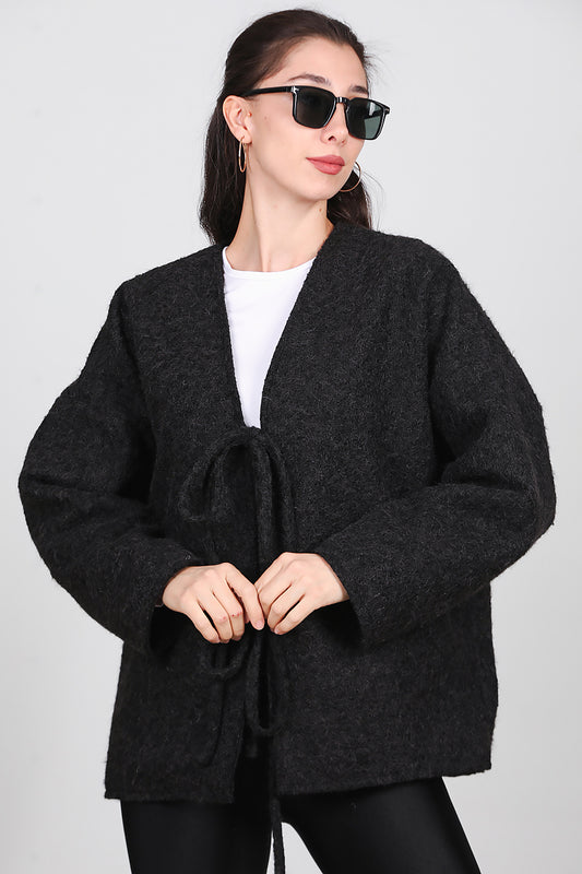 Kadın Ön Bağlama Sakallı Kaşe Hırka Antrasit