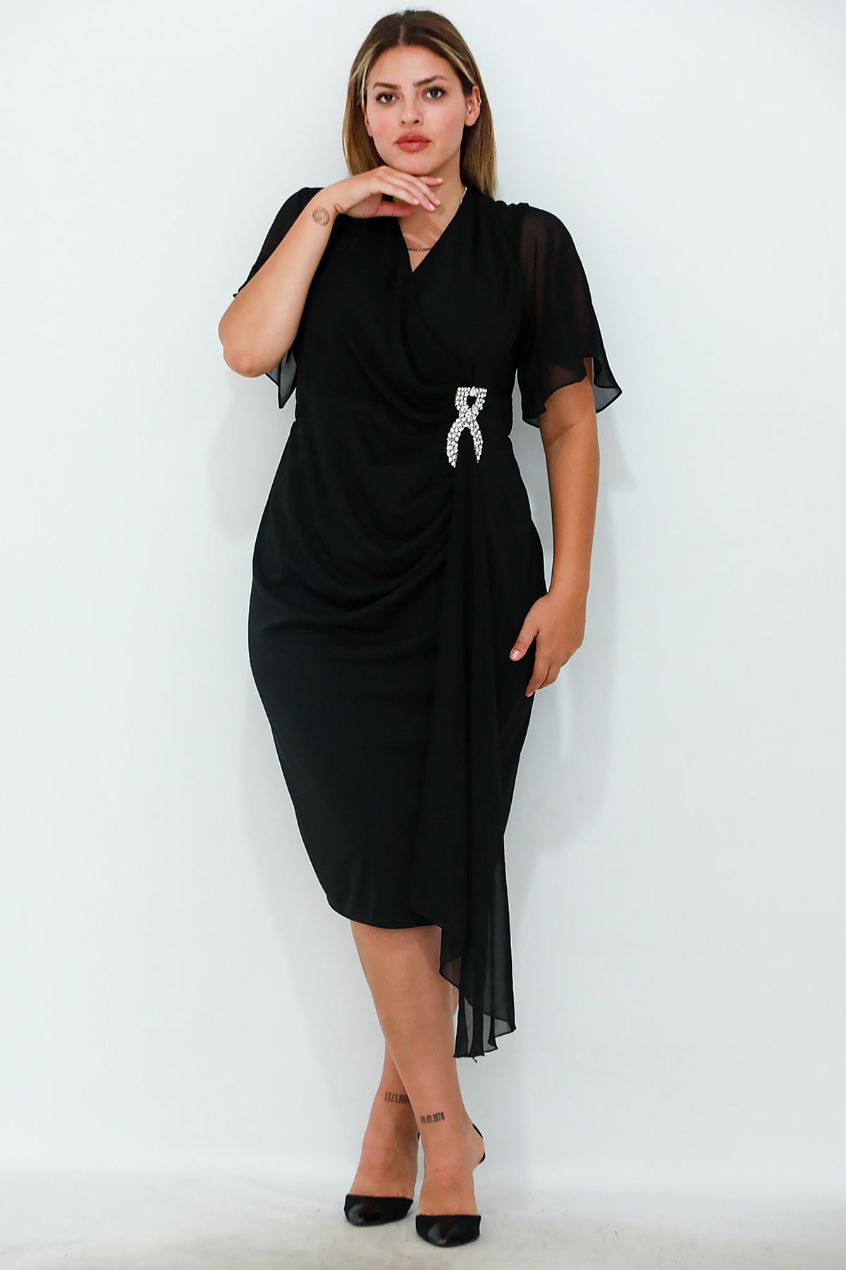Büyük Beden Bel Aksesuar Şifon Kısa Abiye Siyah