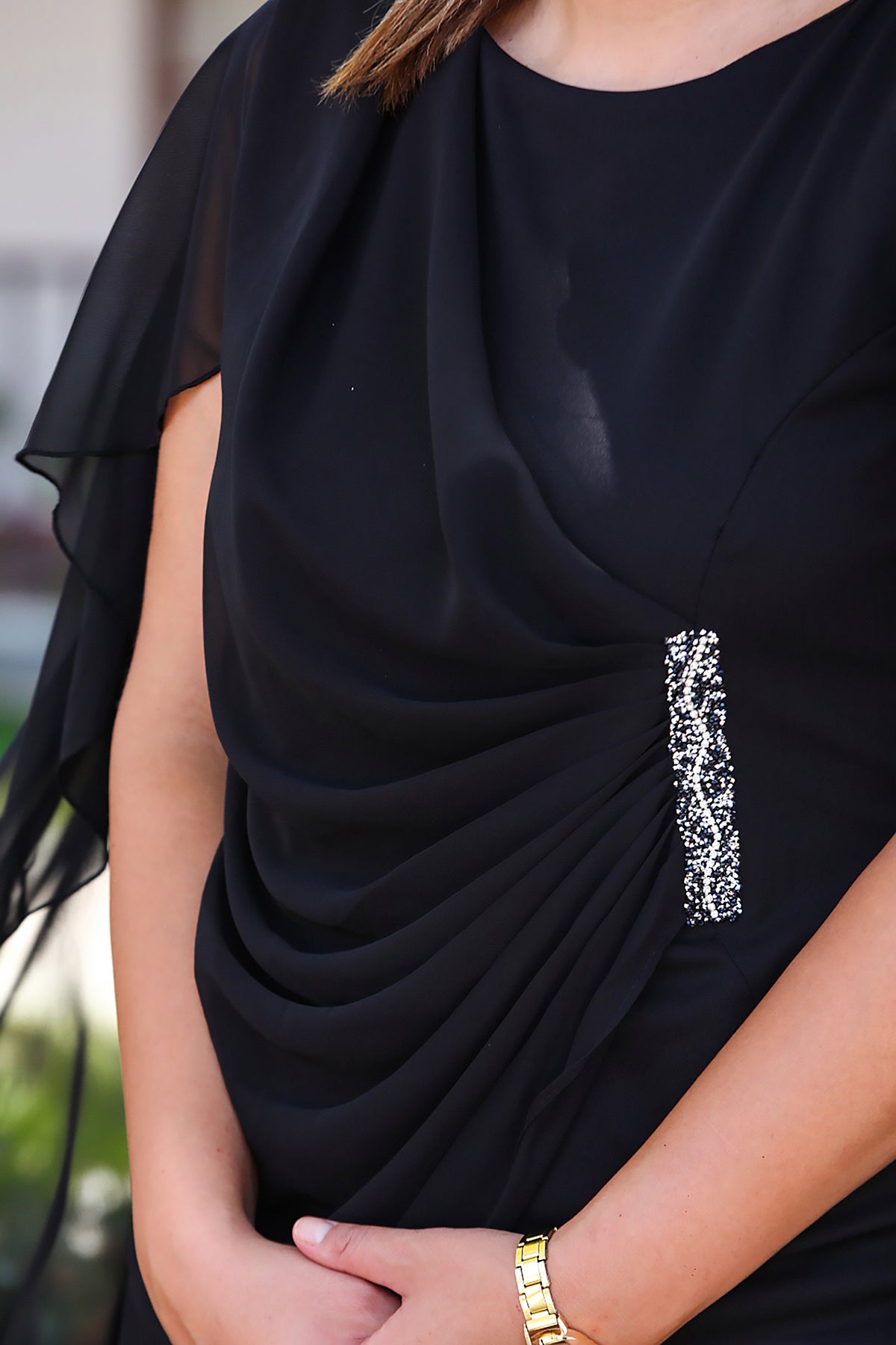 Büyük Beden Bel Aksesuarlı Üzeri Şifon Kısa Abiye Siyah