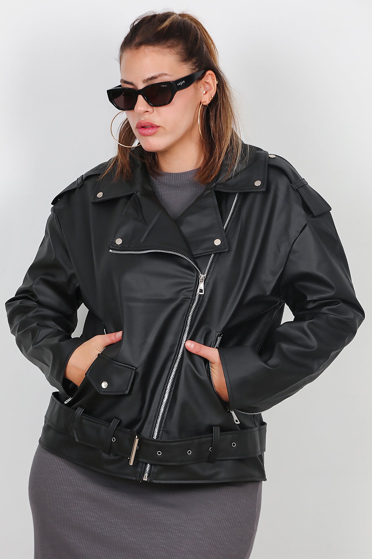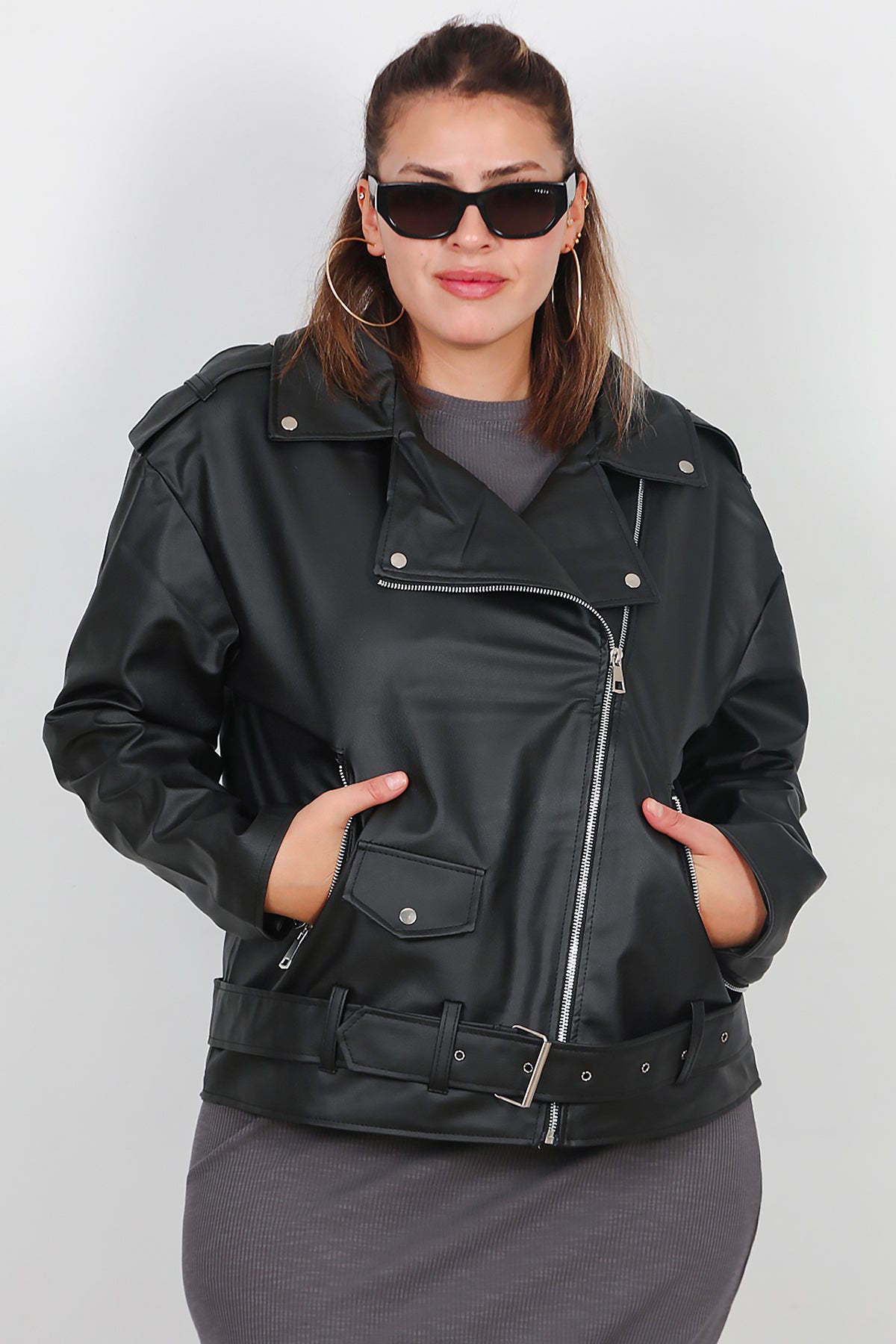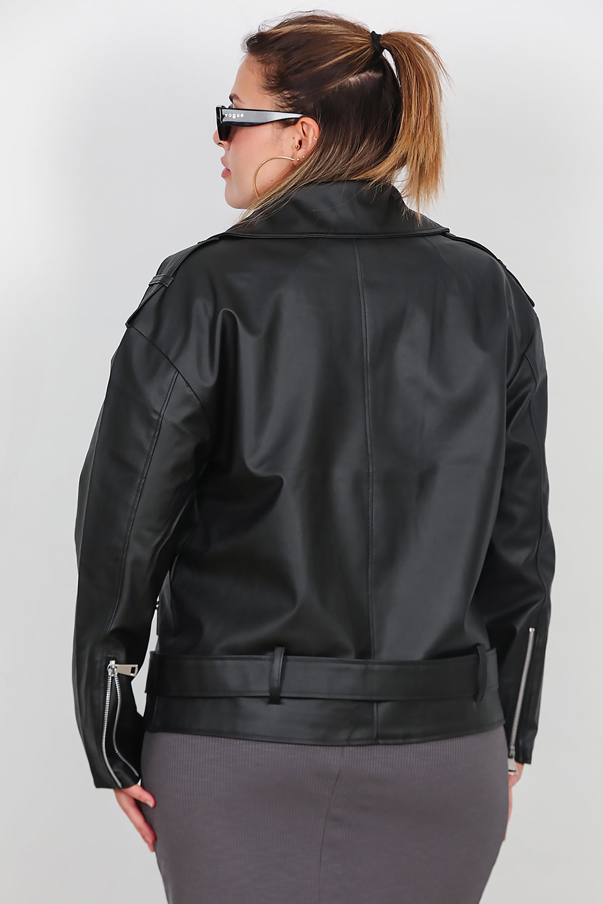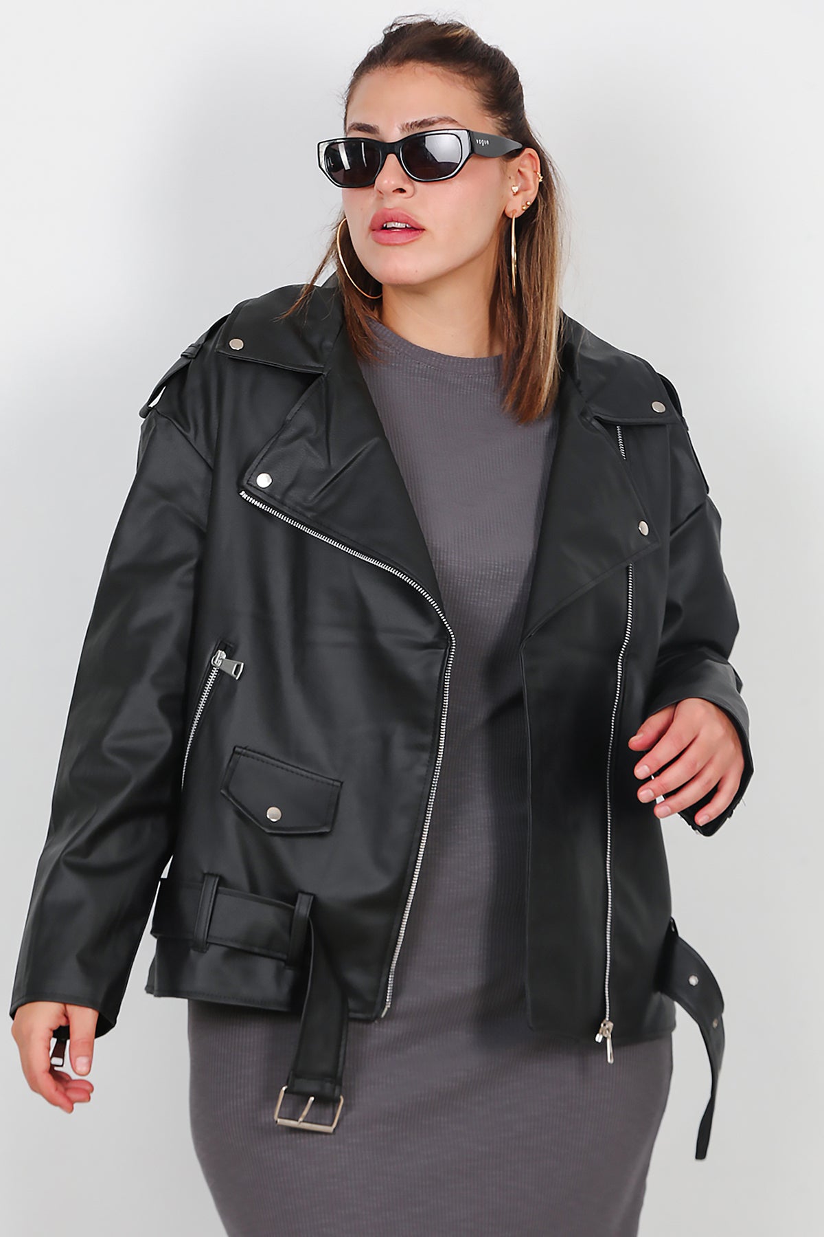 Büyük Beden Bel Kemer Detay Deri Ceket Siyah