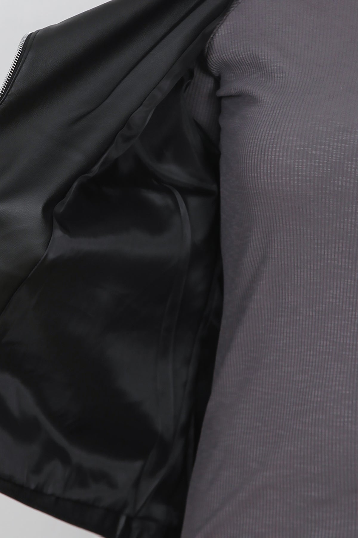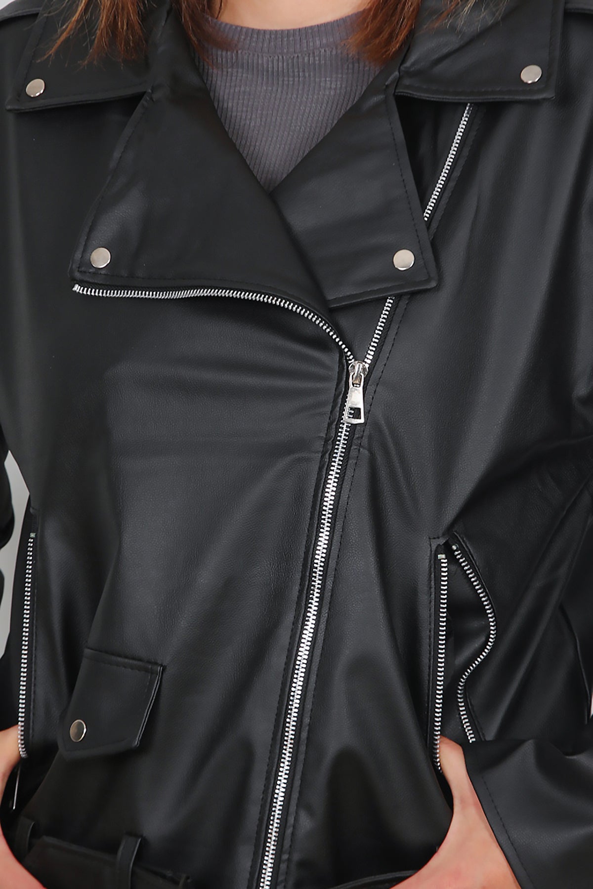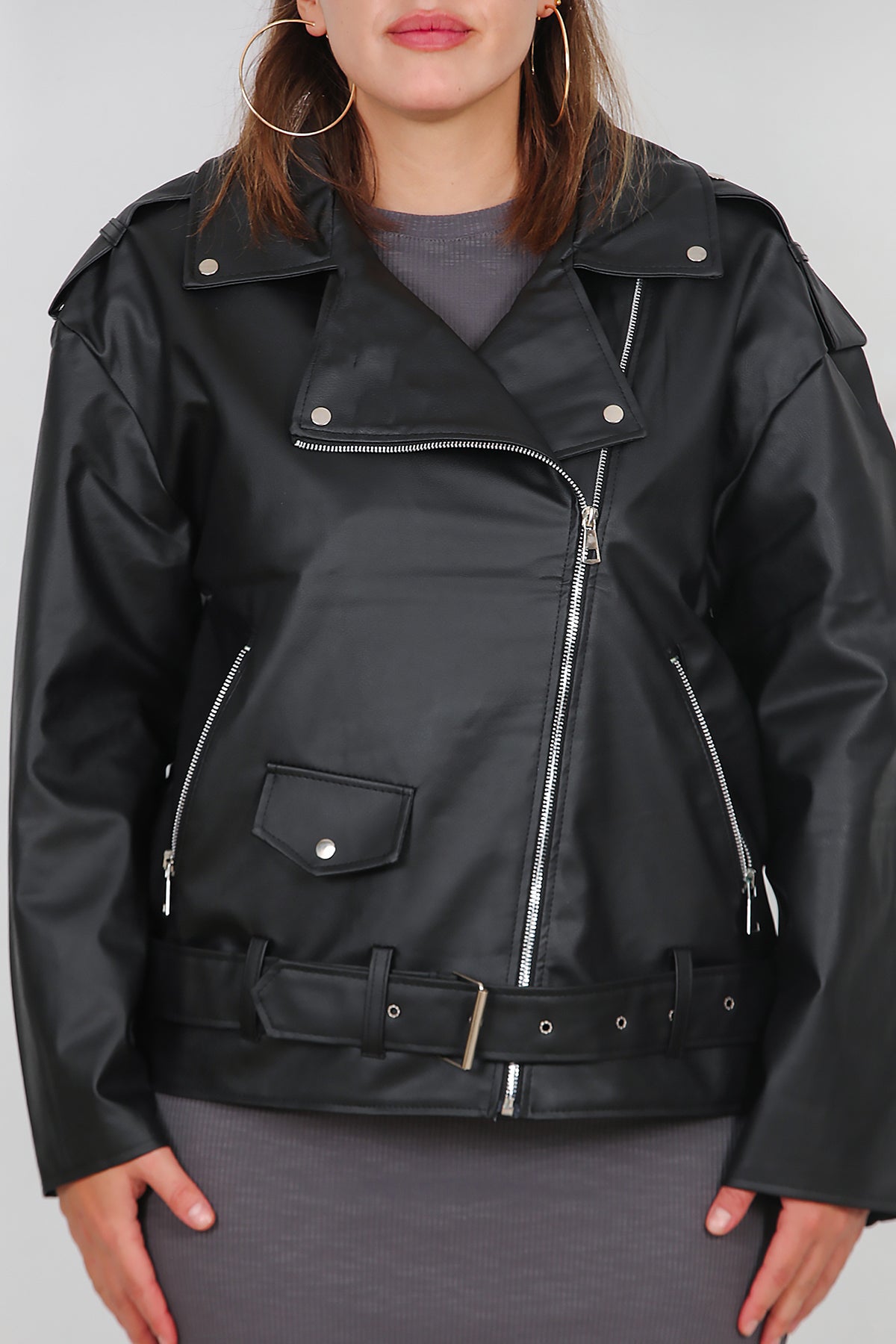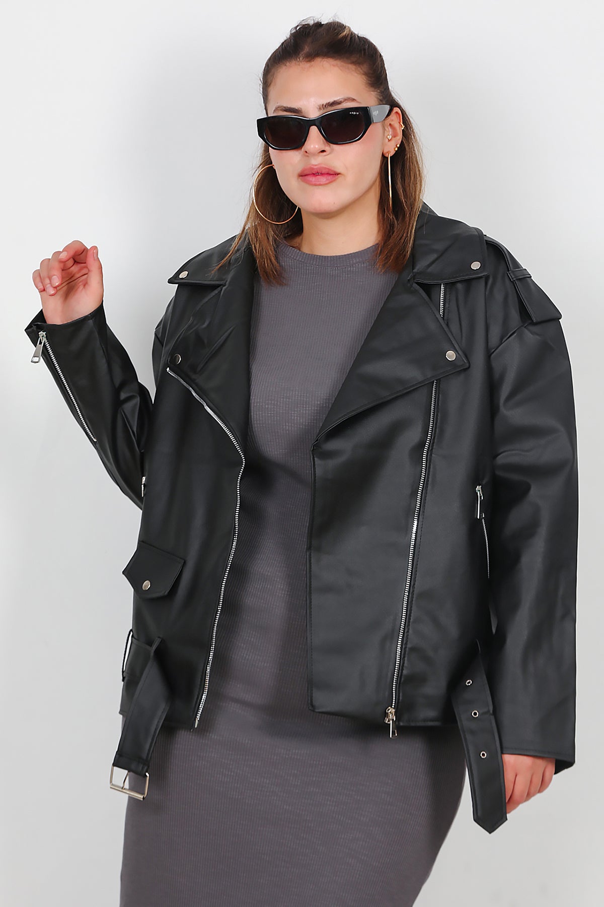 Büyük Beden Bel Kemer Detay Deri Ceket Siyah