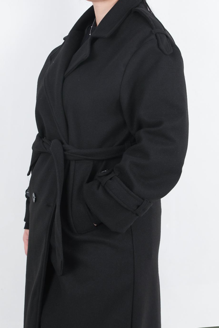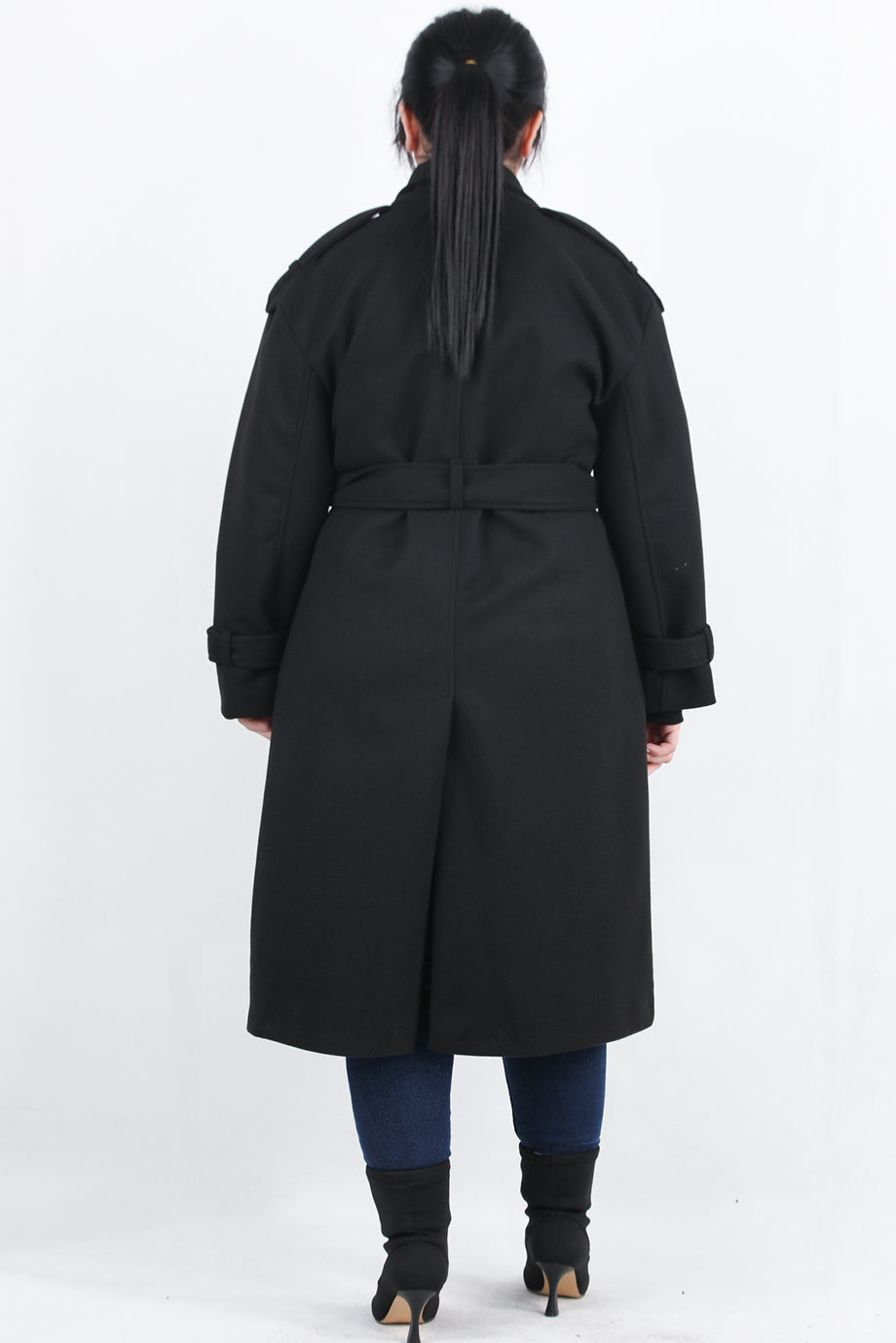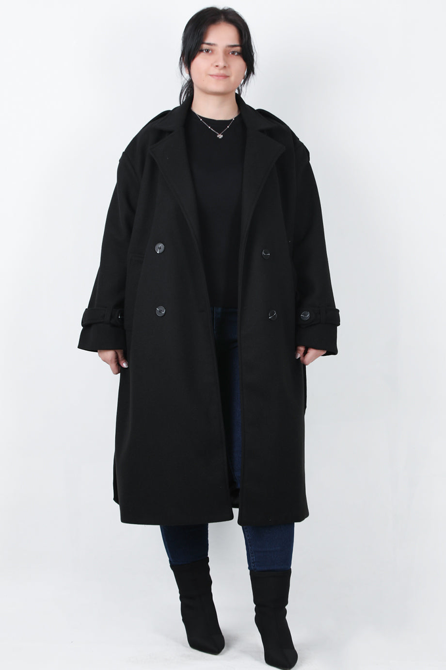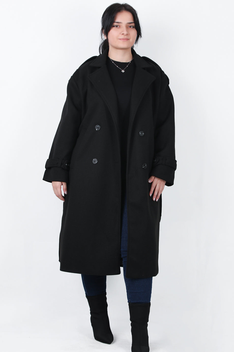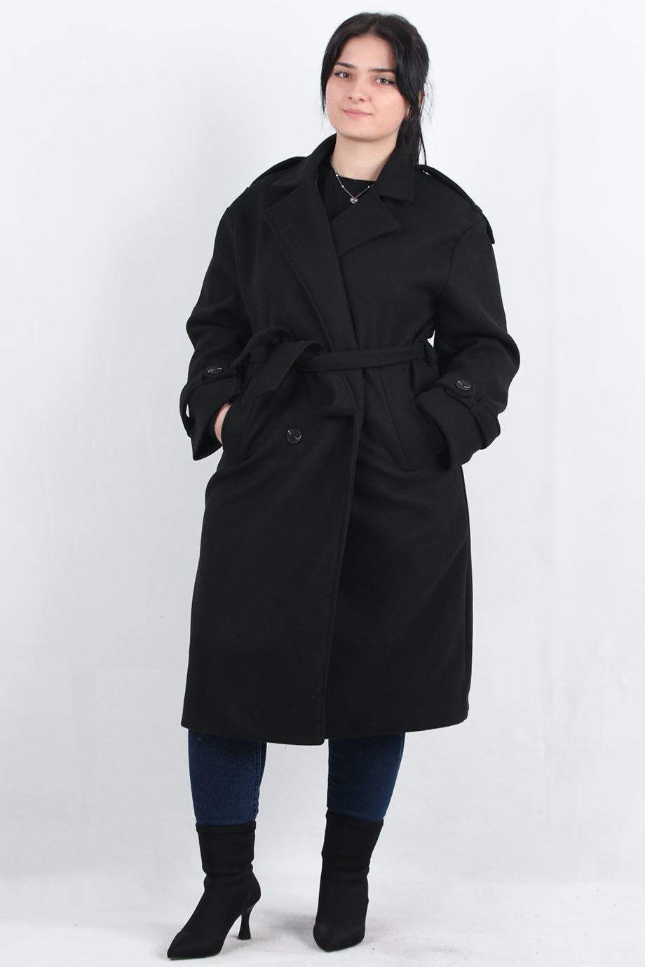 Woolen Büyük Beden Bel Kemerli Kaşe Kaban Siyah