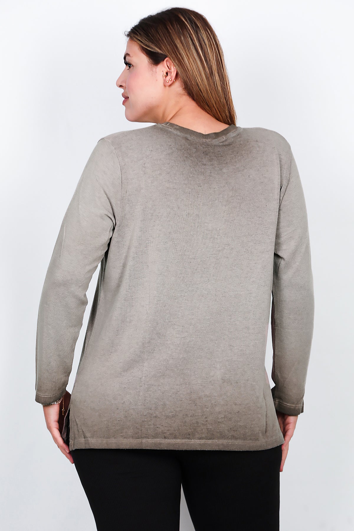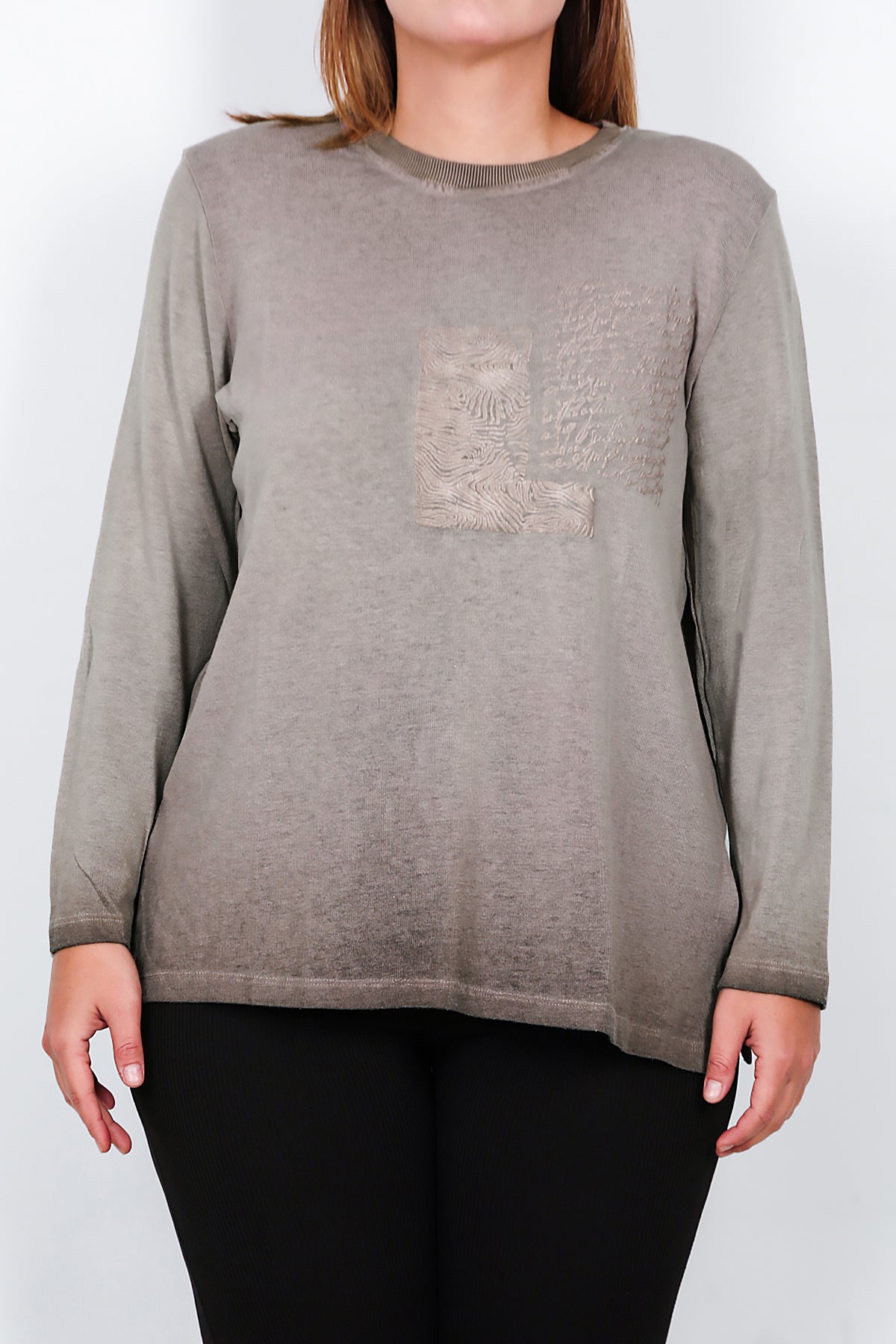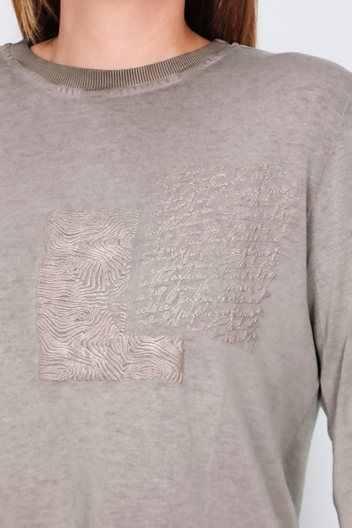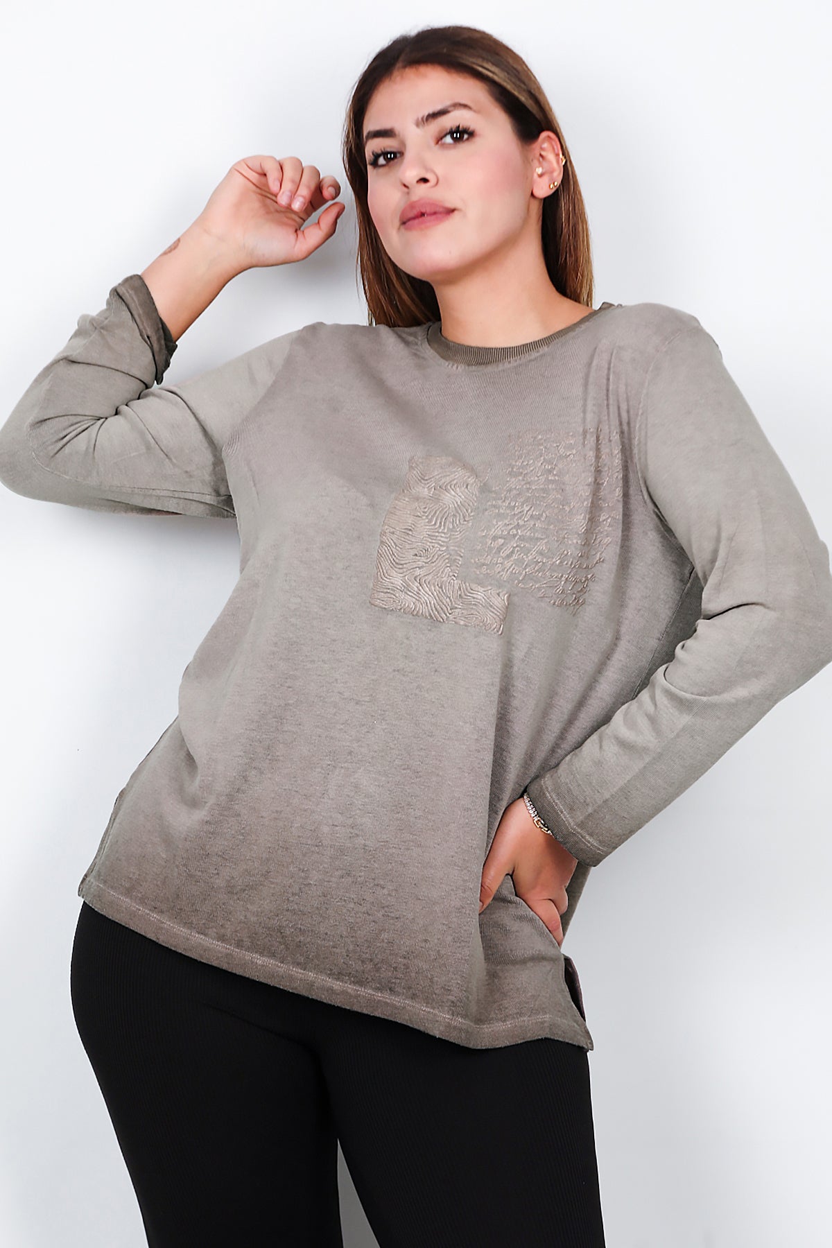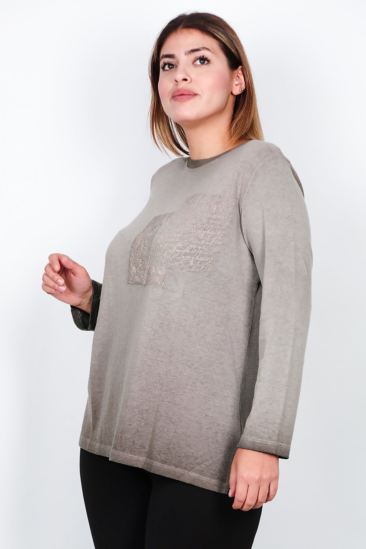 Büyük Beden Bisiklet Yaka Kabartma Yazılı Bluz Vizon