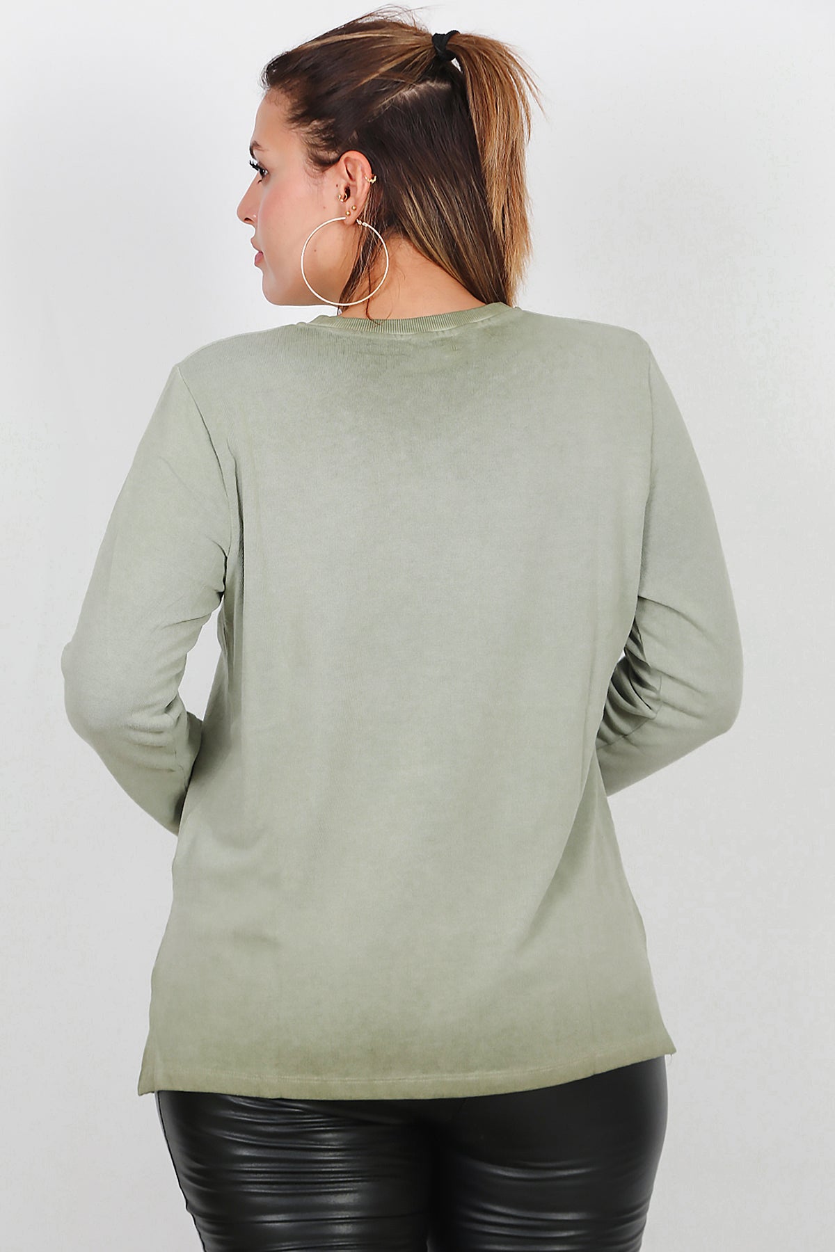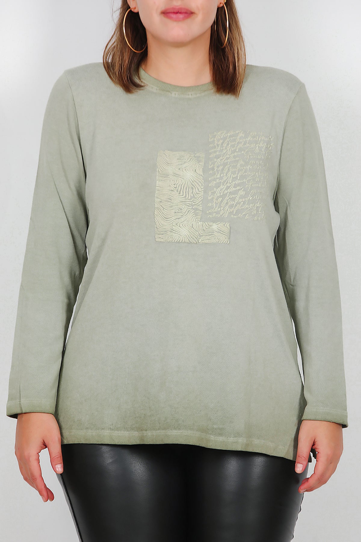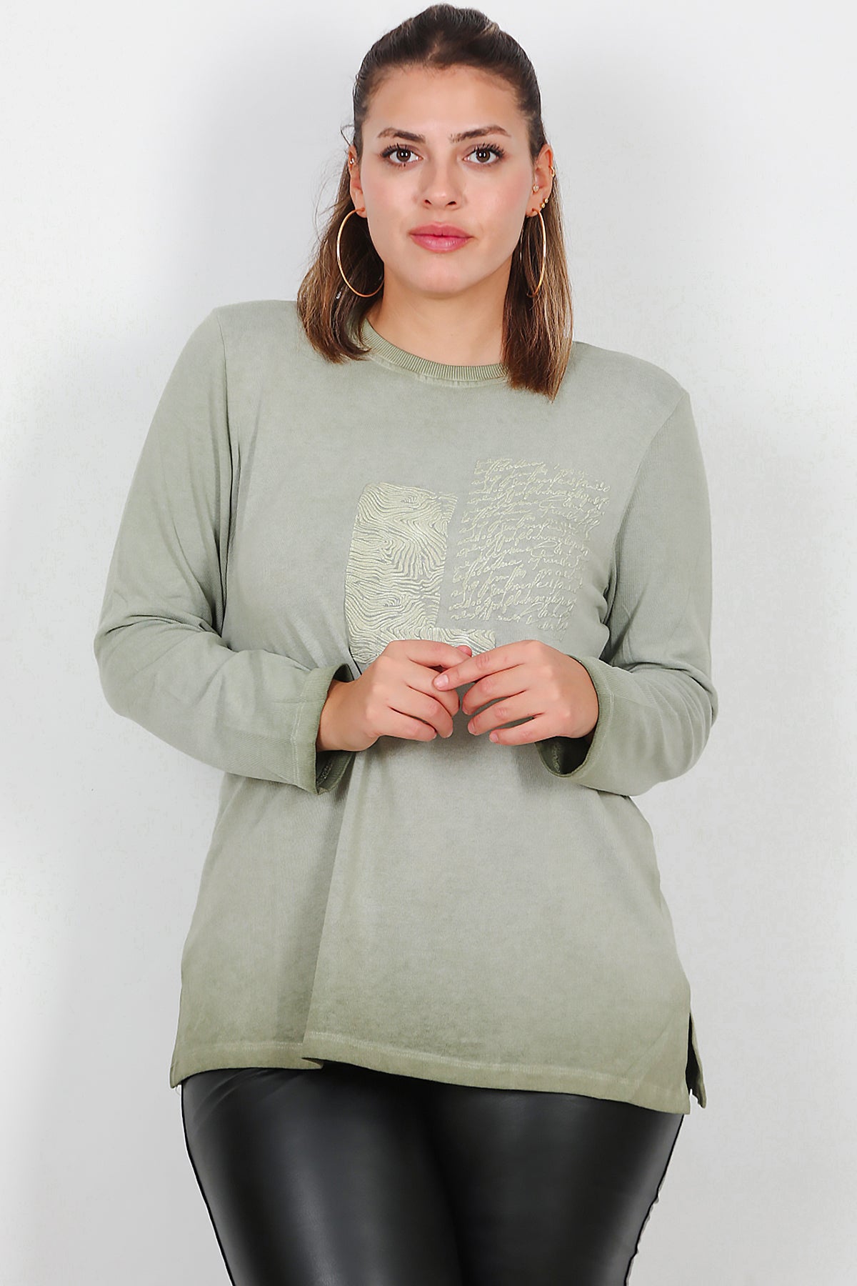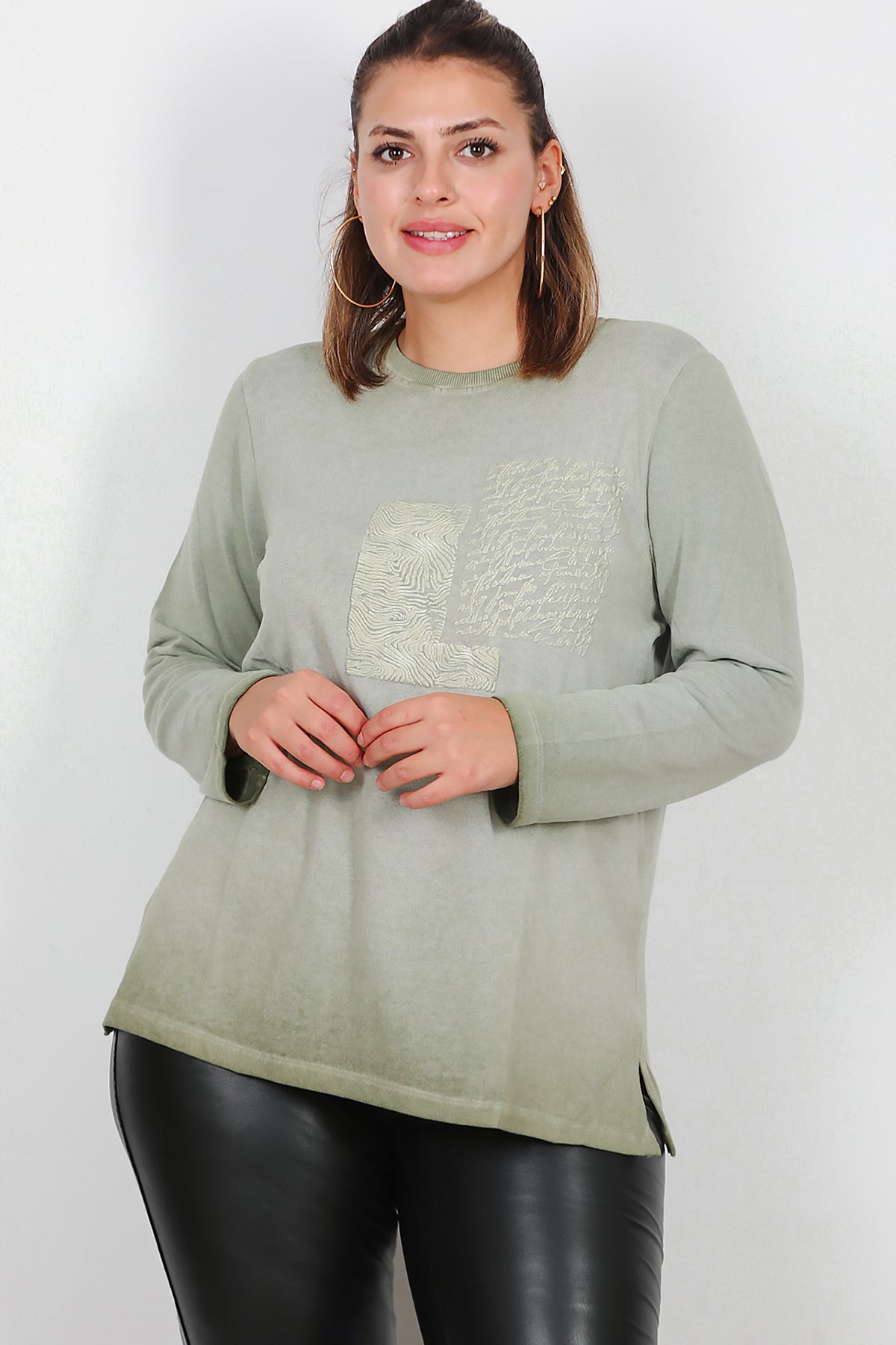Büyük Beden Bisiklet Yaka Kabartma Yazılı Bluz Yeşil