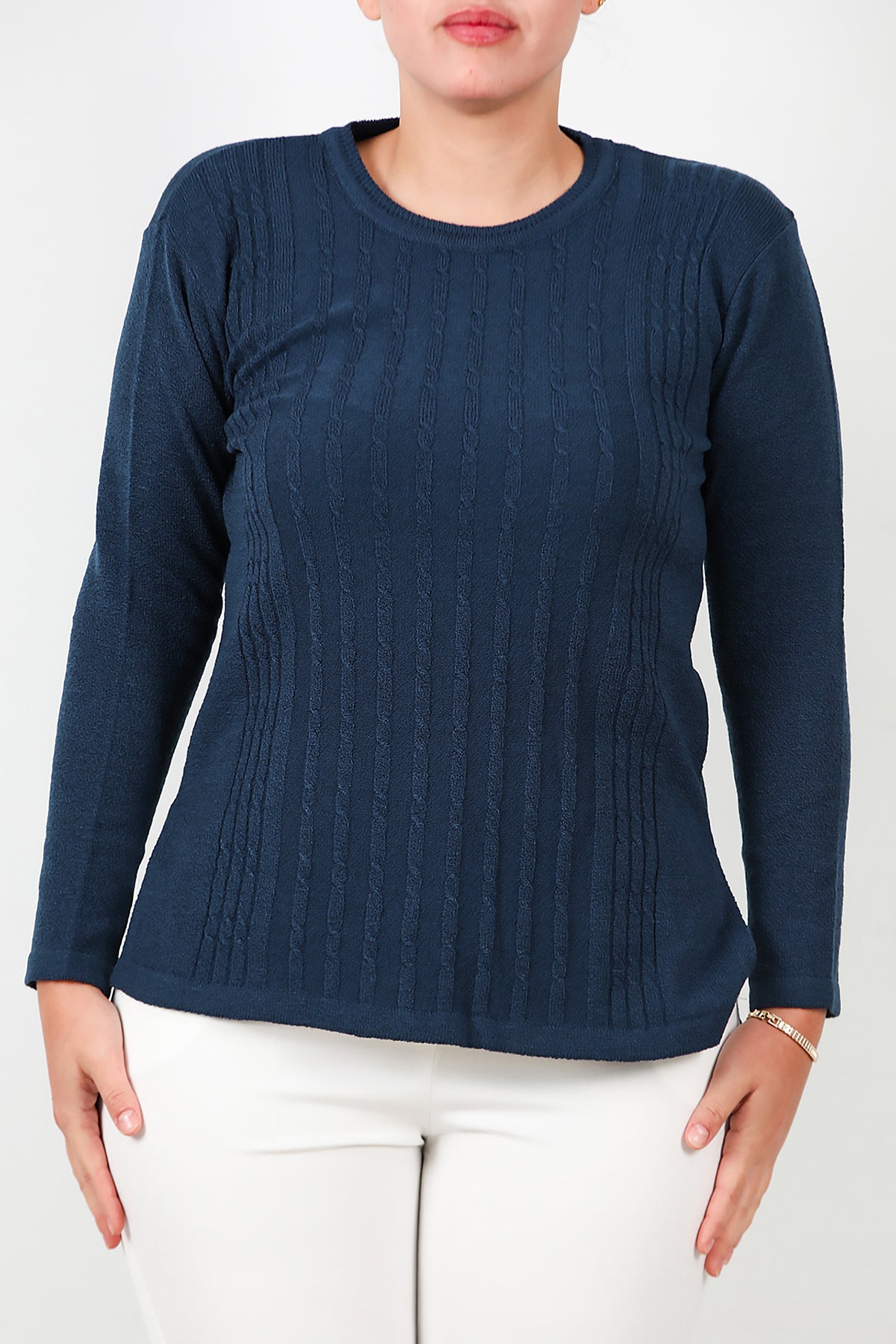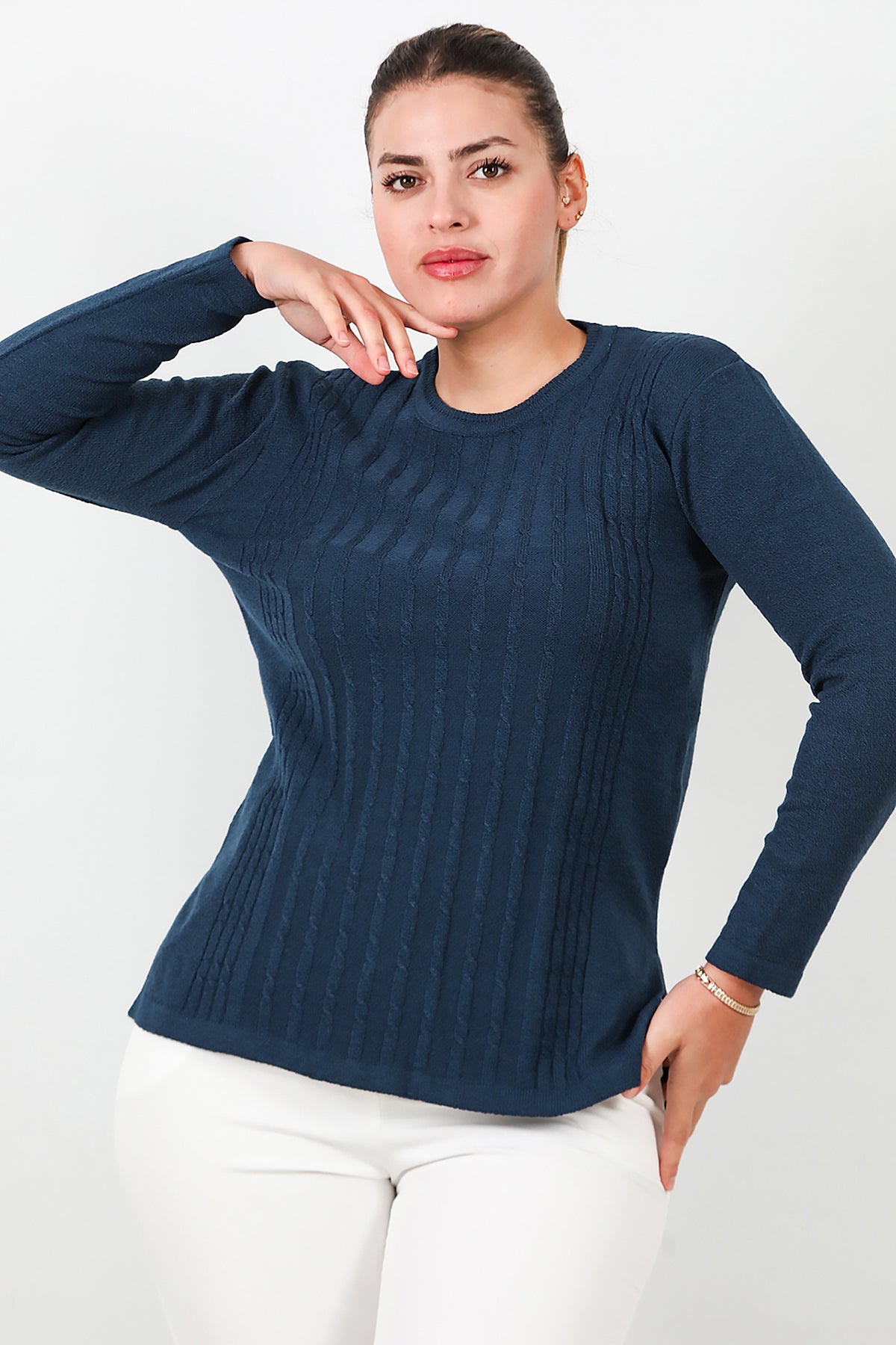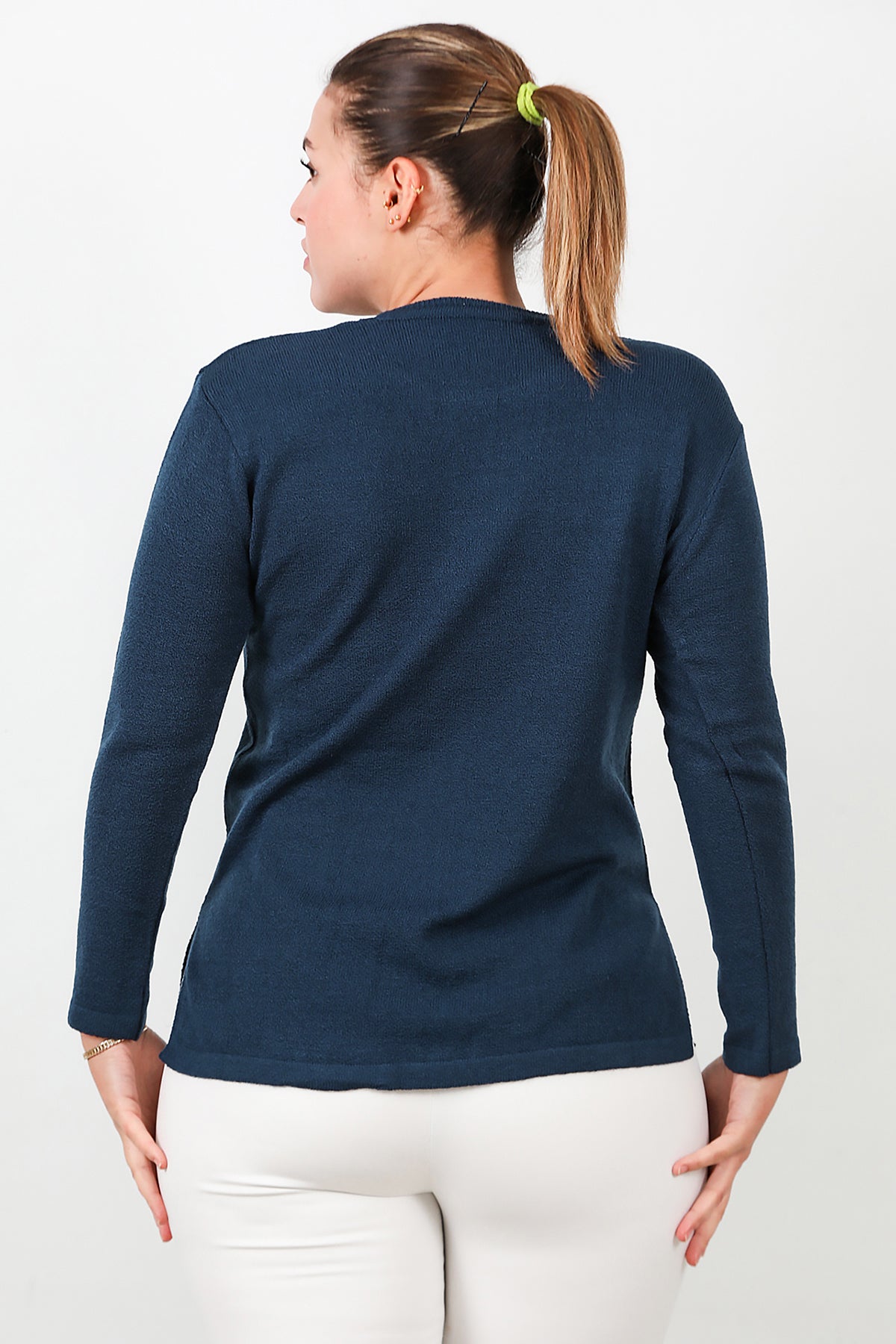 Büyük Beden Bisiklet Yaka Triko Bluz Lacivert