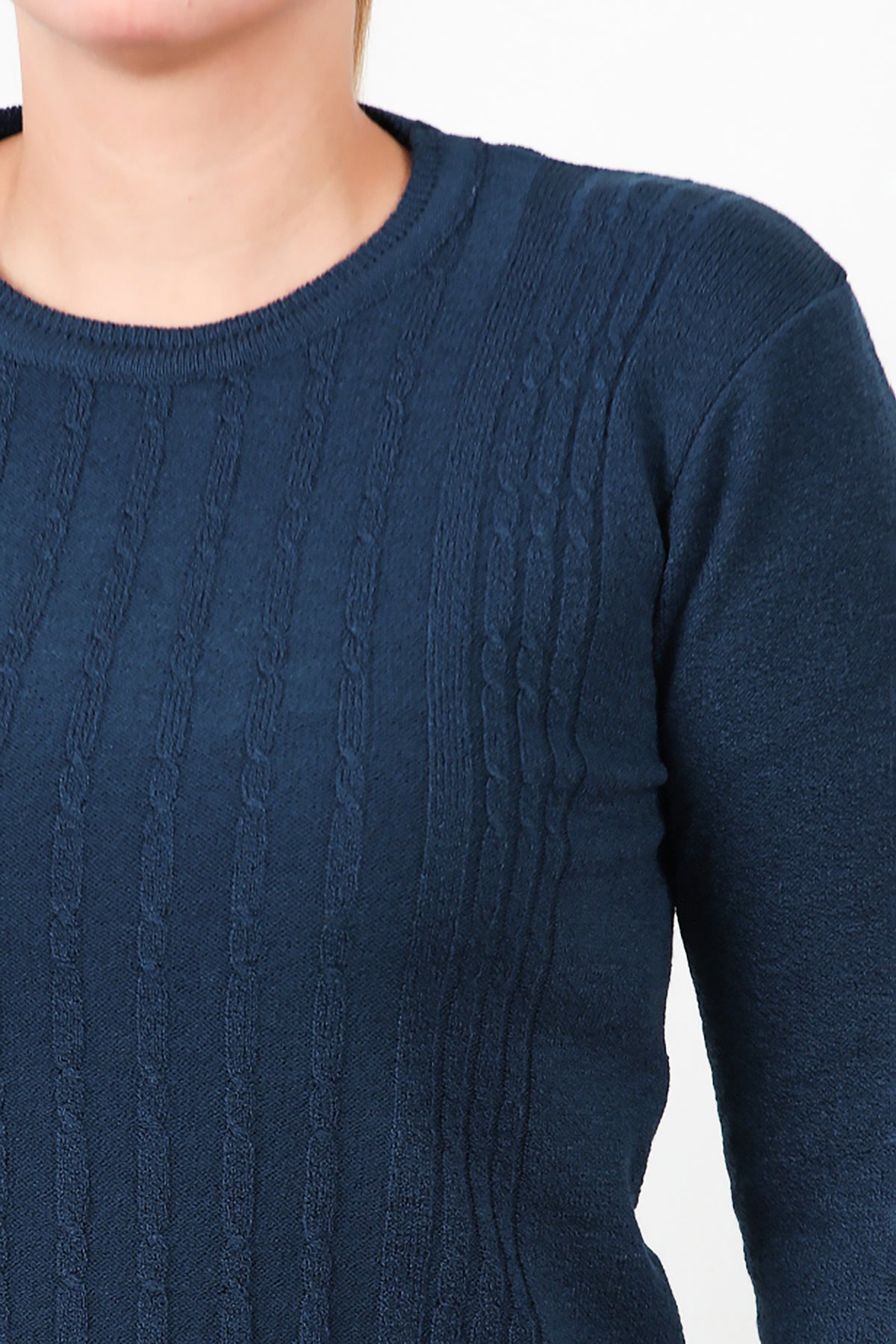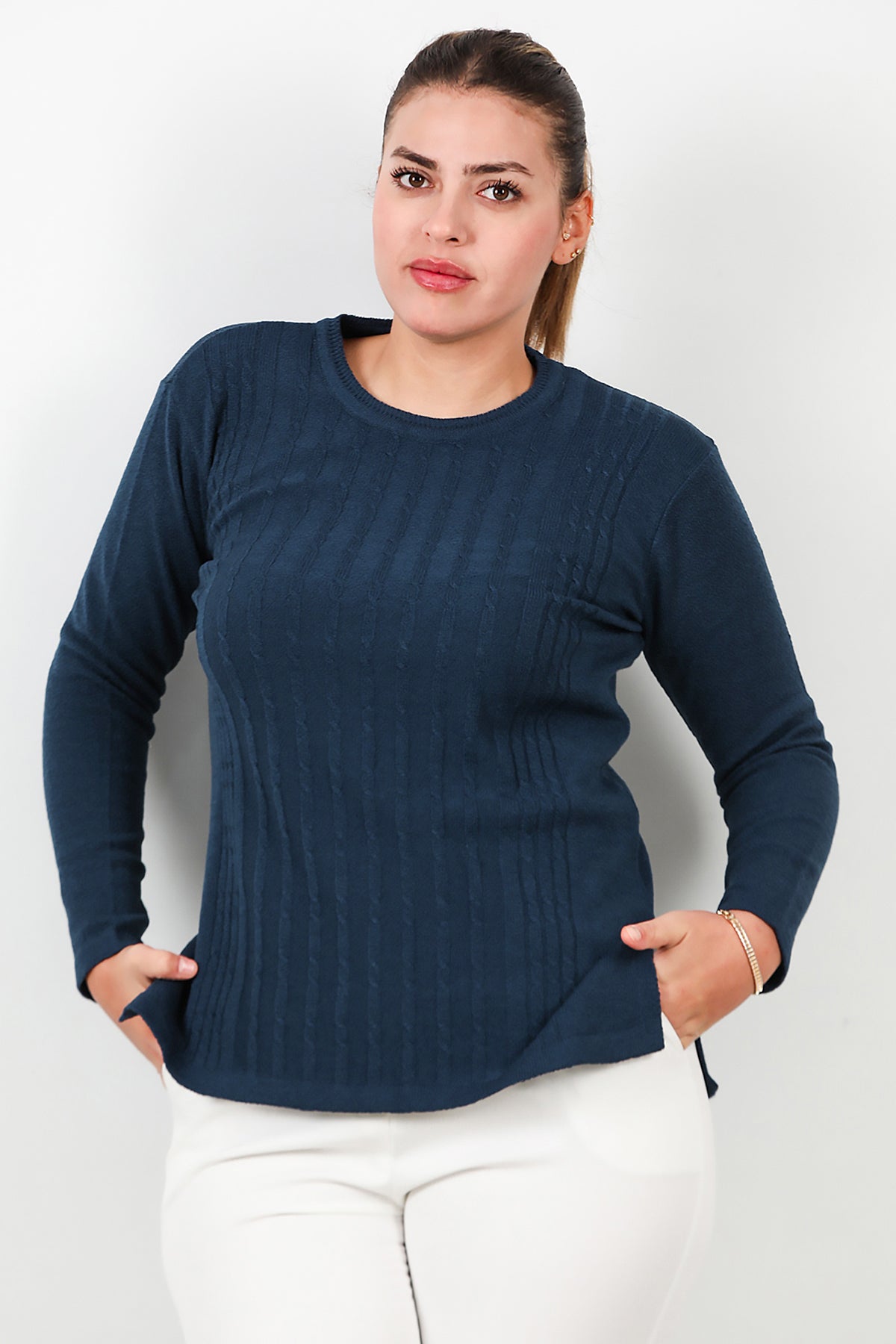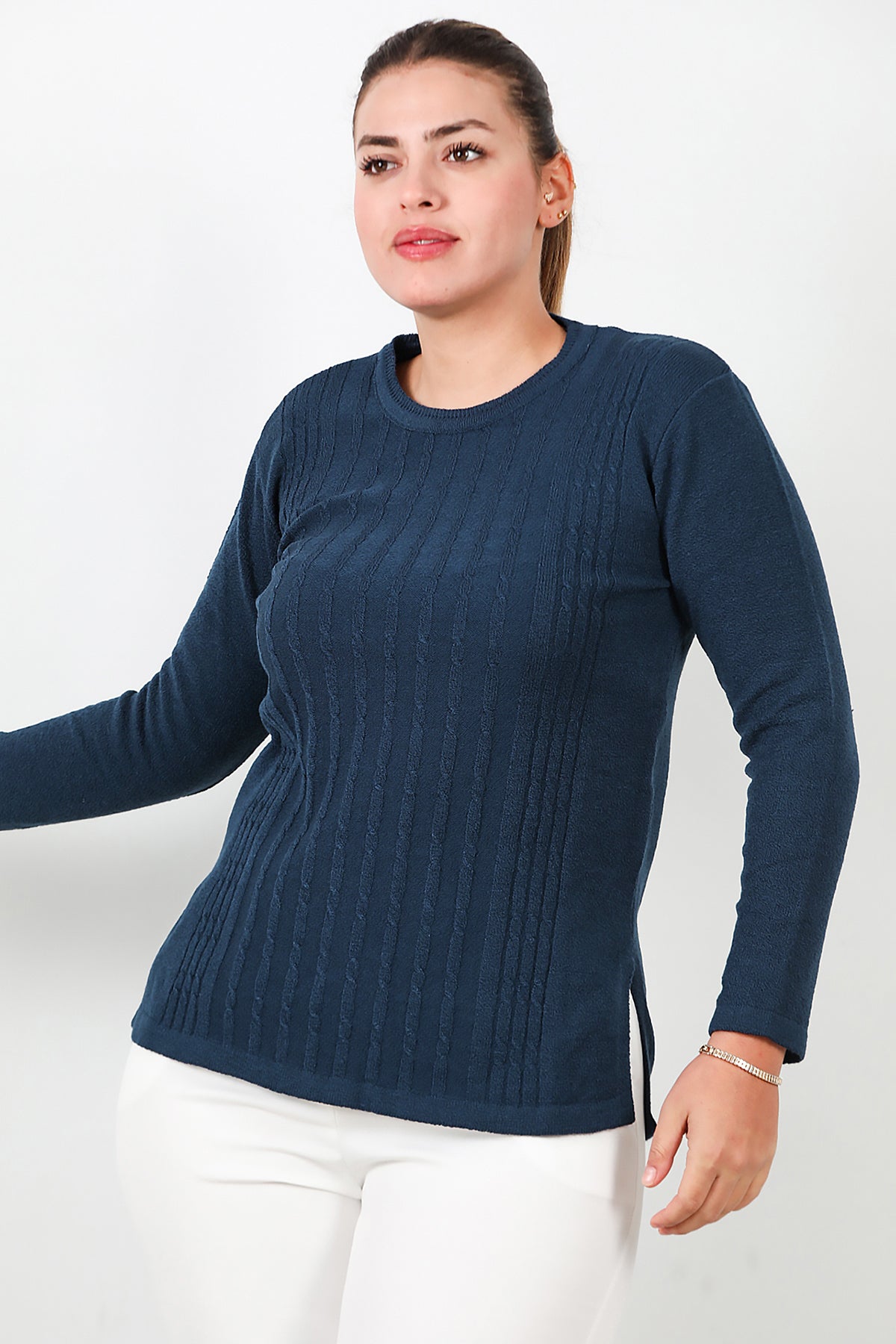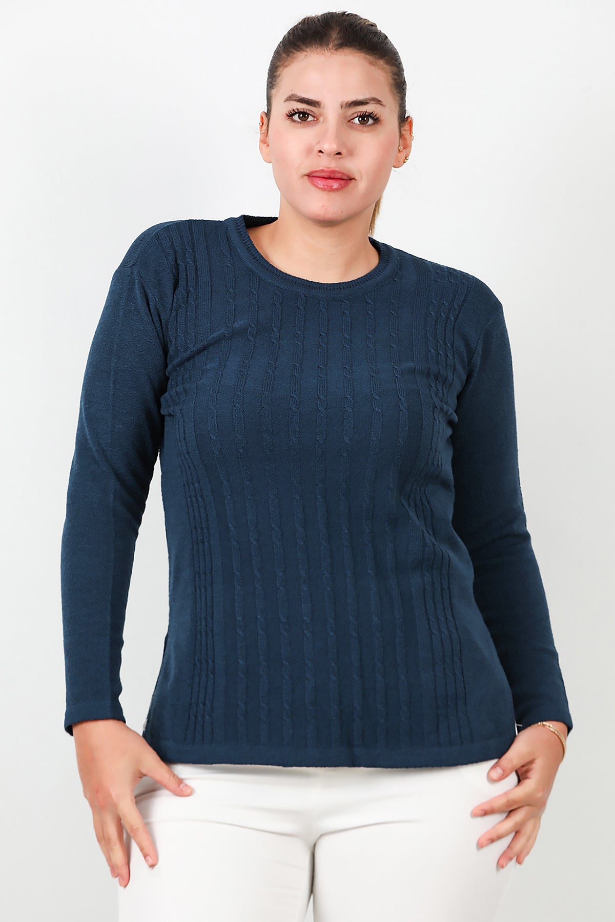Büyük Beden Bisiklet Yaka Triko Bluz Lacivert