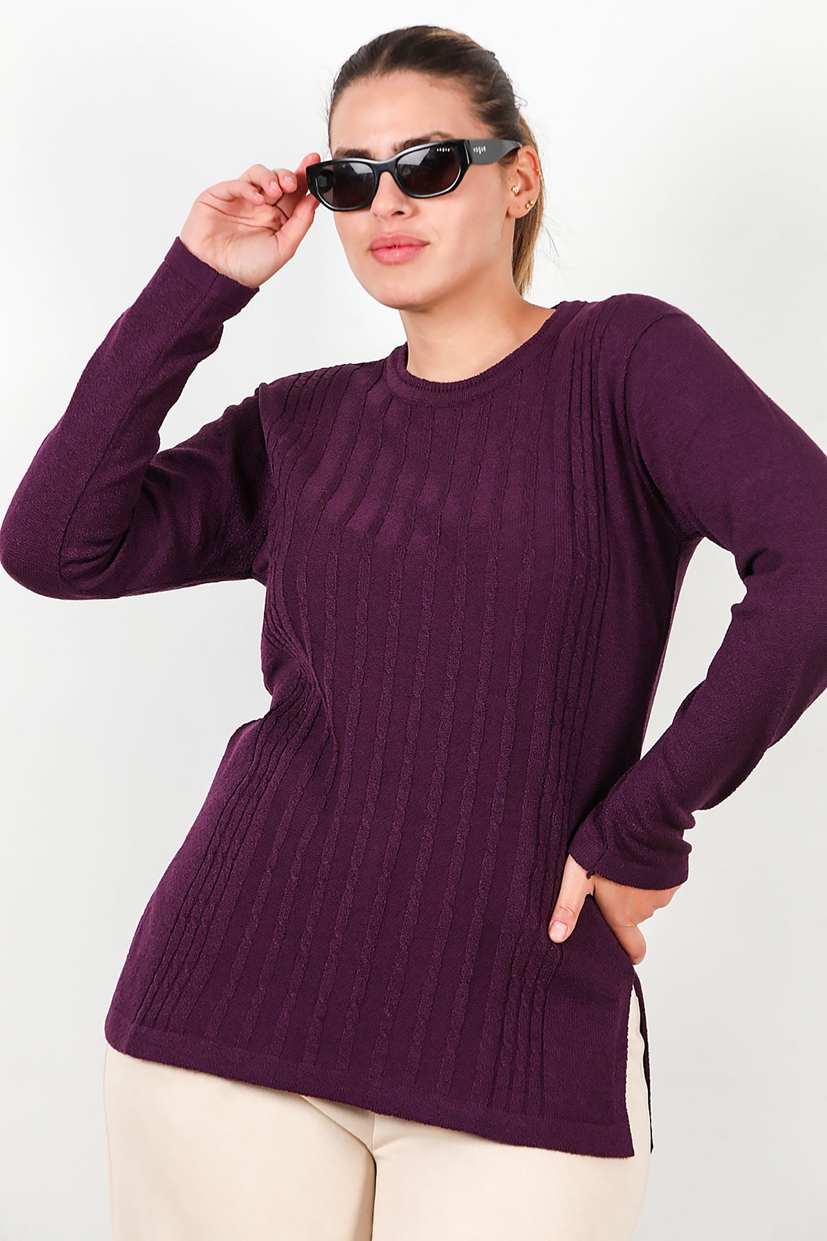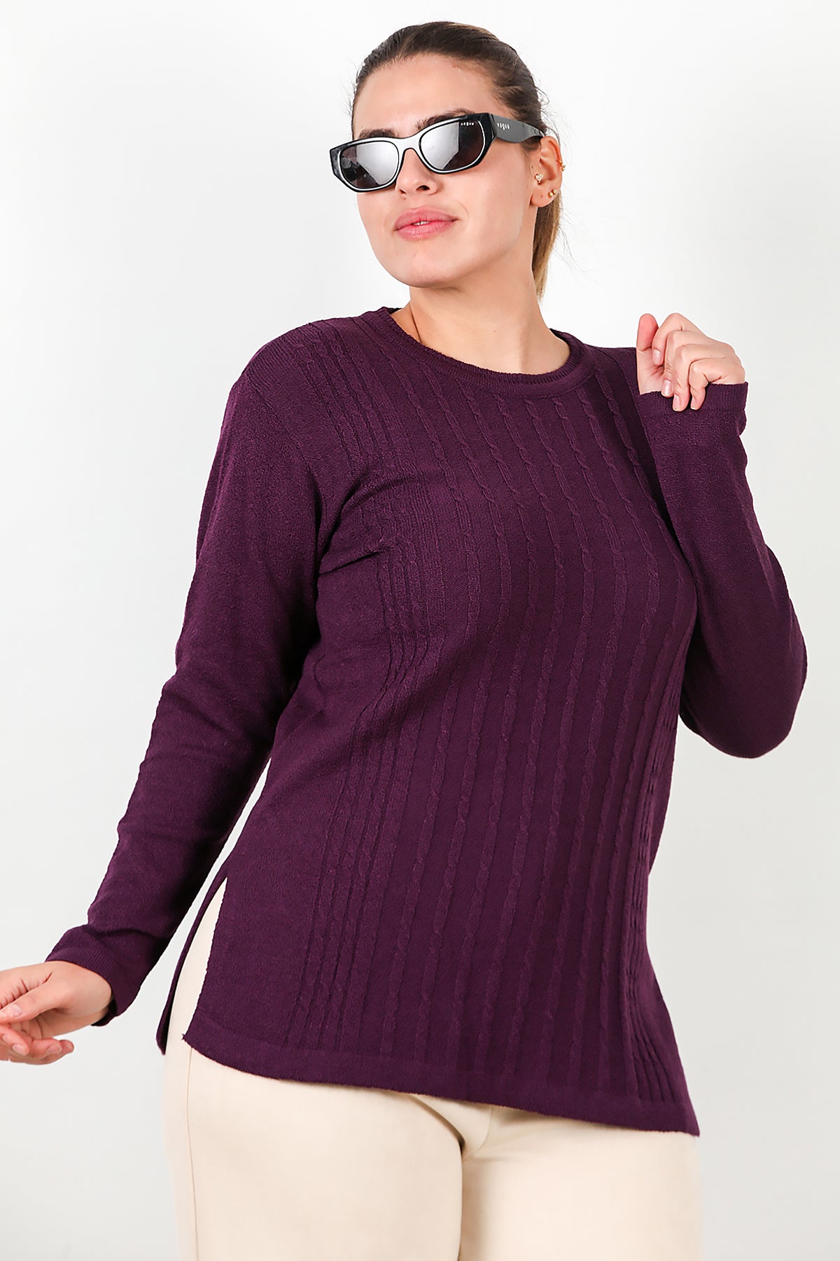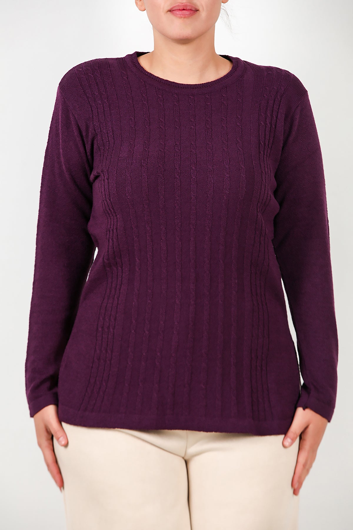 Büyük Beden Bisiklet Yaka Triko Bluz Mor