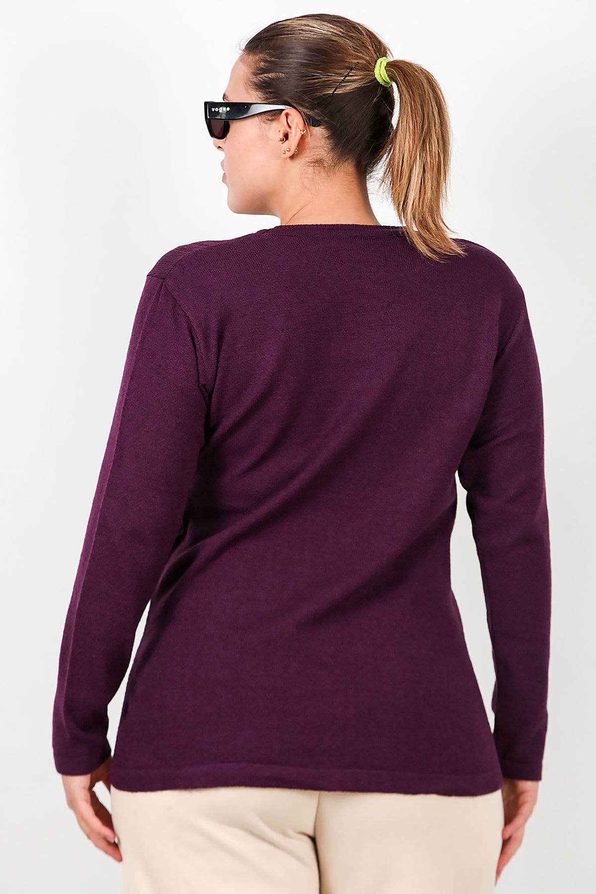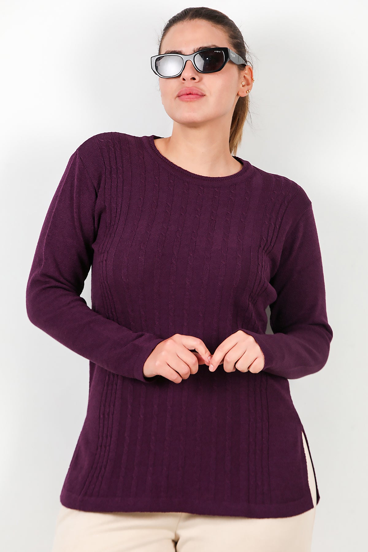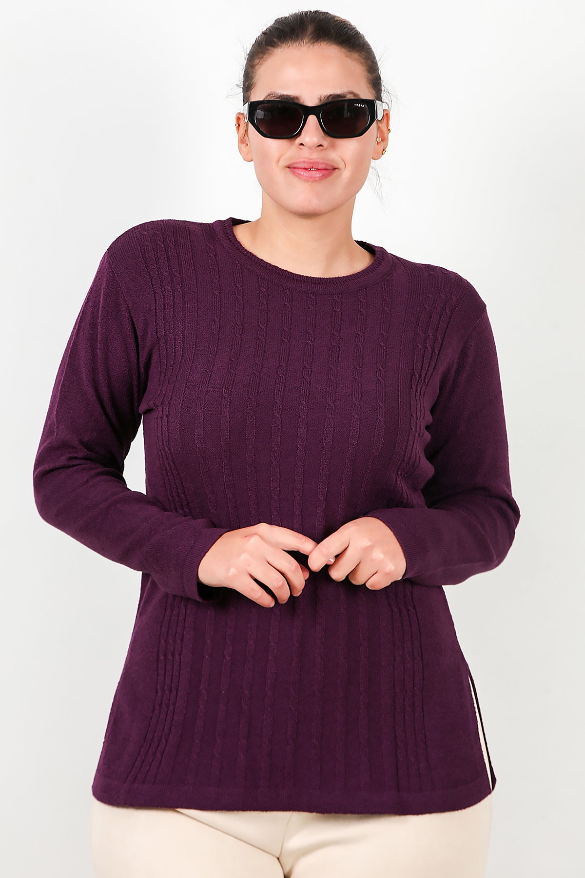 Büyük Beden Bisiklet Yaka Triko Bluz Mor