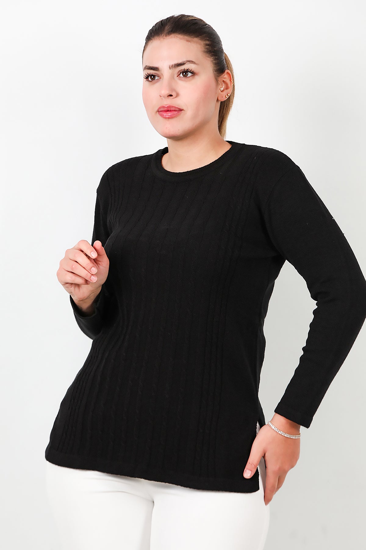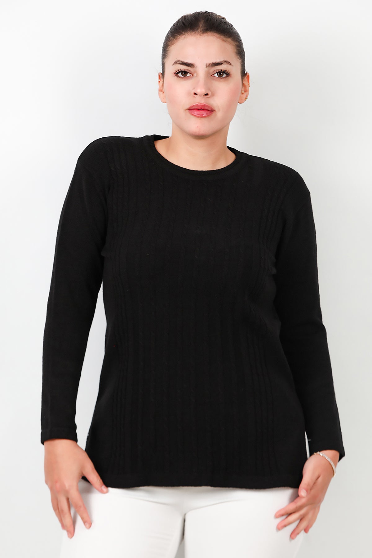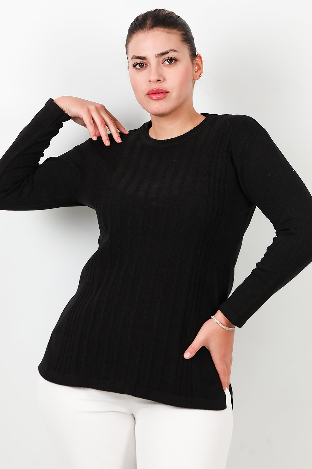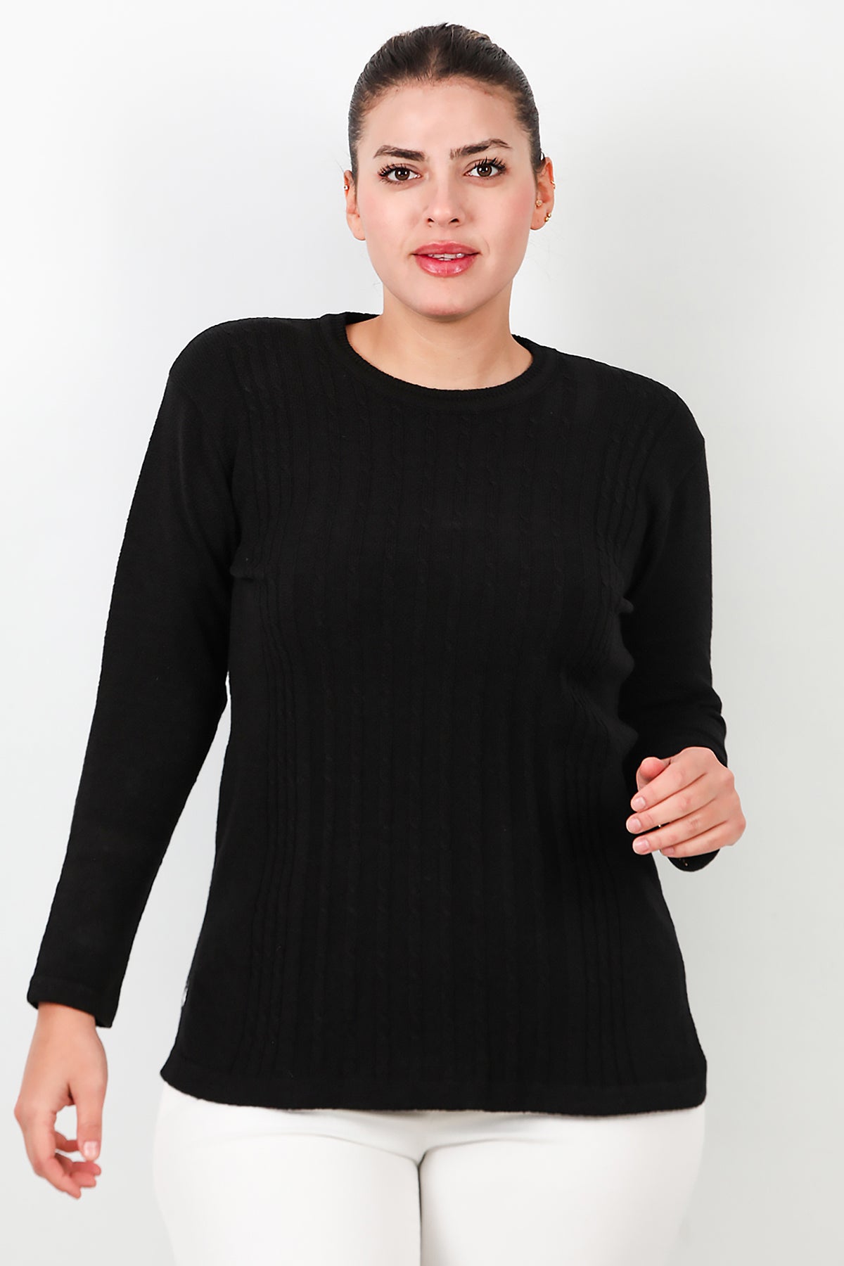 Büyük Beden Bisiklet Yaka Triko Bluz Siyah