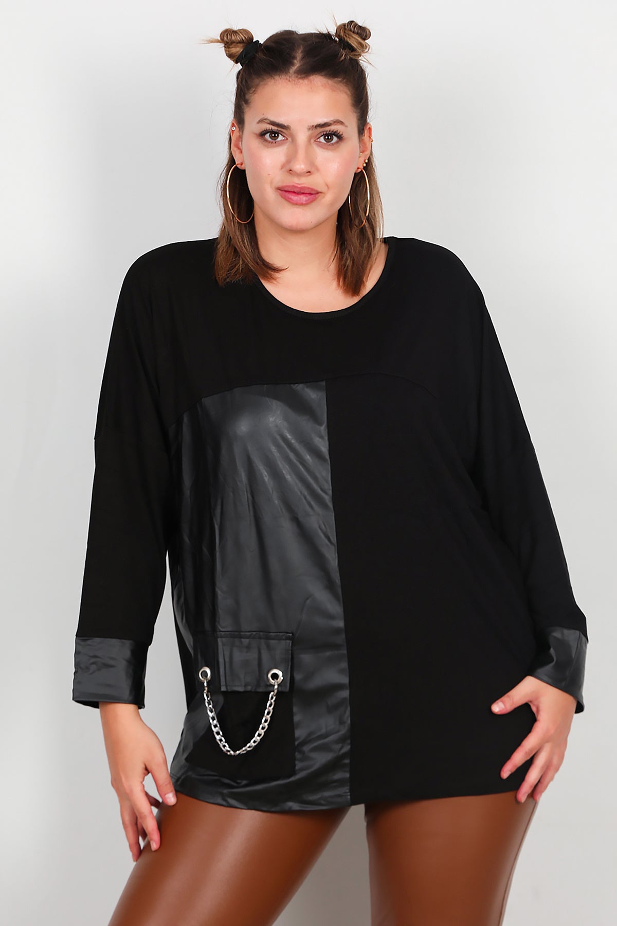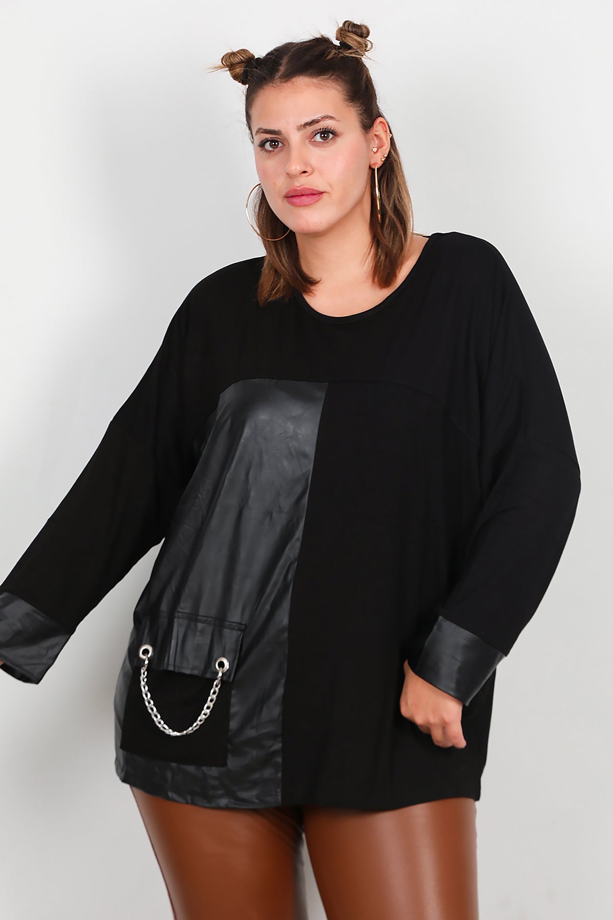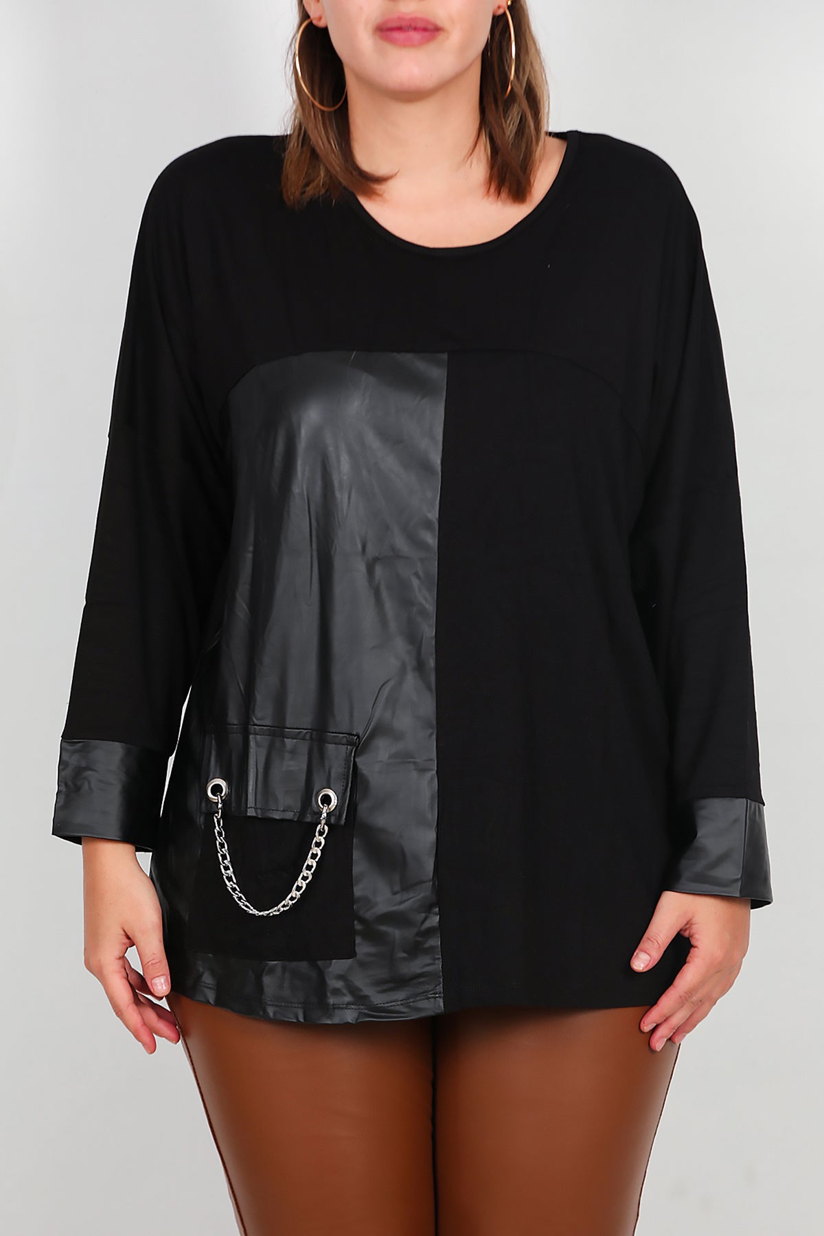 Büyük Beden Deri Detay Bluz Siyah