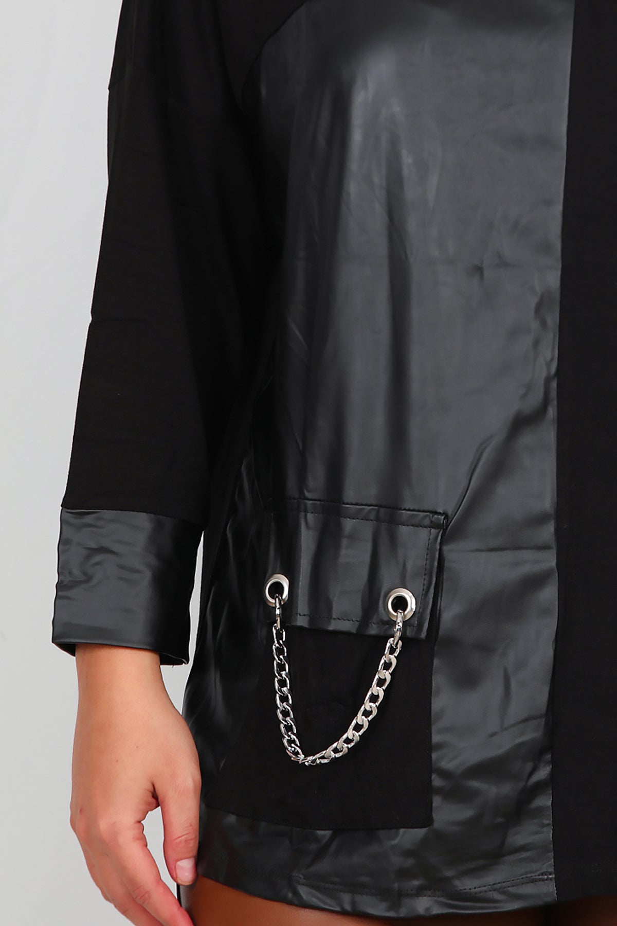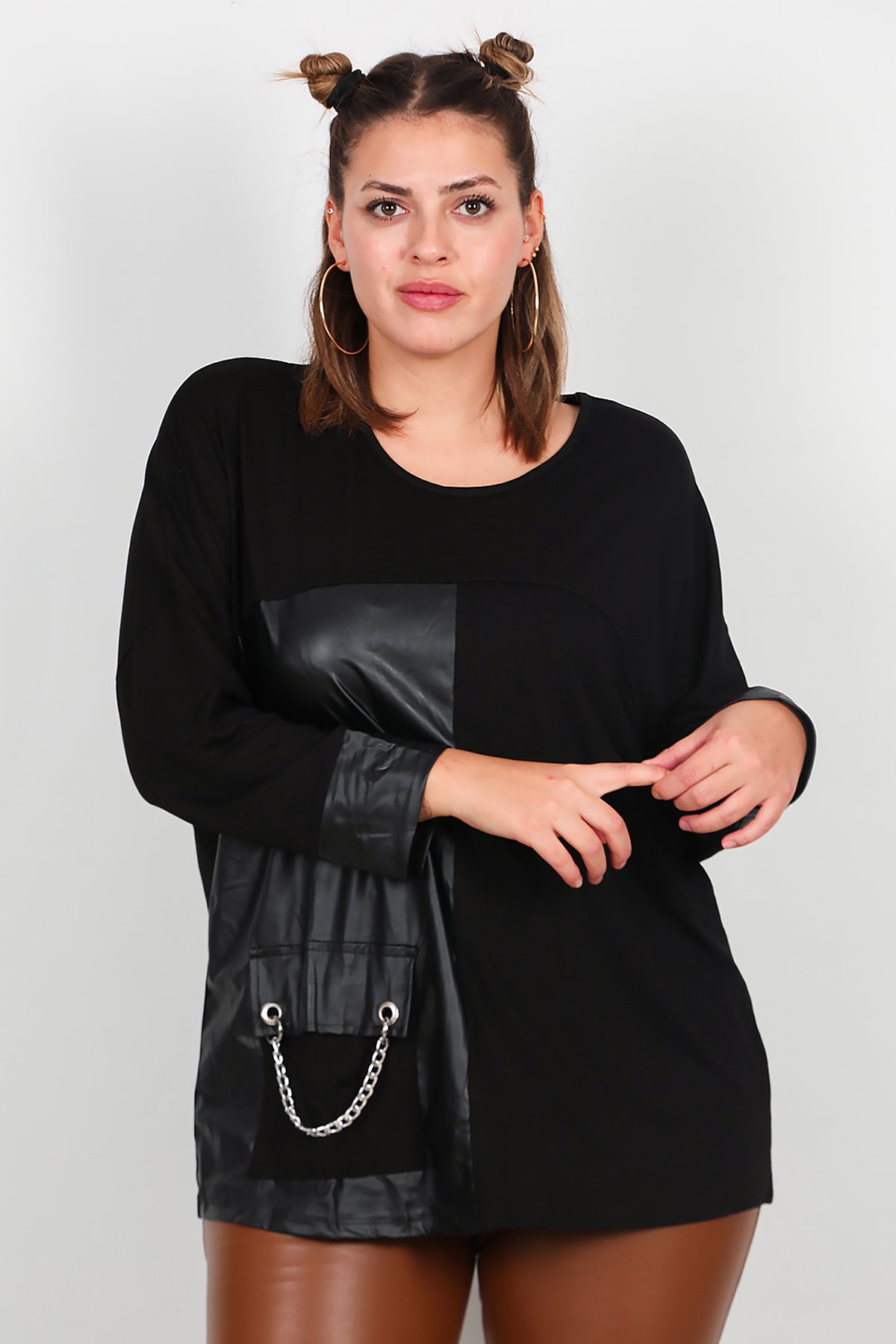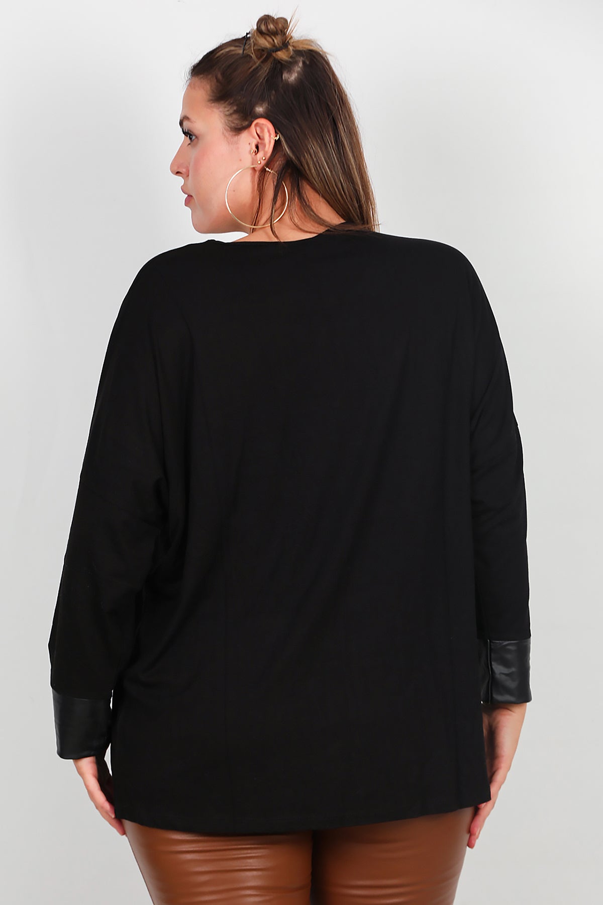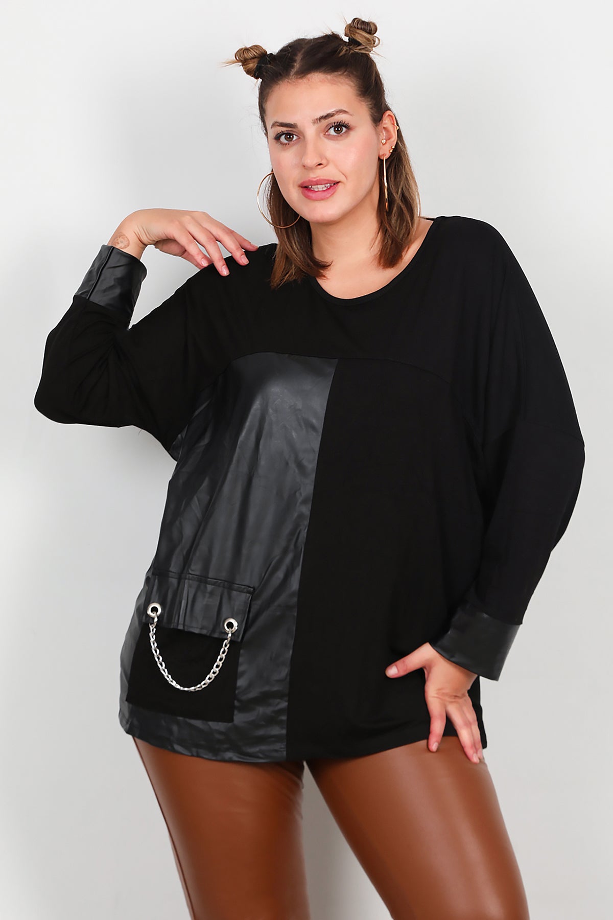 Büyük Beden Deri Detay Bluz Siyah