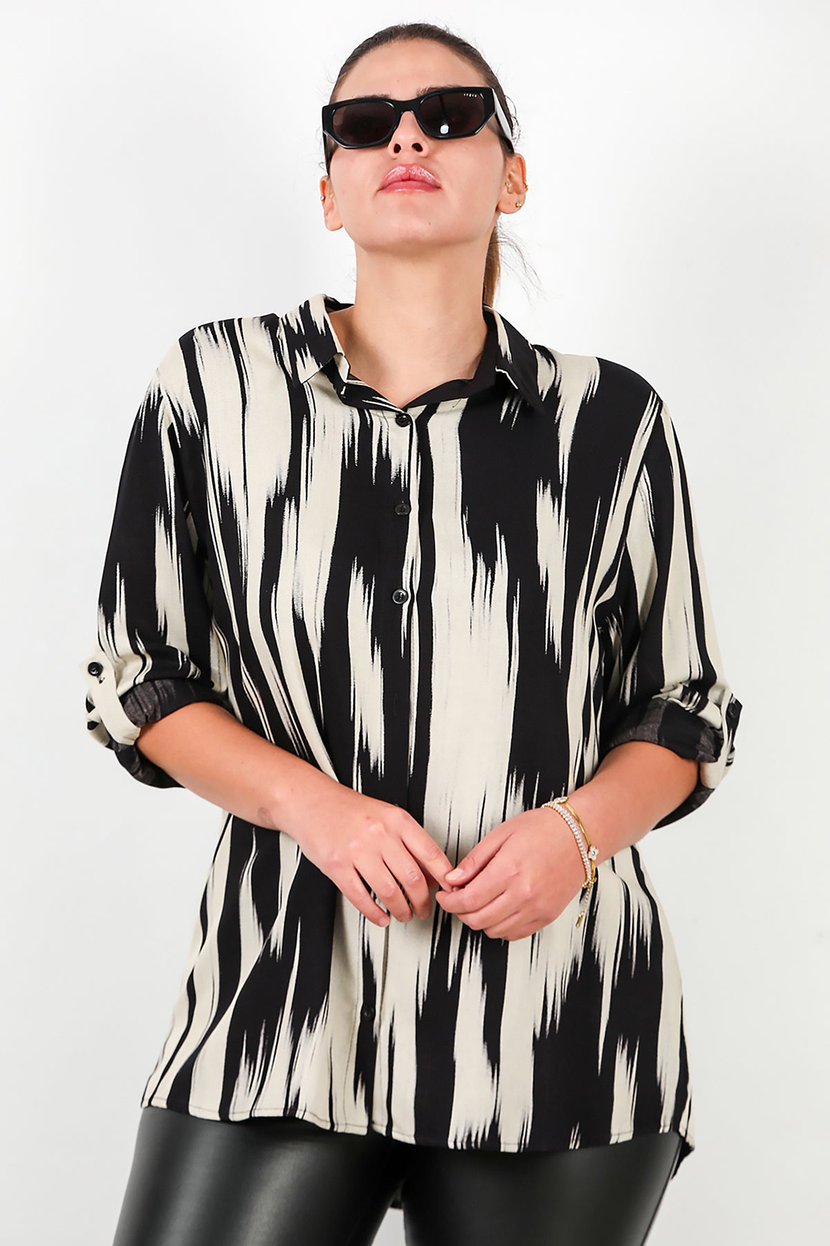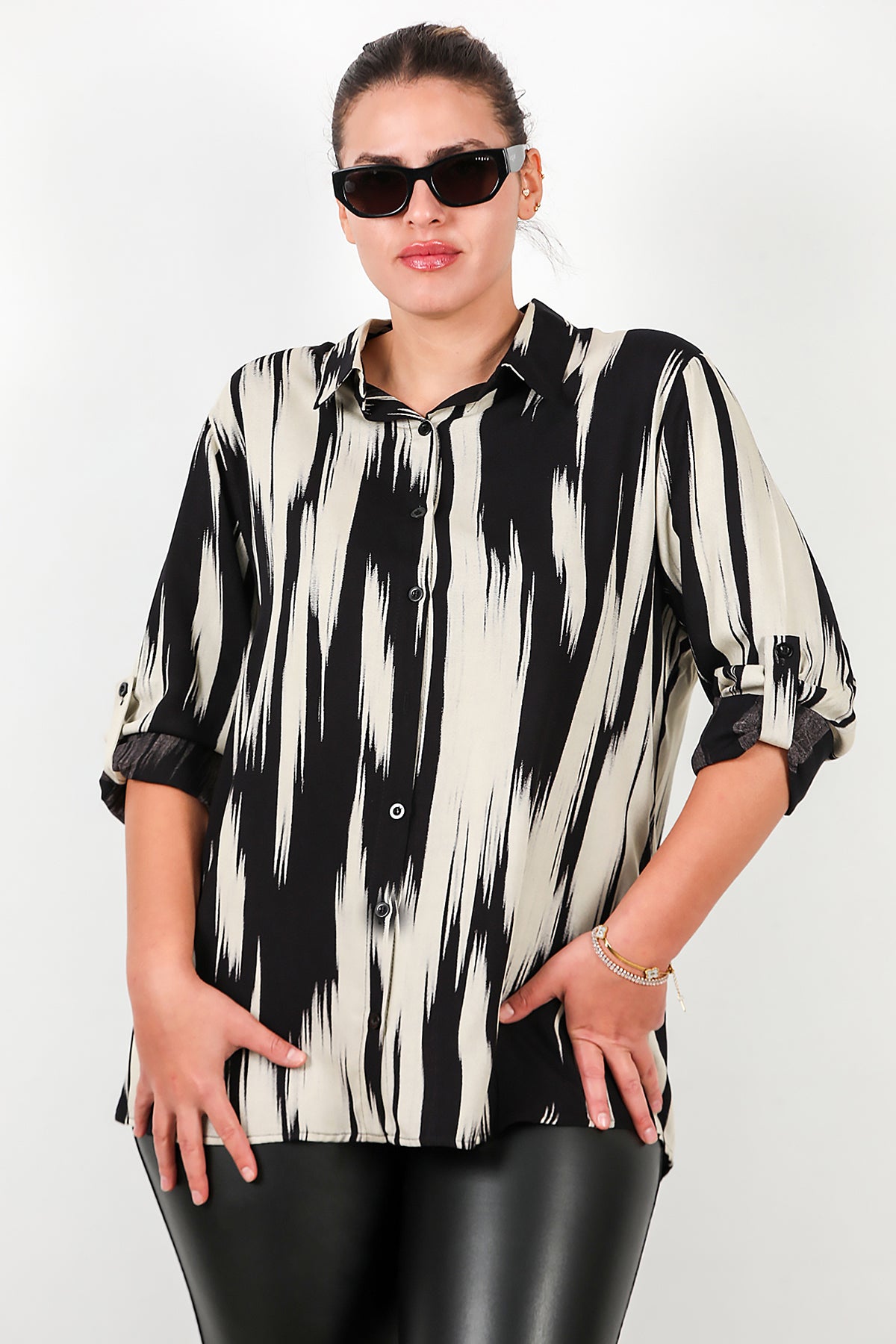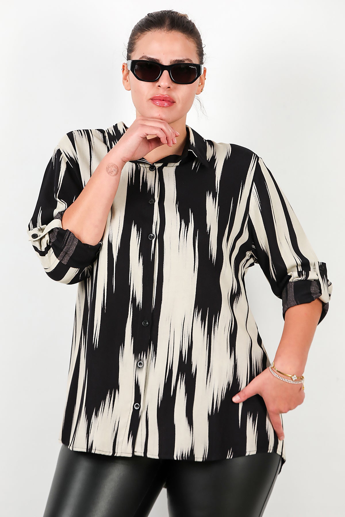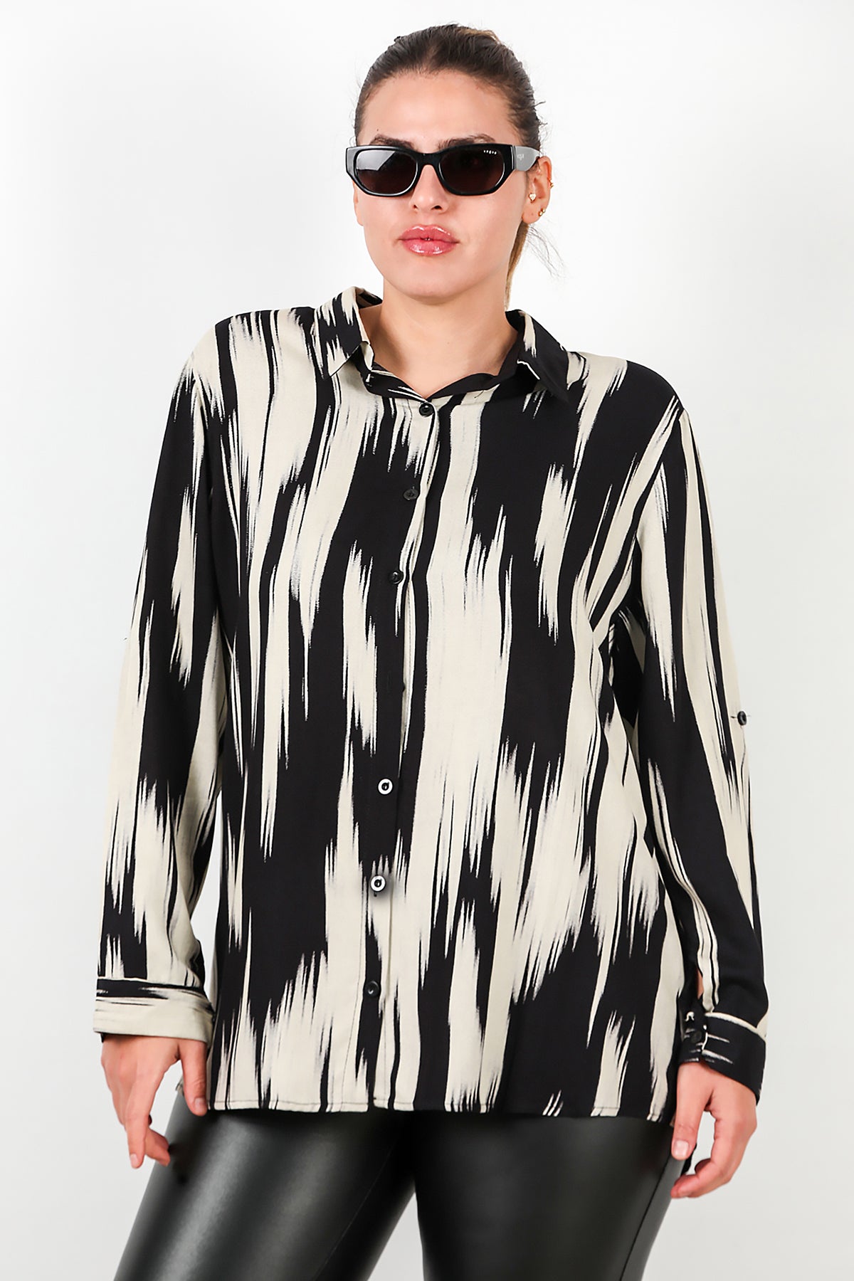Büyük Beden Desenli Kol Katlamalı Gömlek Siyah