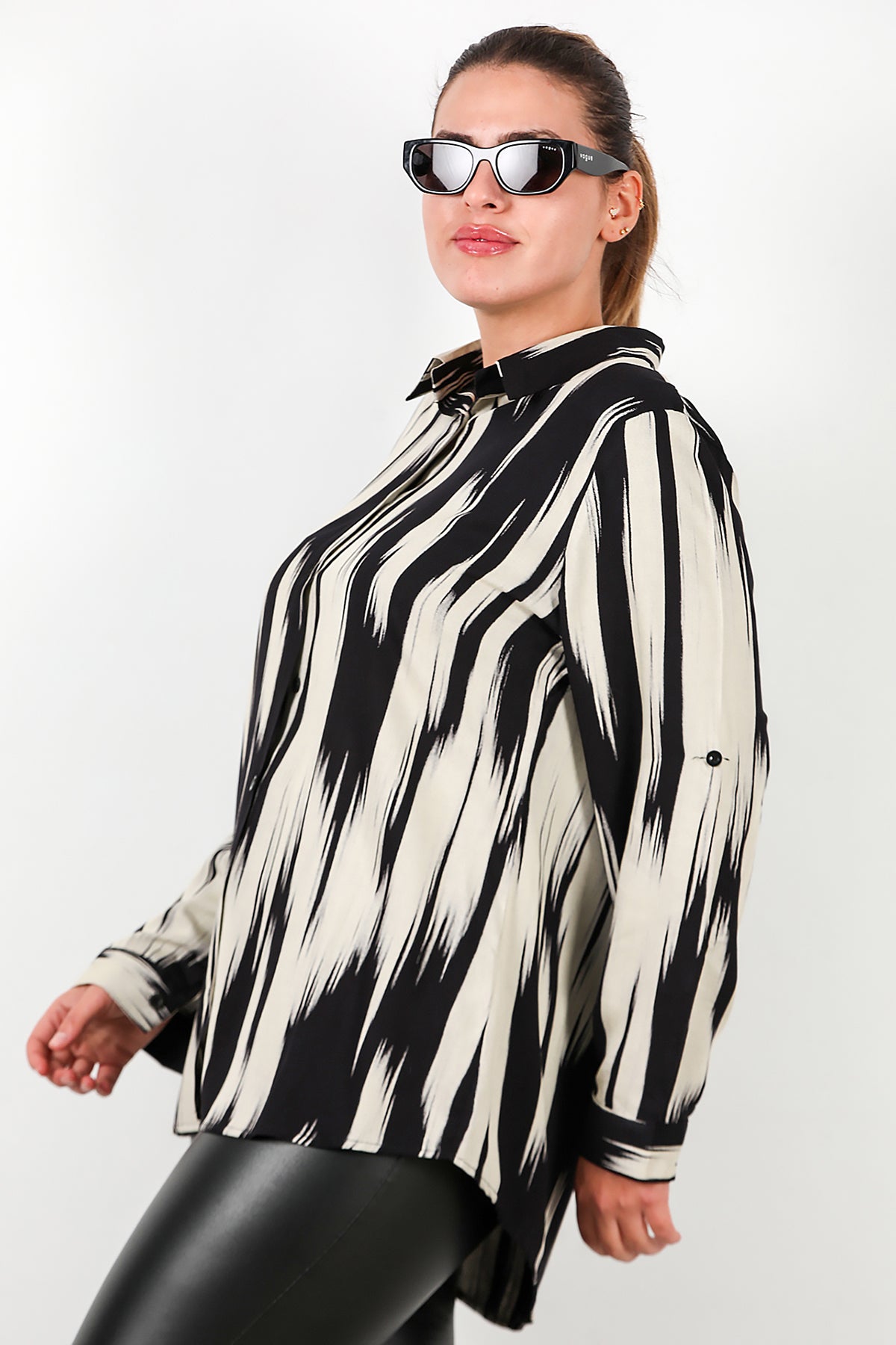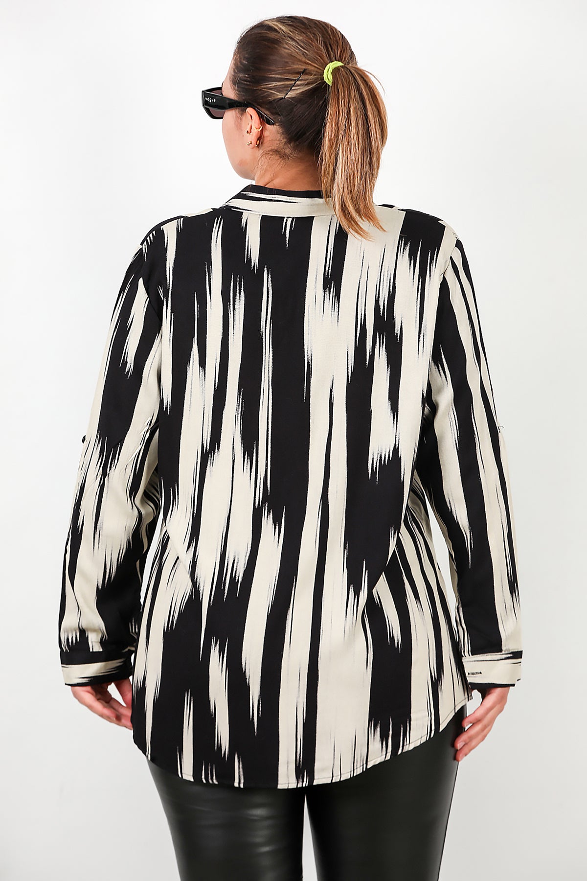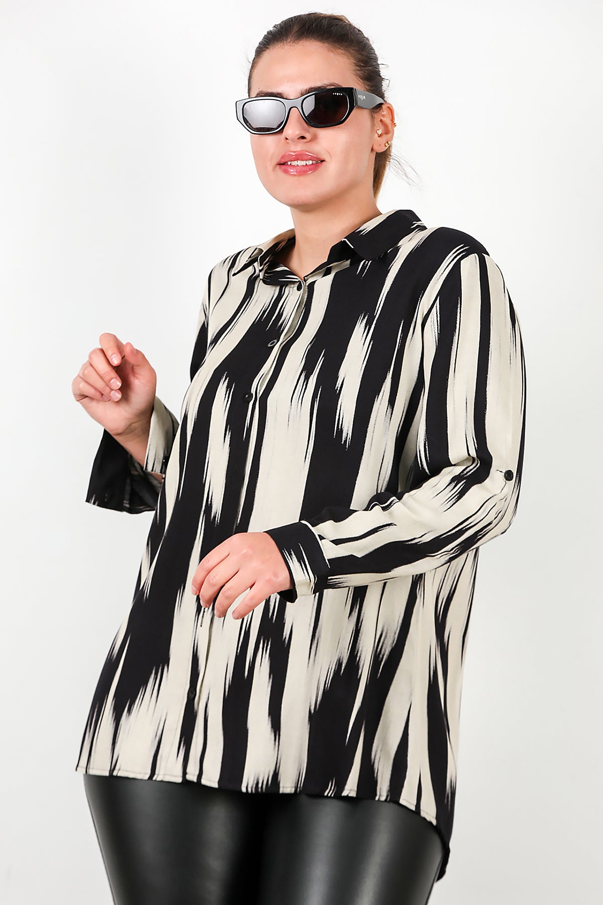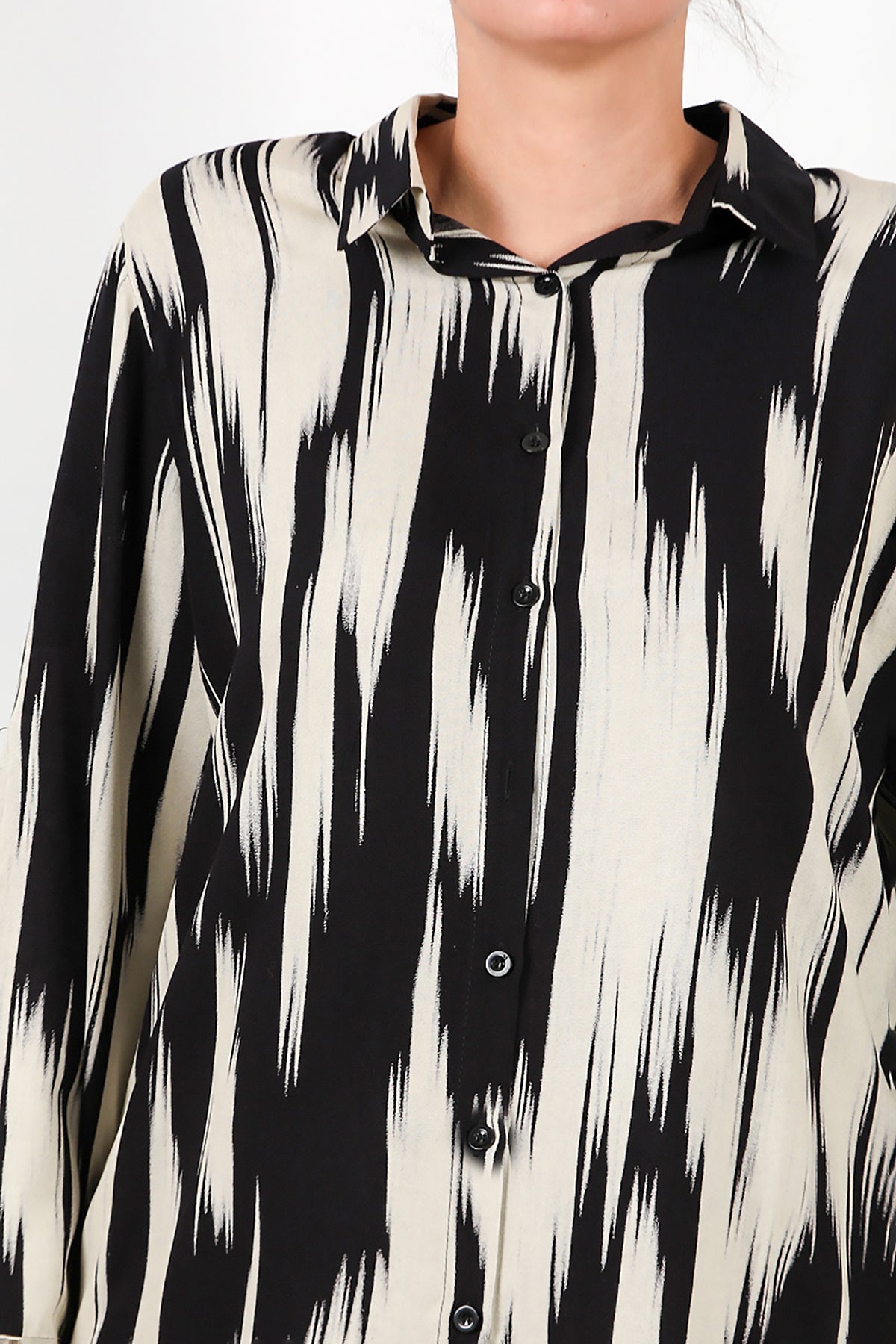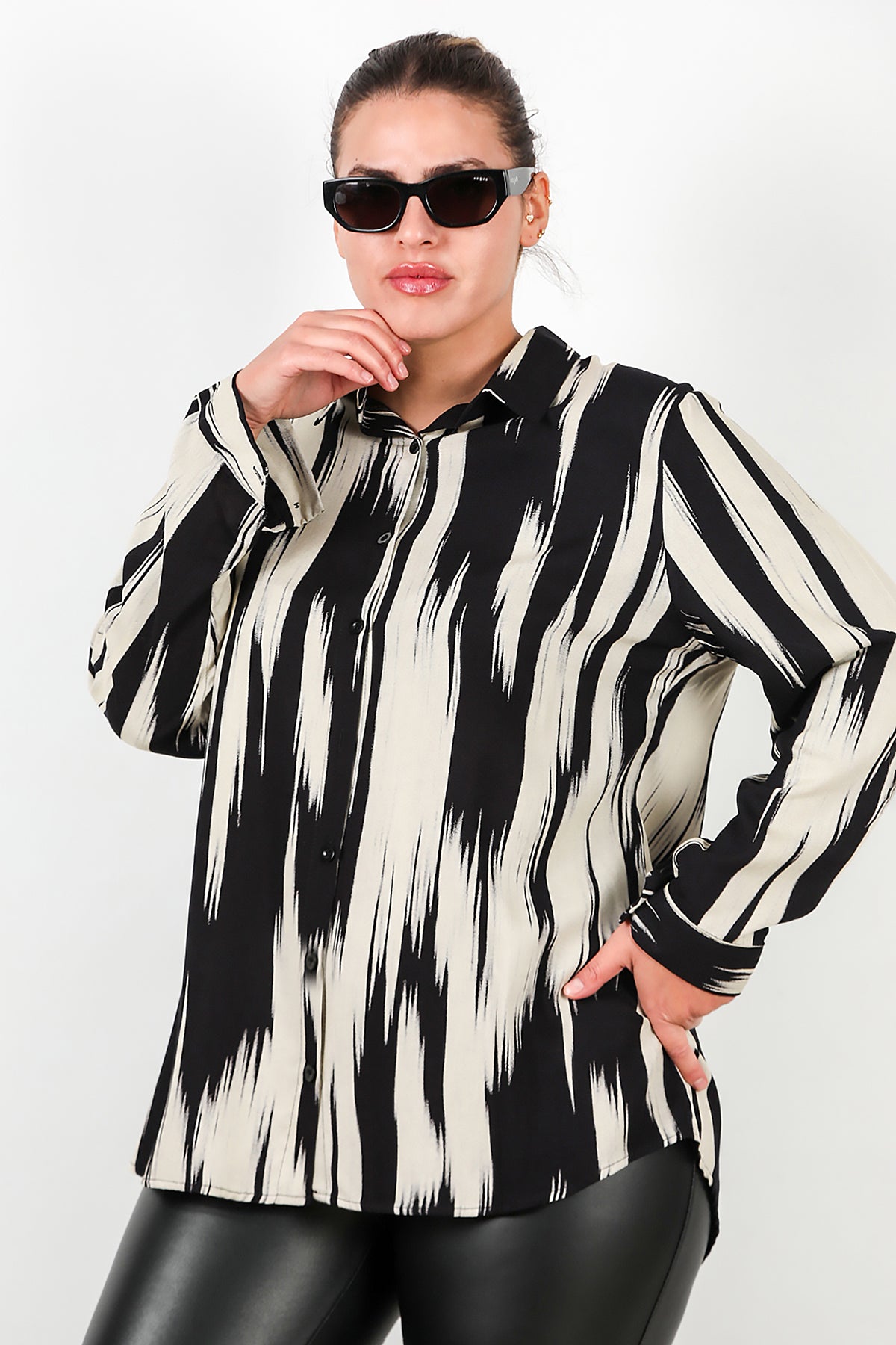 Büyük Beden Desenli Kol Katlamalı Gömlek Siyah