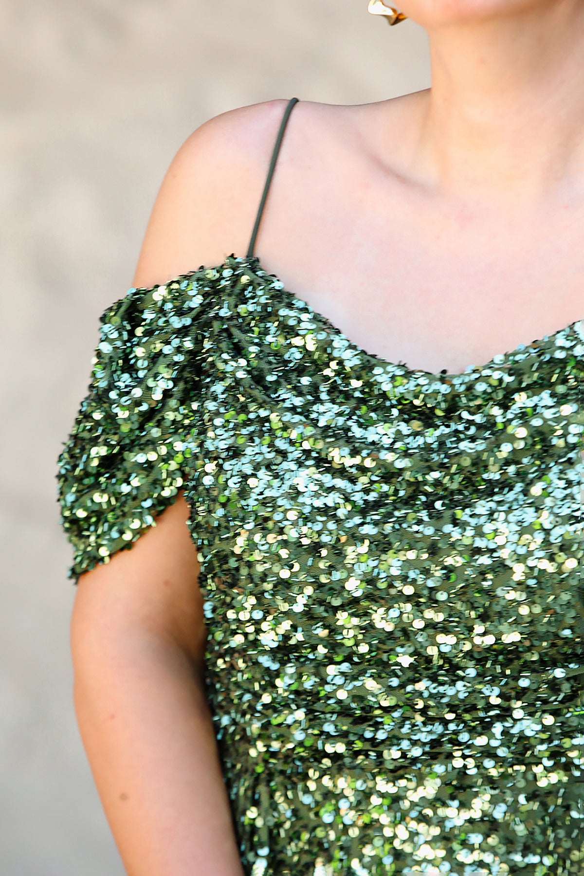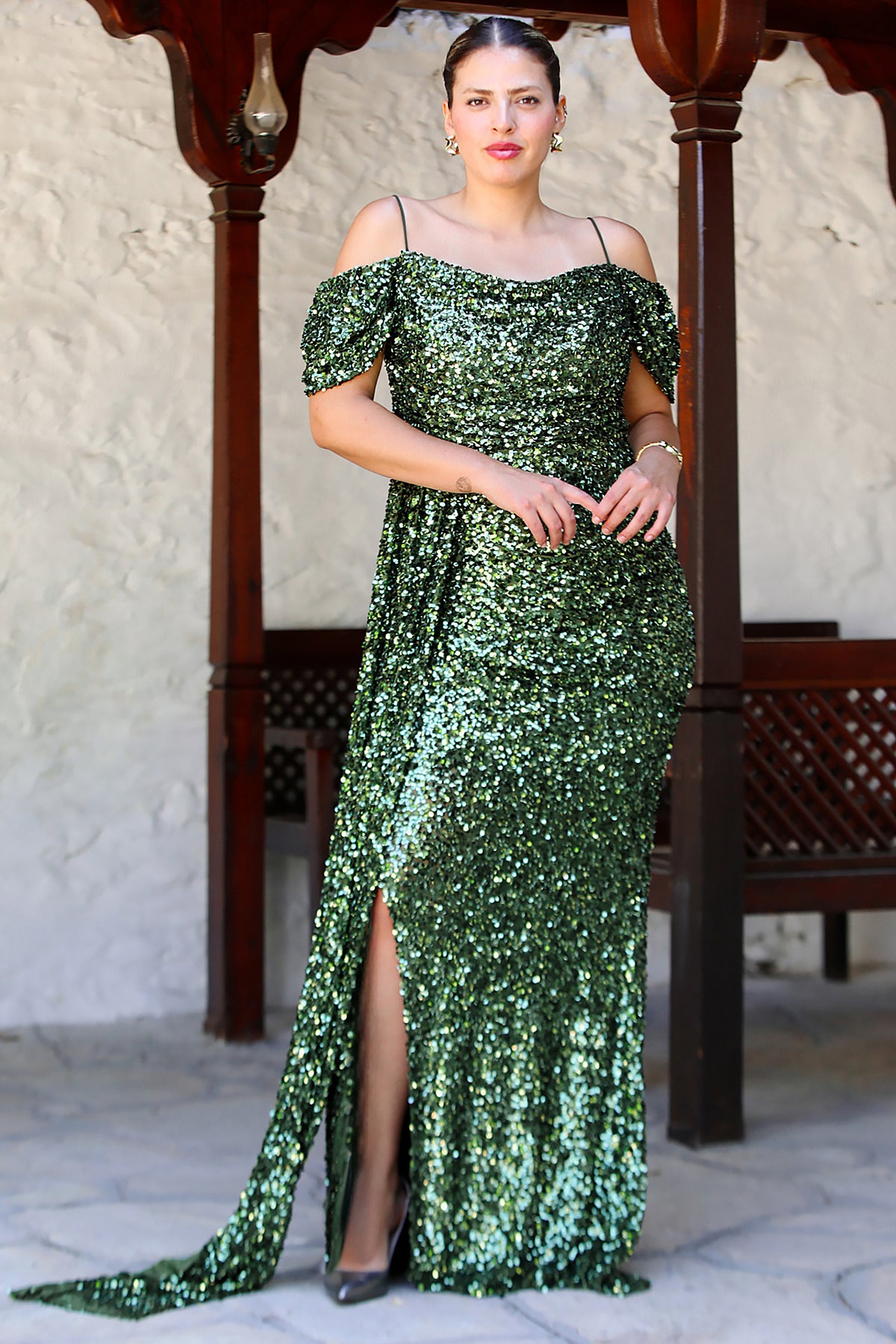 Büyük Beden Düşük Omuz Yırtmaçlı Pullu Uzun Abiye Yeşil