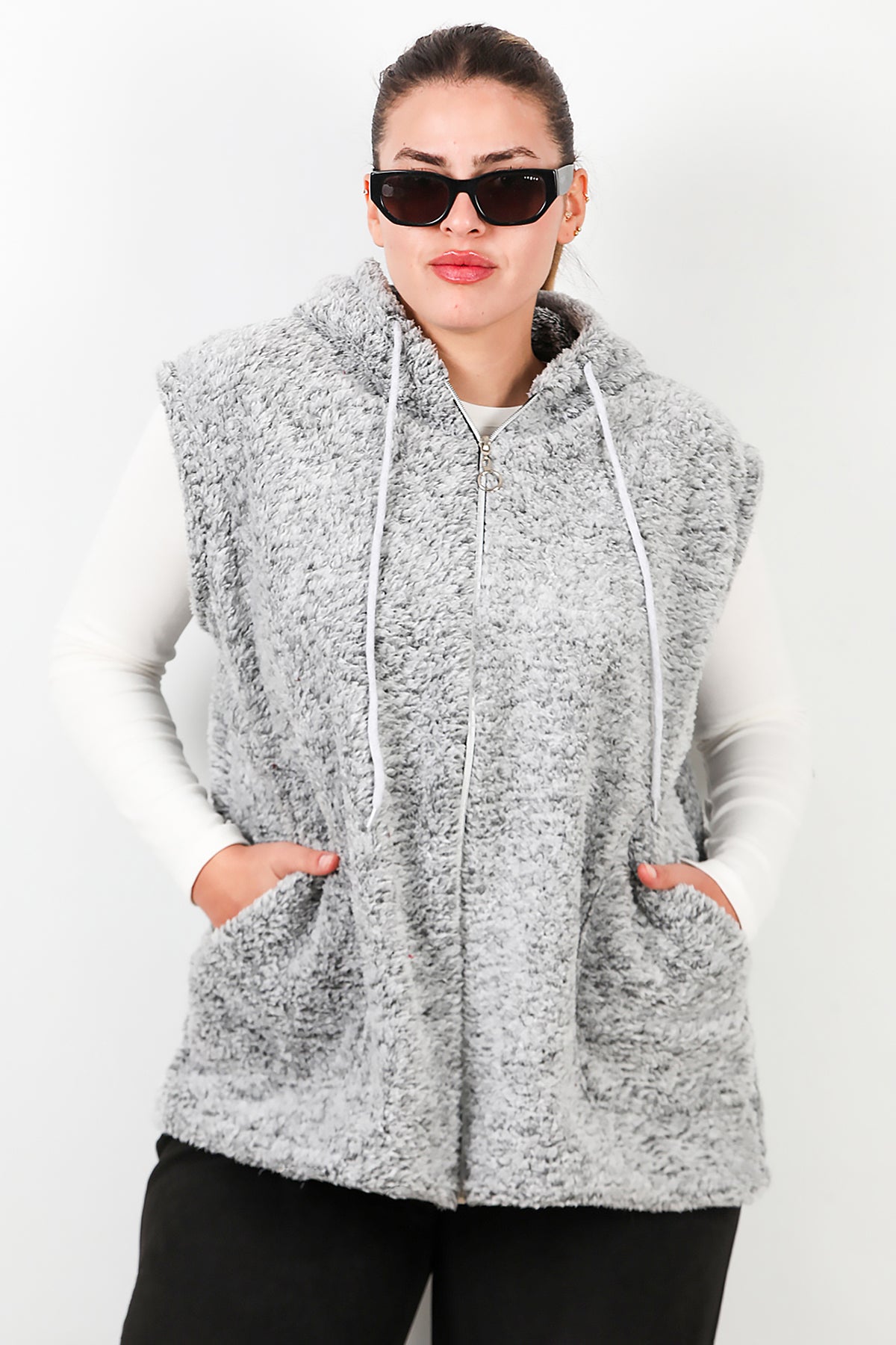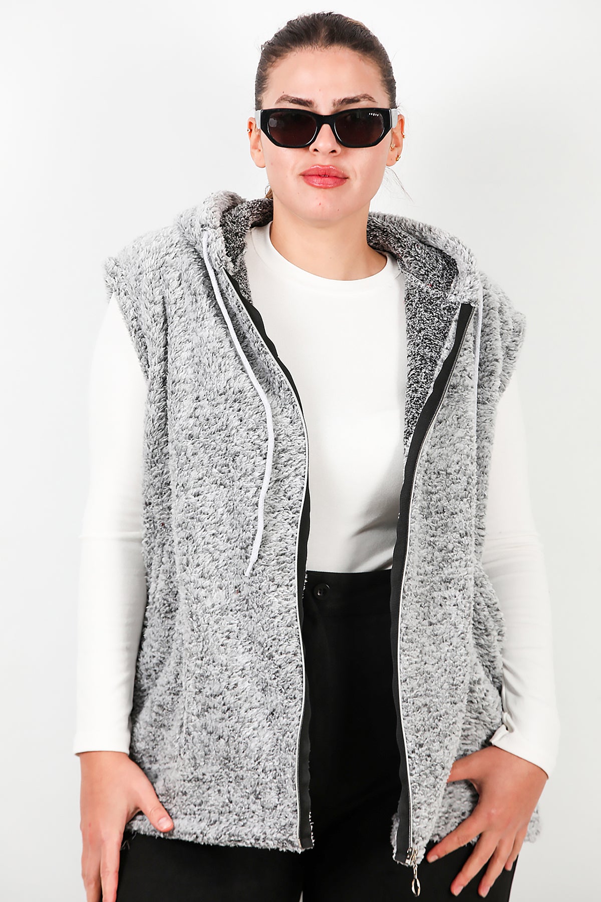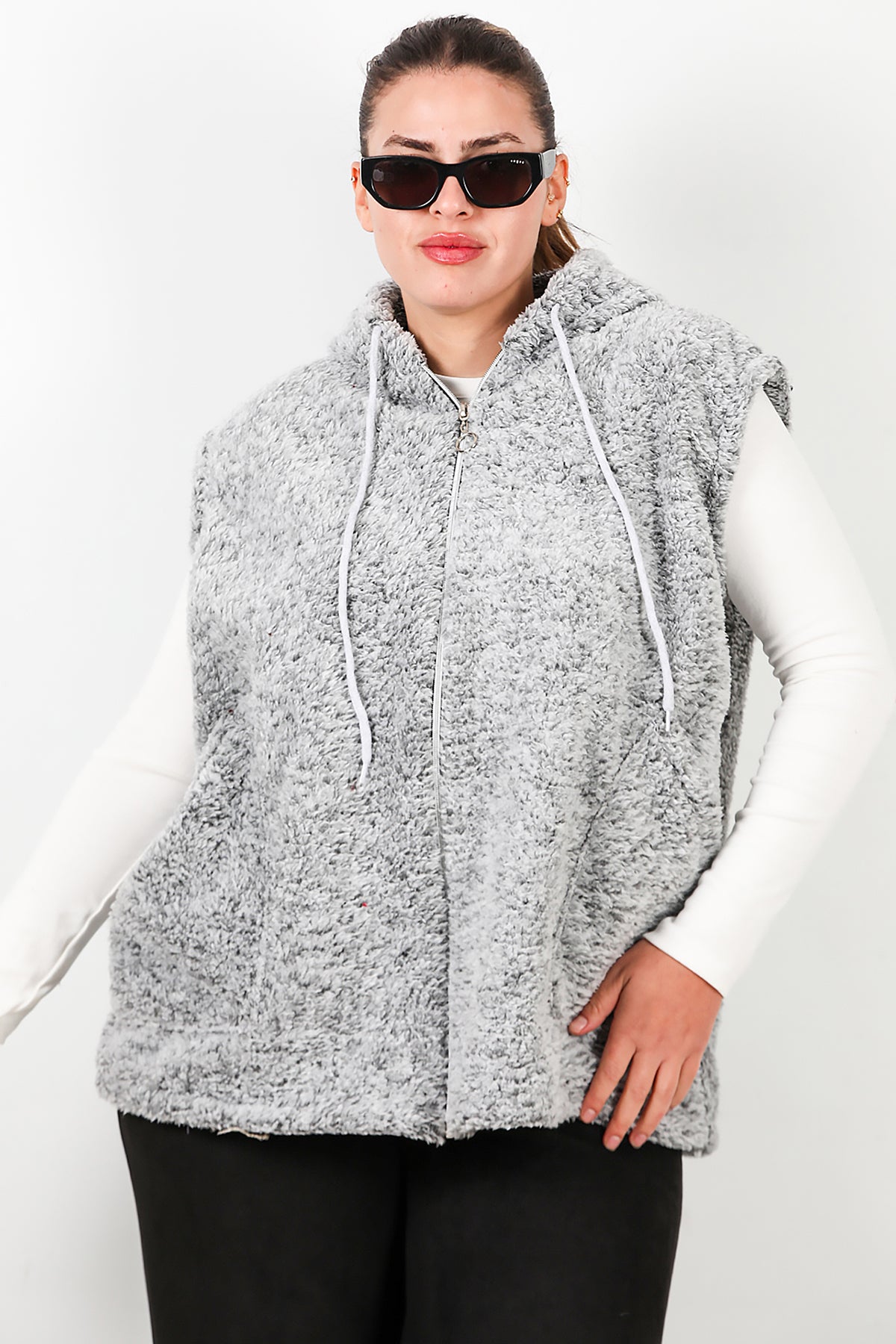 Büyük Beden Fermuarlı Kapşonlu Peluş Yelek Gri