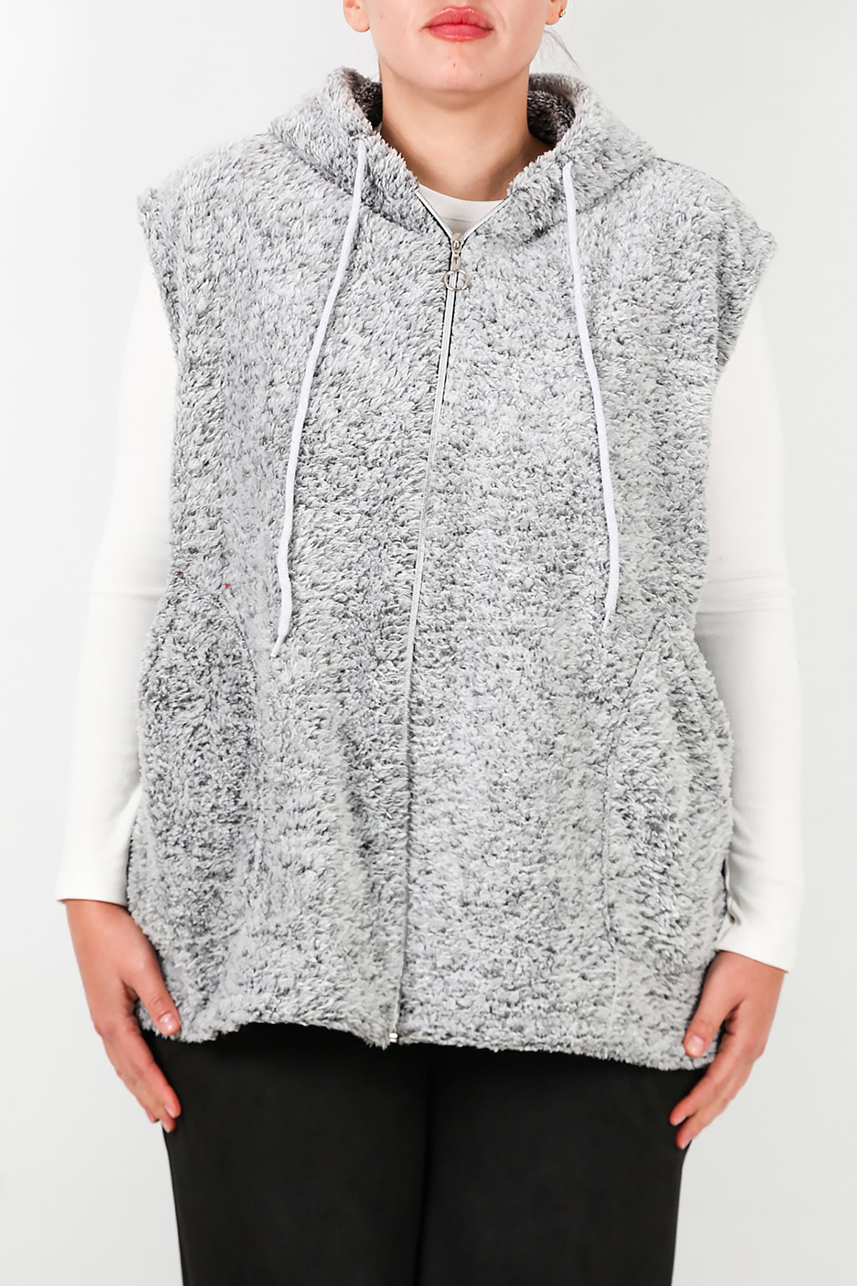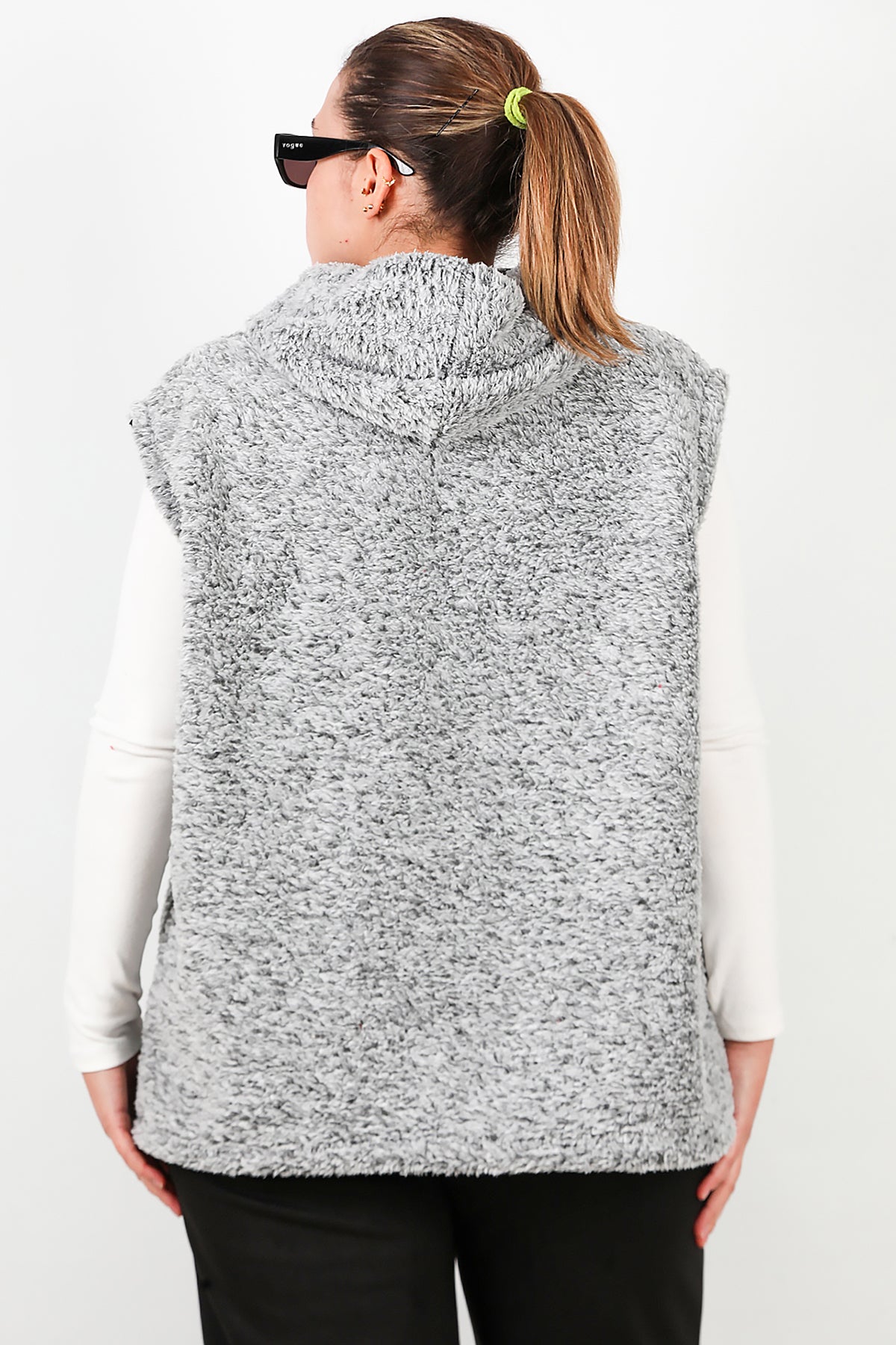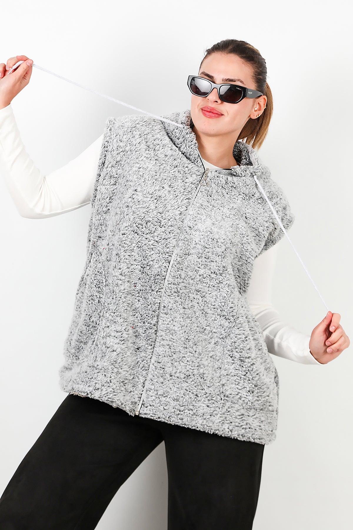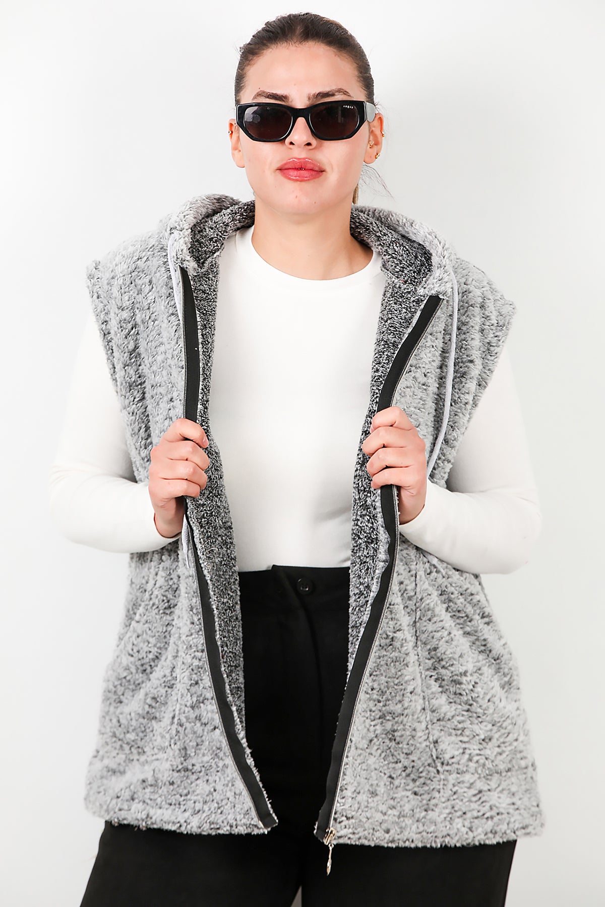 Büyük Beden Fermuarlı Kapşonlu Peluş Yelek Gri