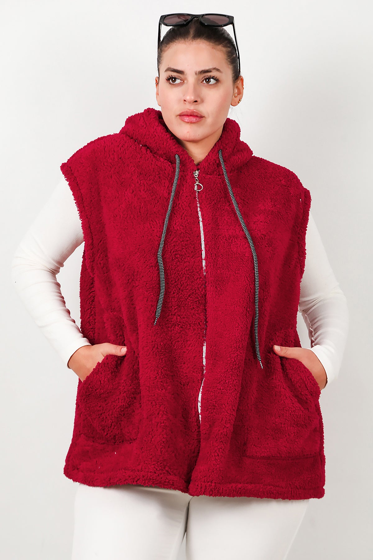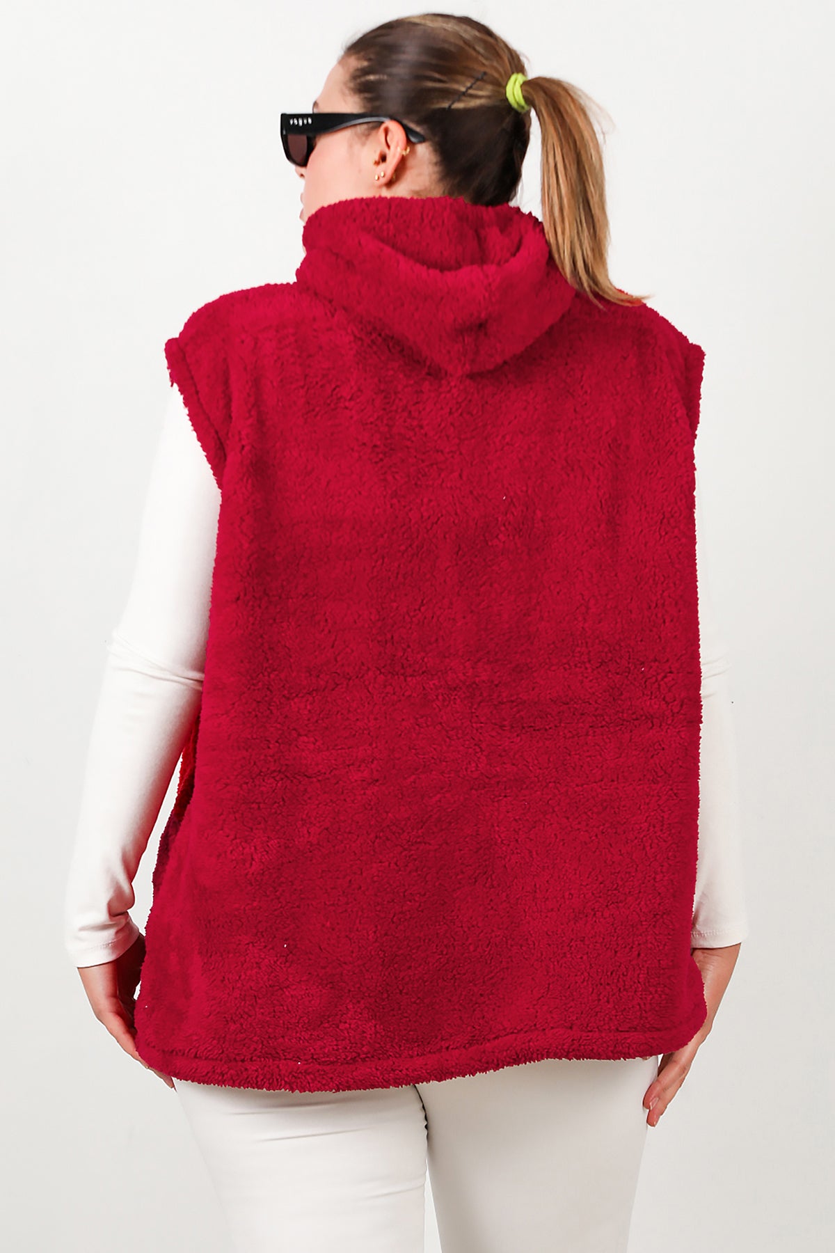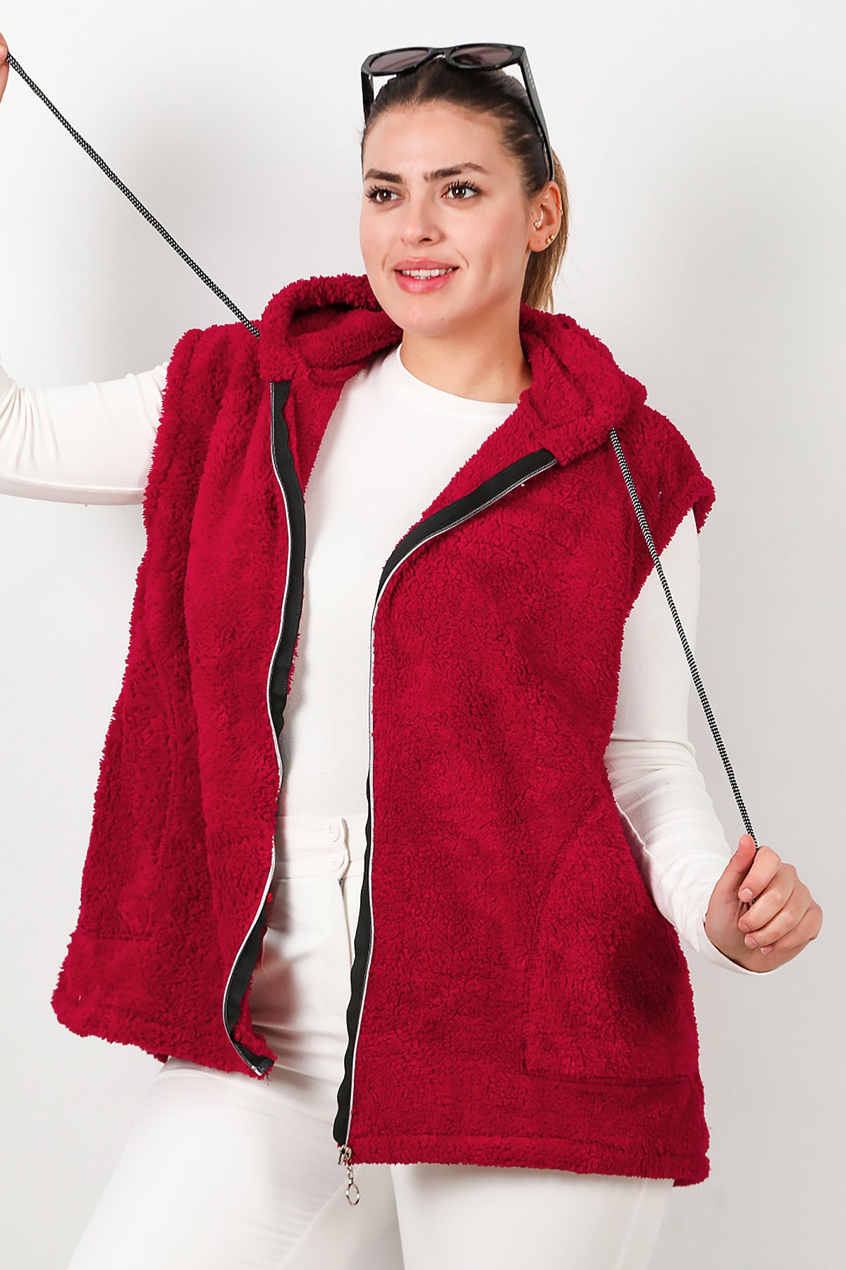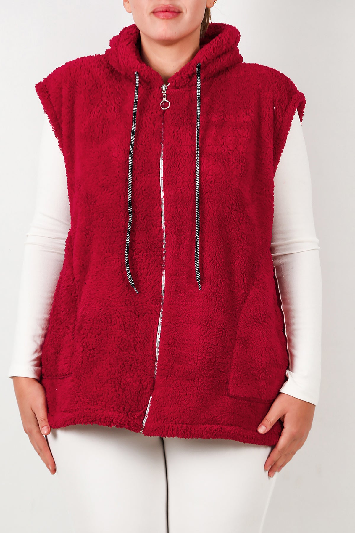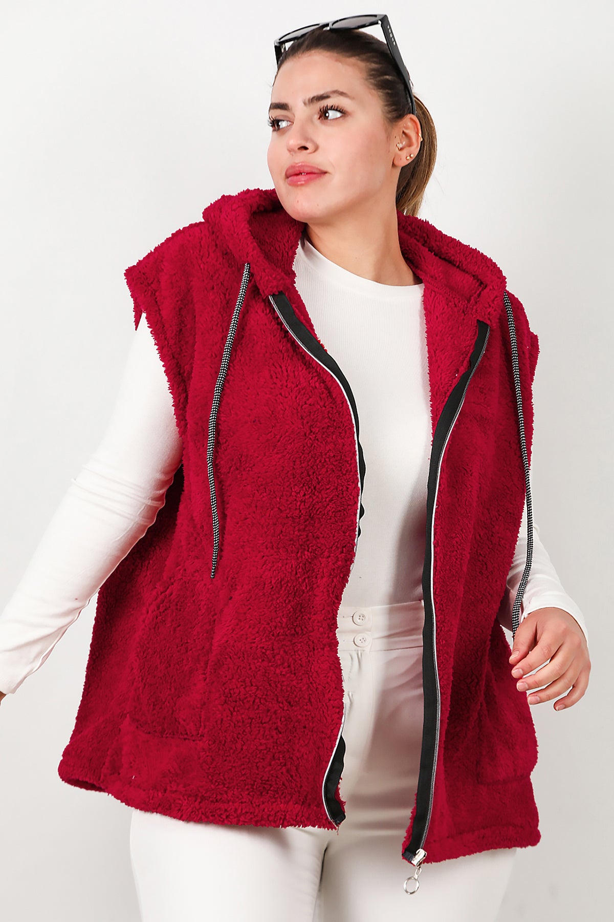 Büyük Beden Fermuarlı Kapşonlu Peluş Yelek Kırmızı