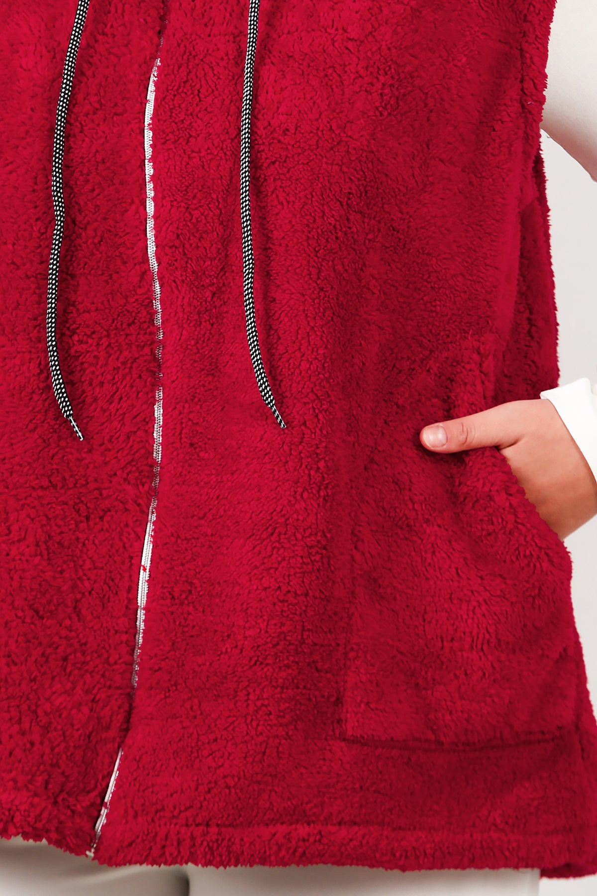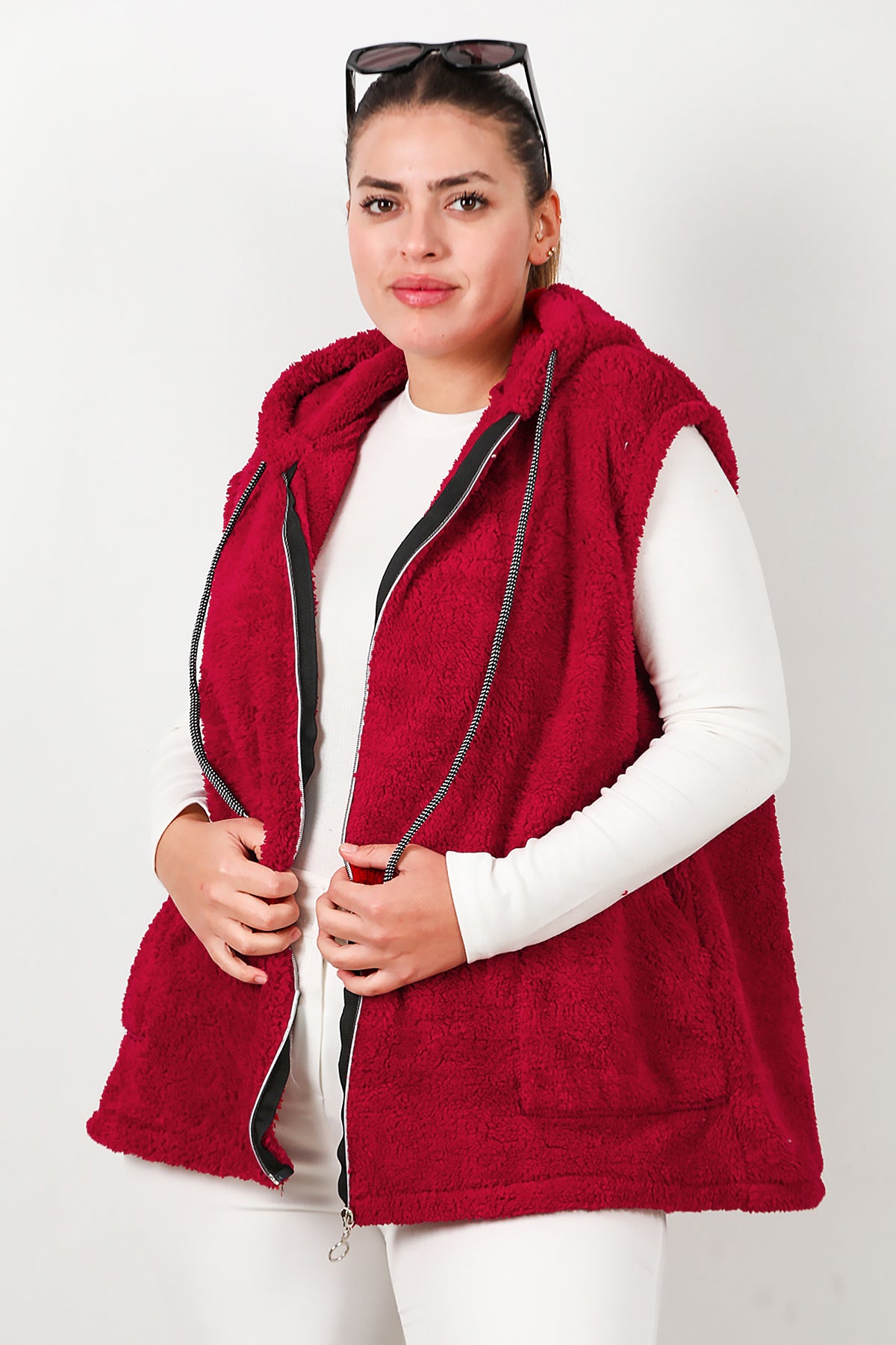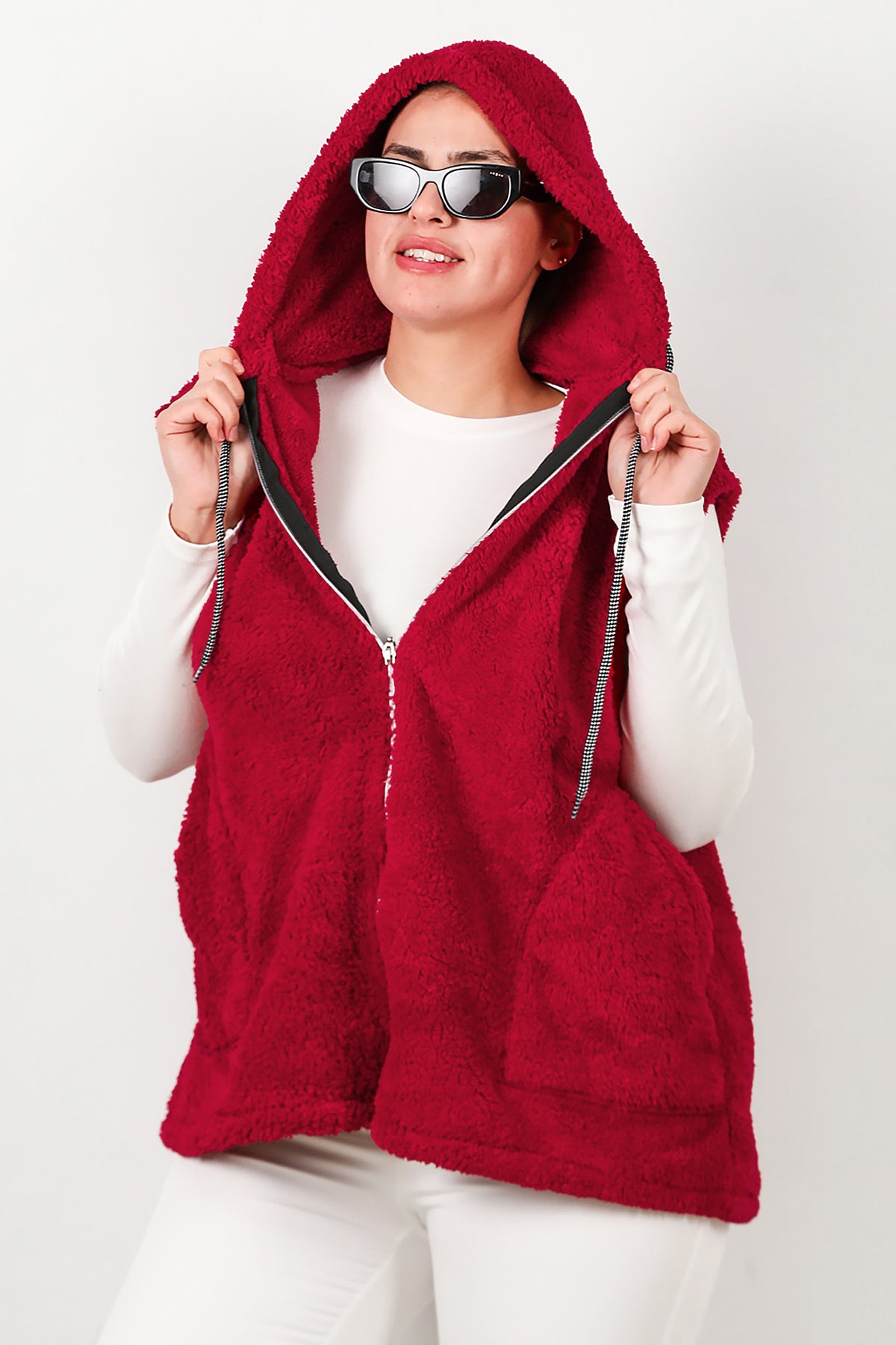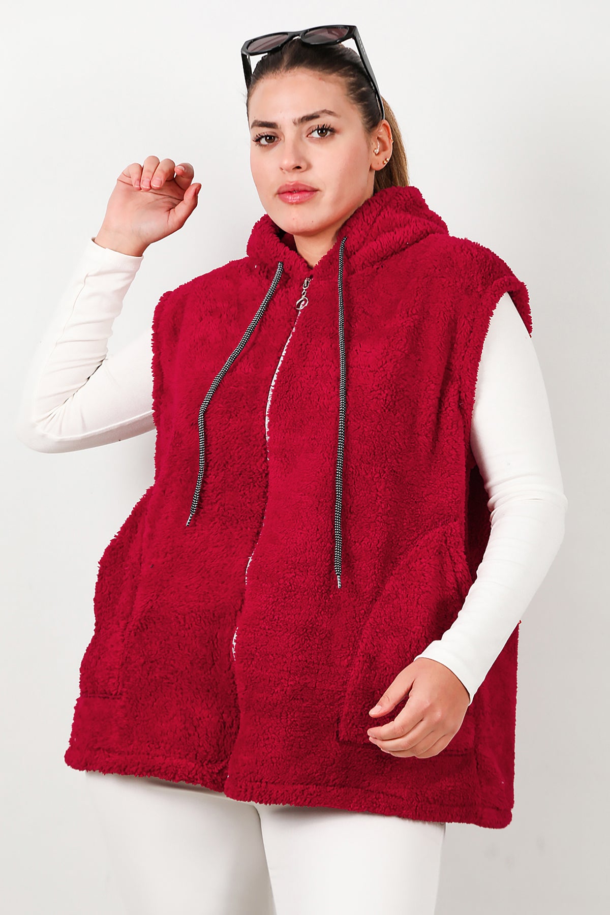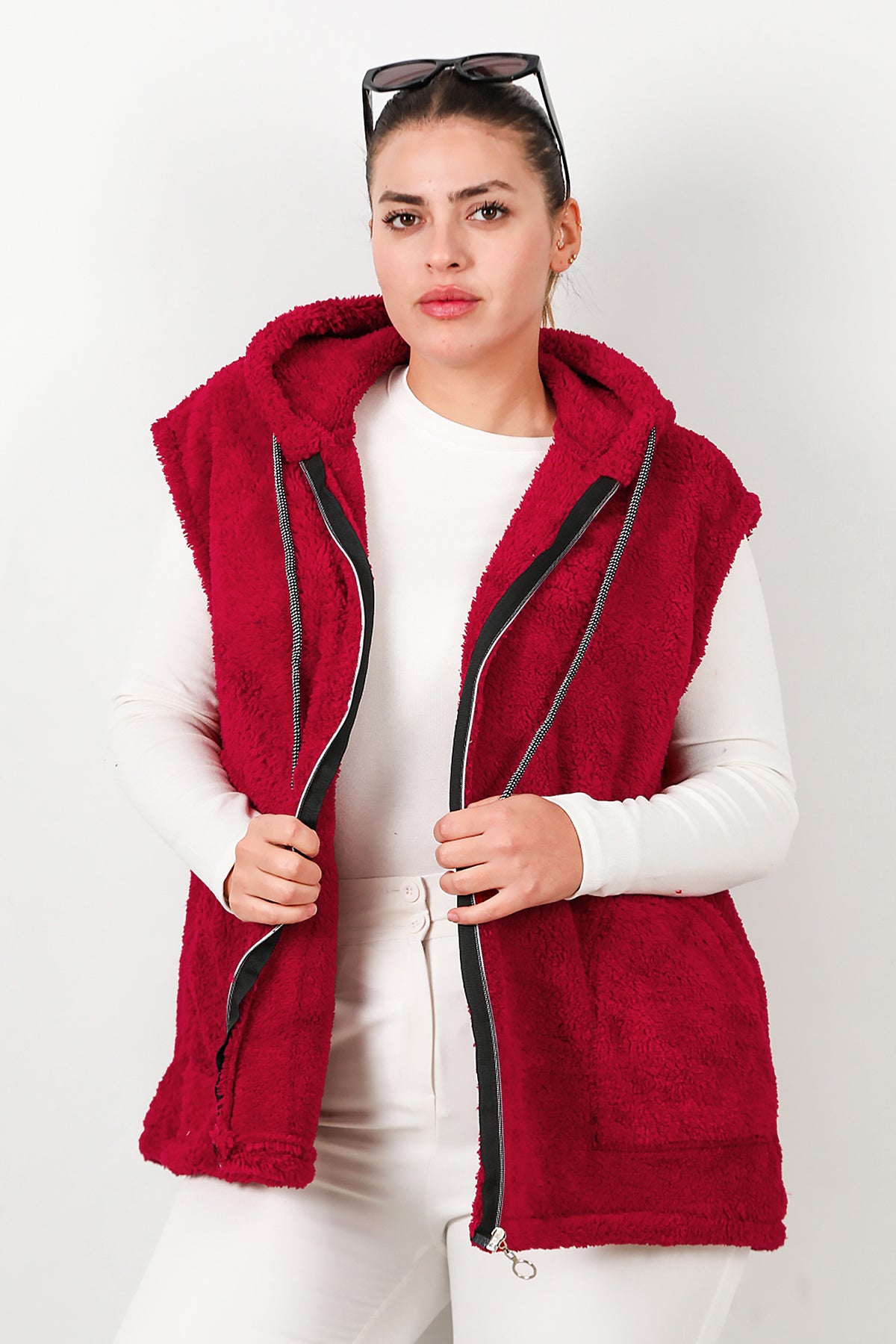 Büyük Beden Fermuarlı Kapşonlu Peluş Yelek Kırmızı