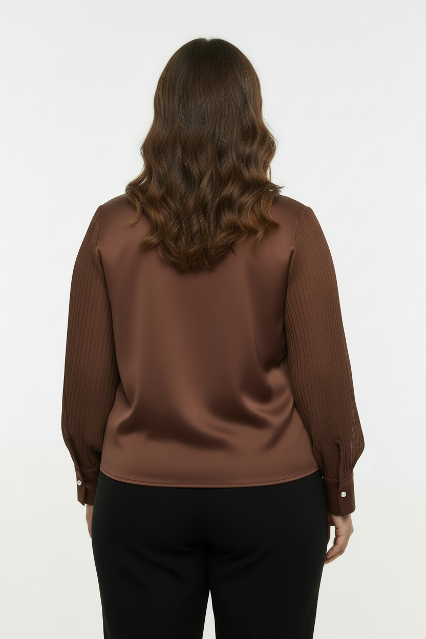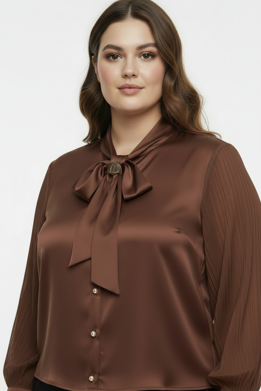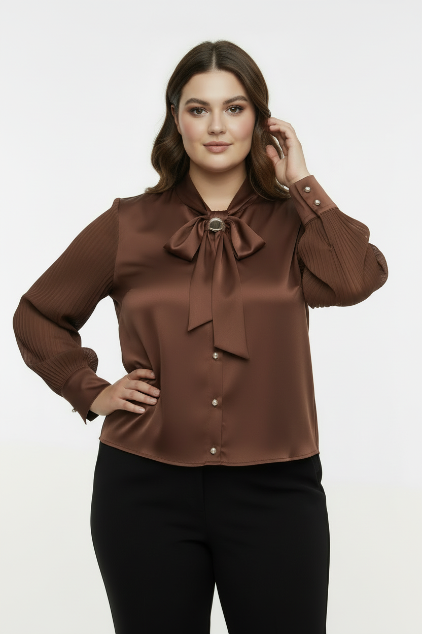Bow Büyük Beden Fularlı Ön Düğmeli Bluz Kahverengi
