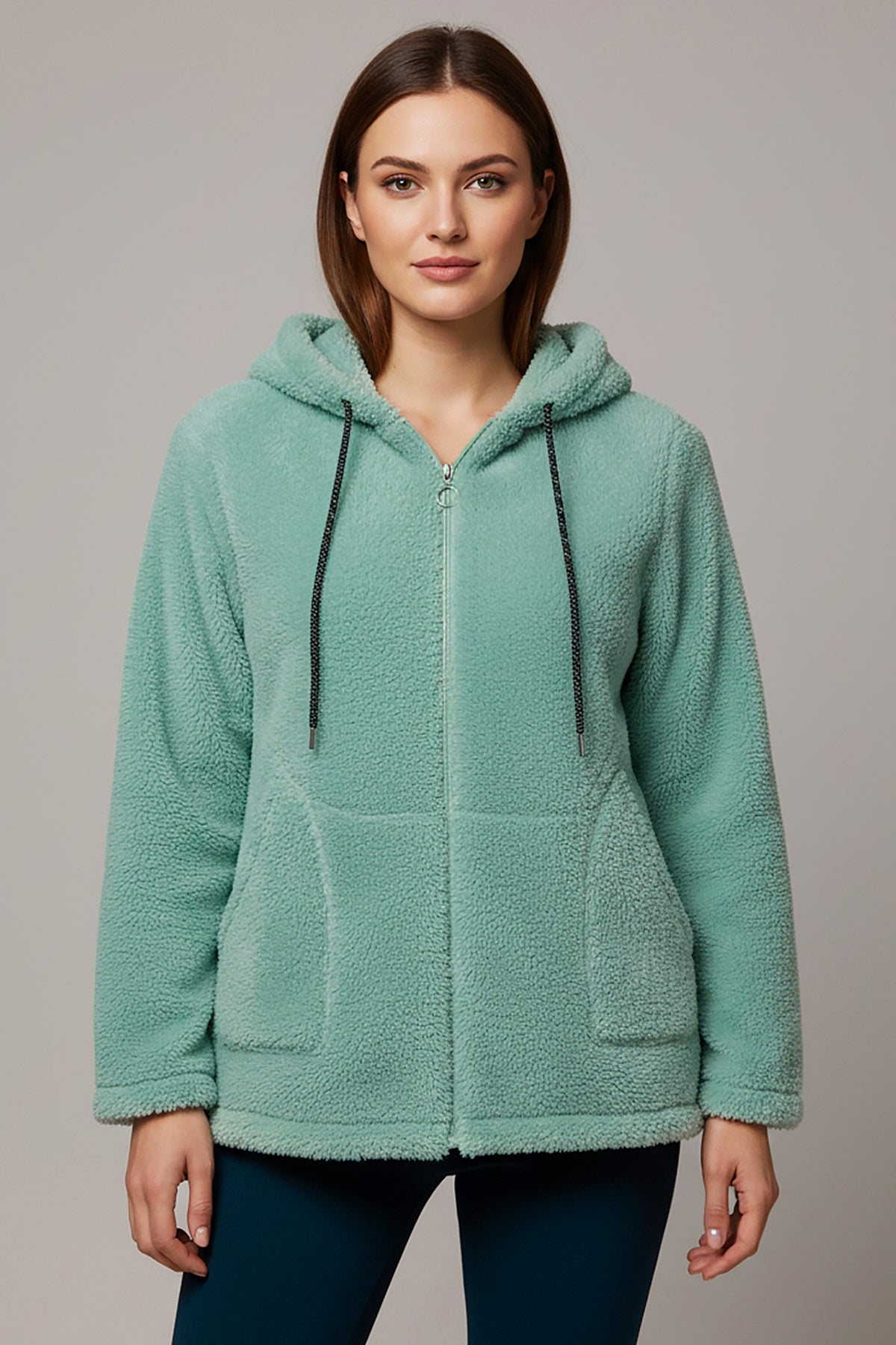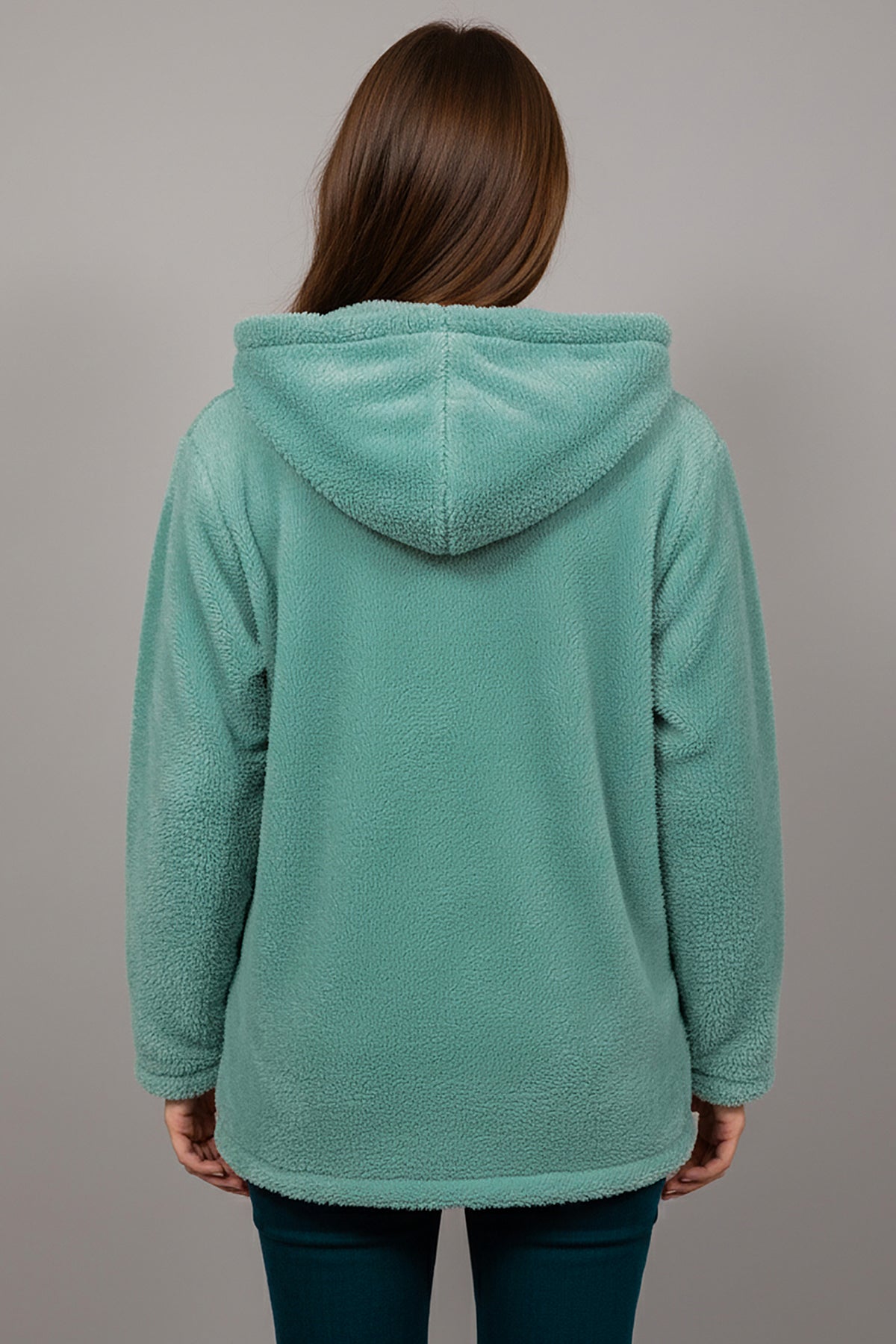 Büyük Beden Kapşonlu Fermuarlı Peluş Ceket Çağla Yeşili
