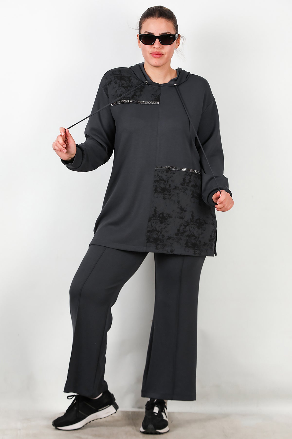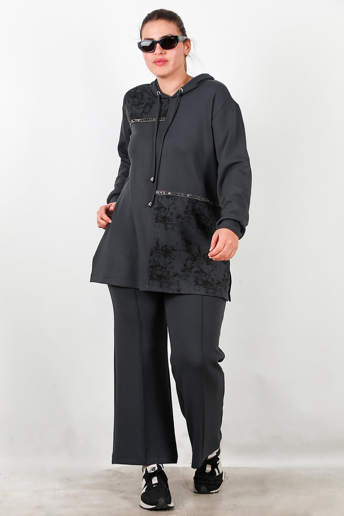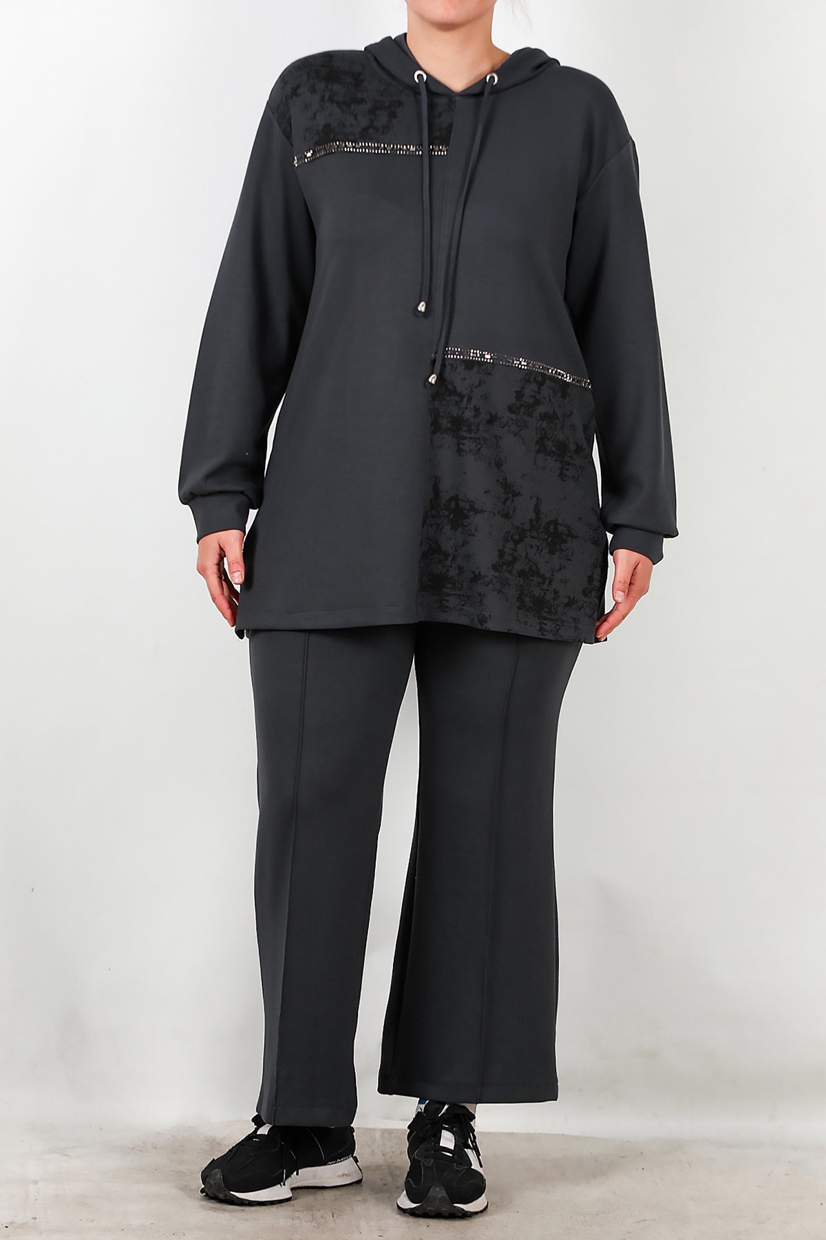 Büyük Beden Kapşonlu Taş İşlemeli İkili Takım Füme