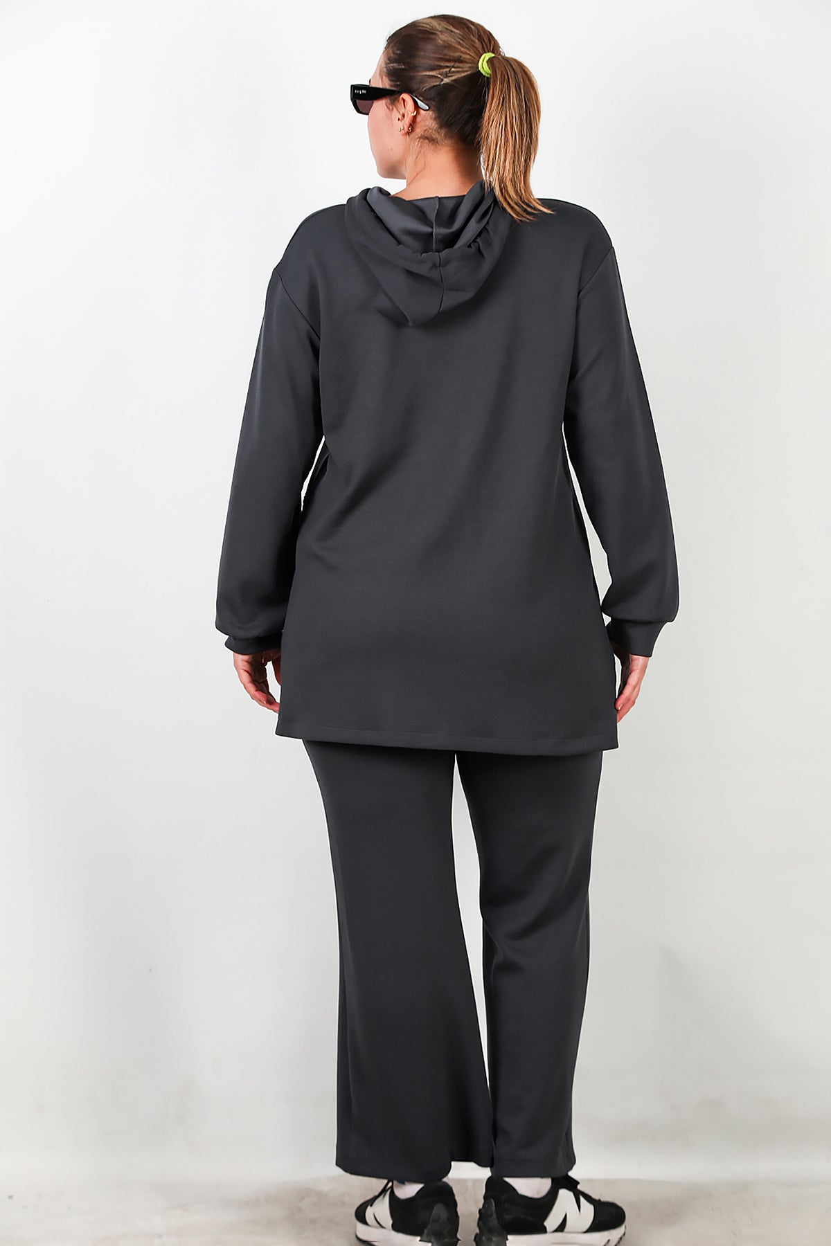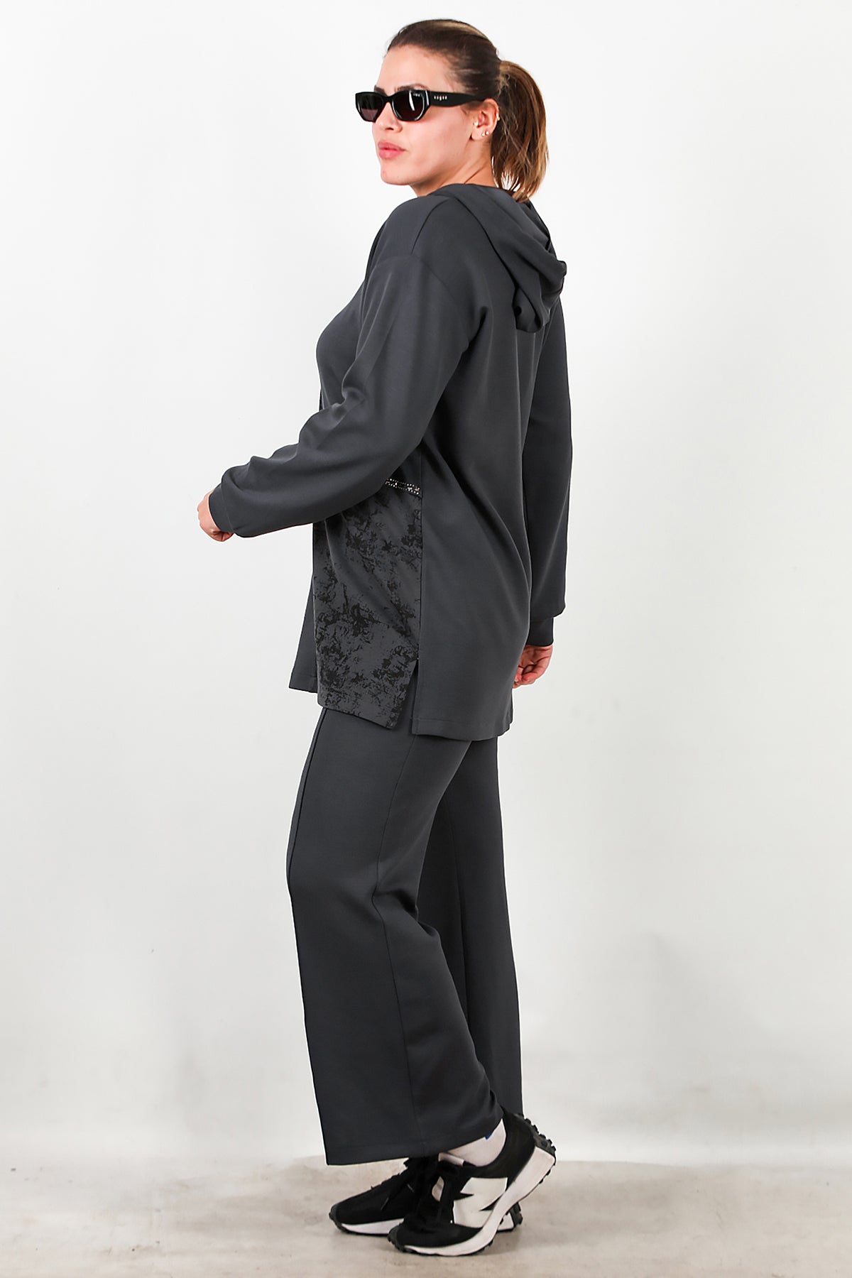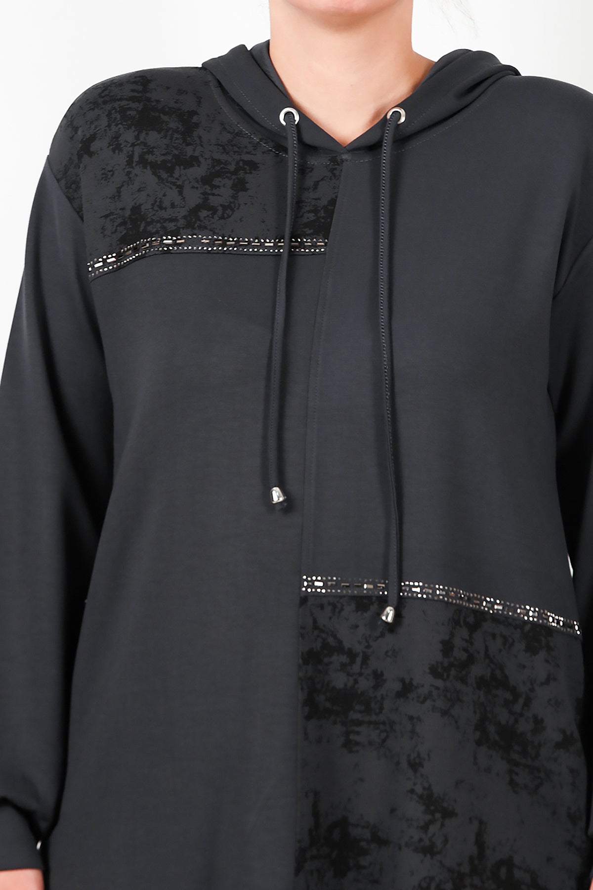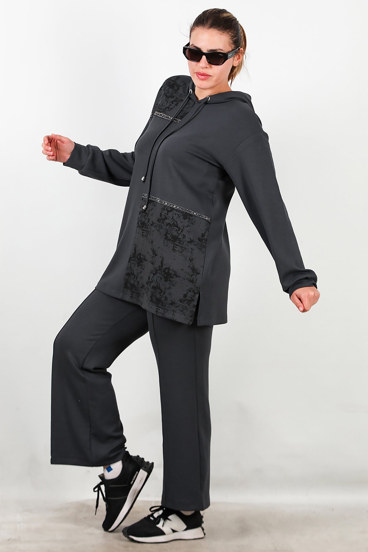 Büyük Beden Kapşonlu Taş İşlemeli İkili Takım Füme
