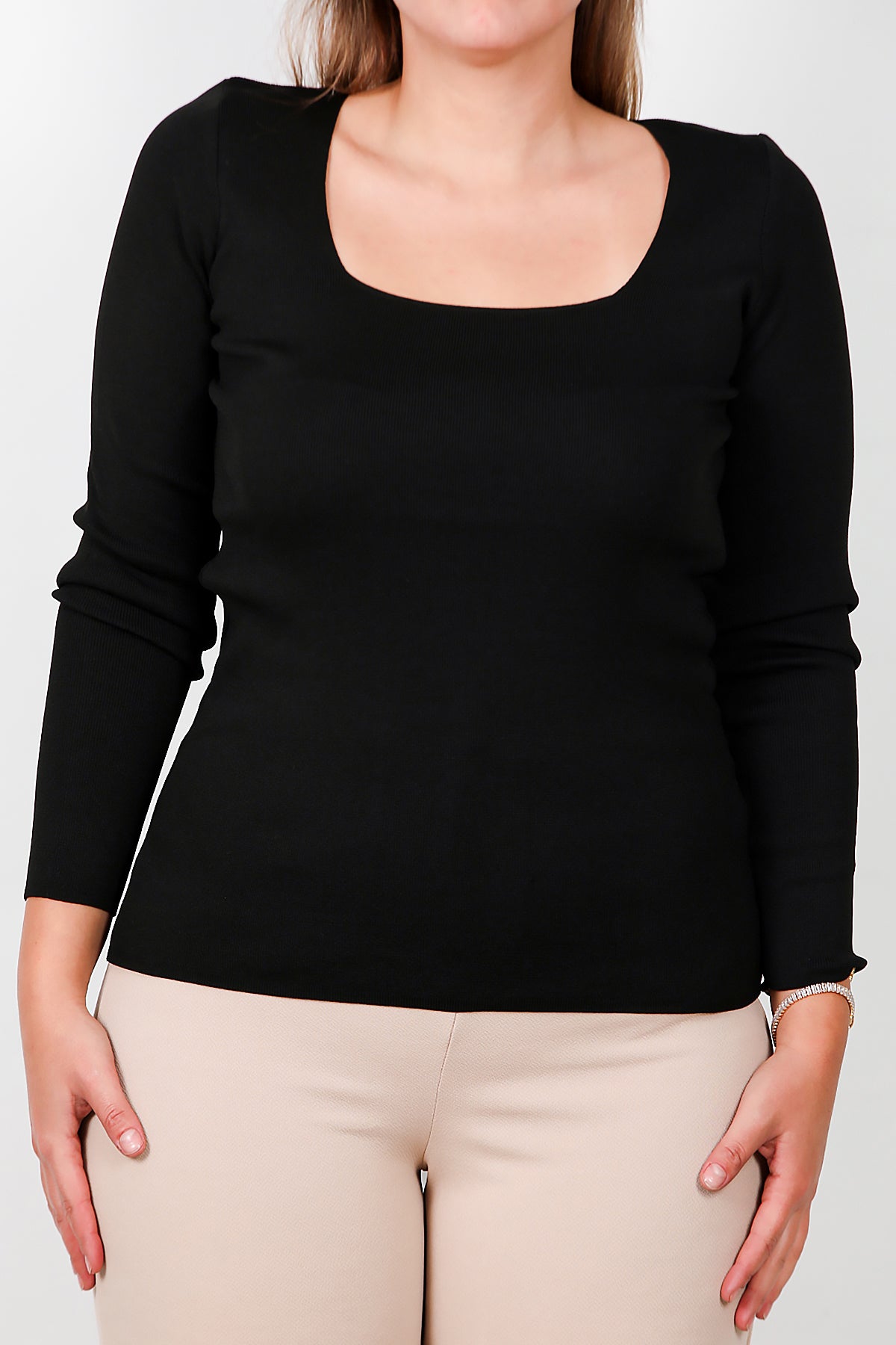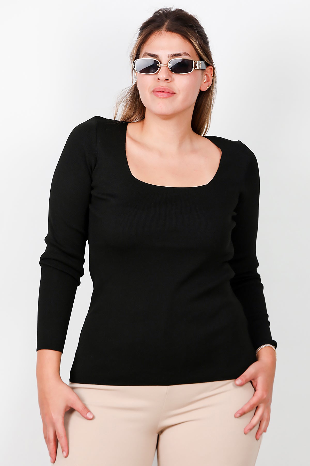 Büyük Beden Kare Yaka Uzun Kol Bluz Siyah