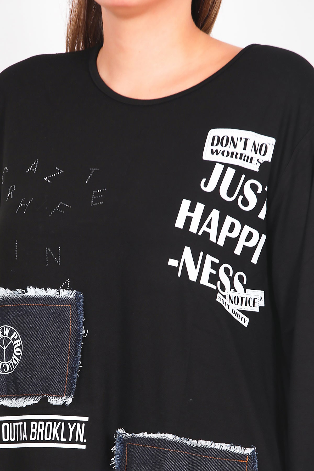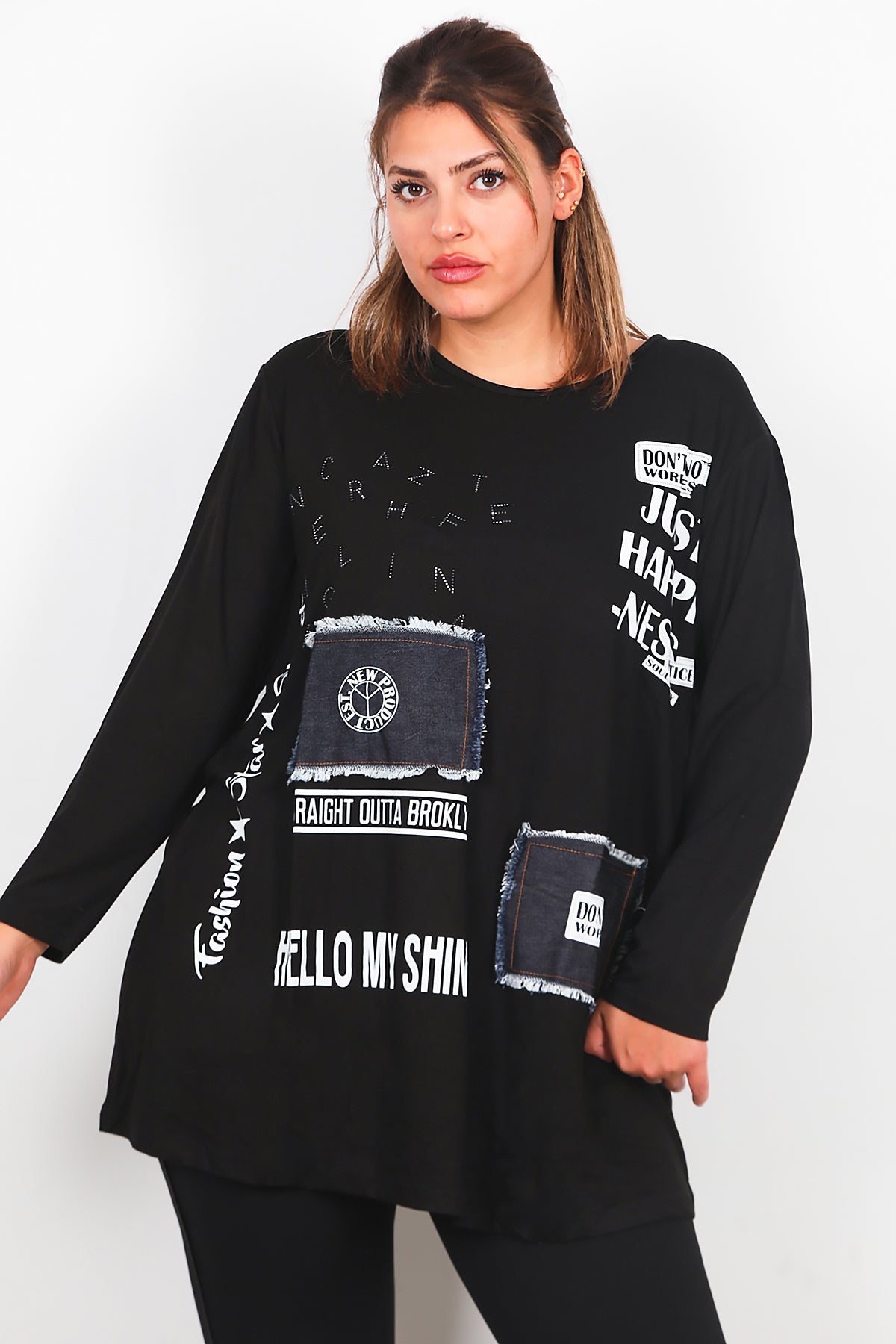 Büyük Beden Karışık Yazılı Bluz Siyah
