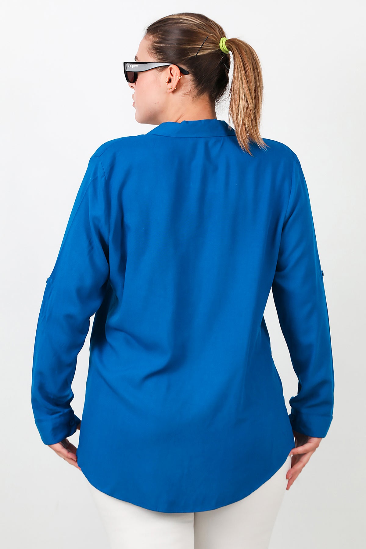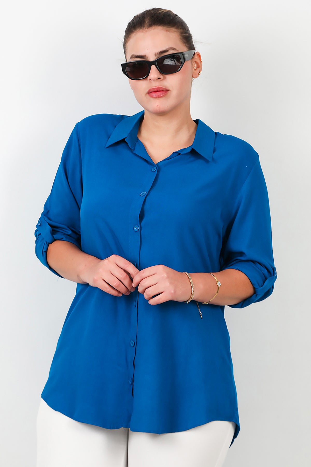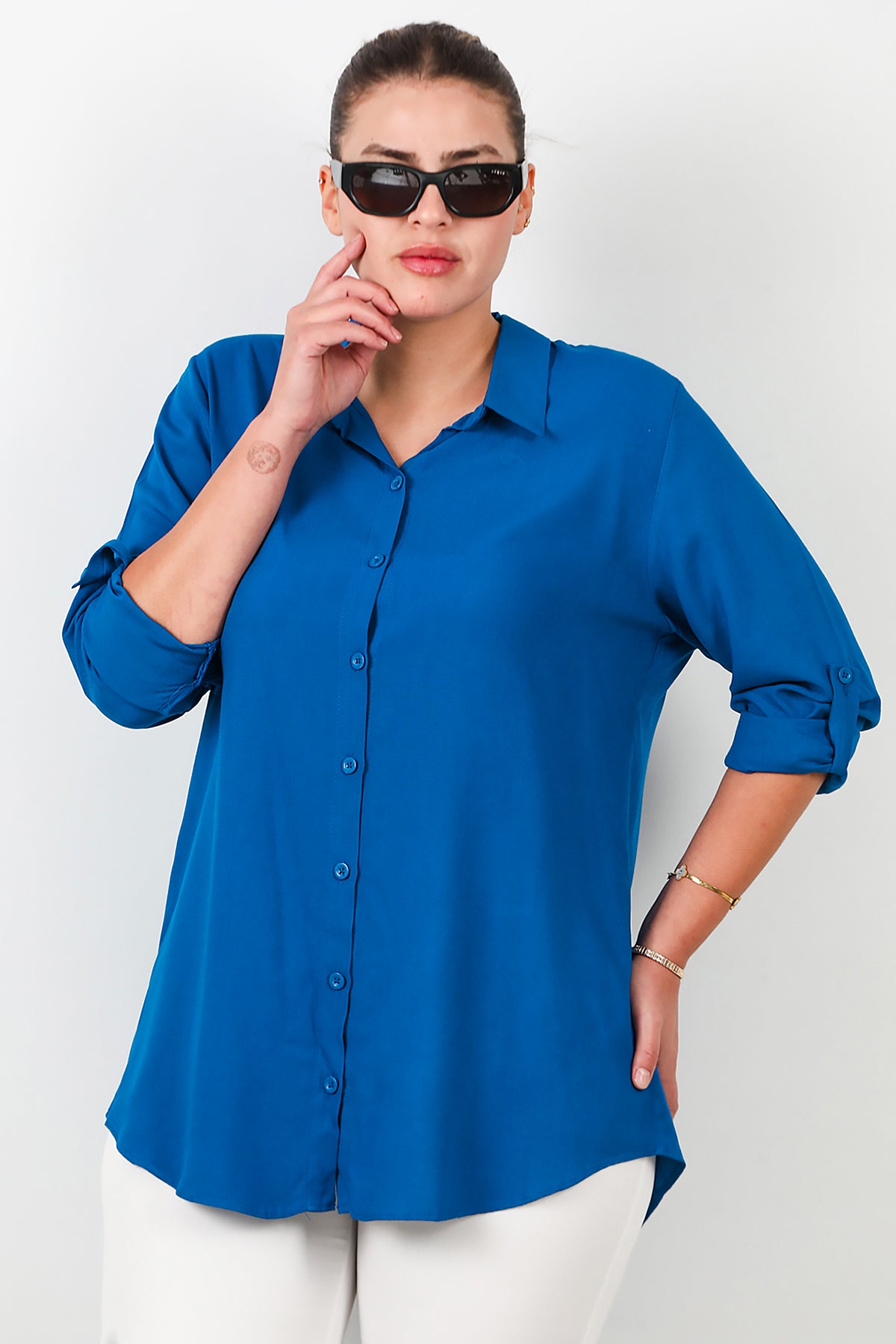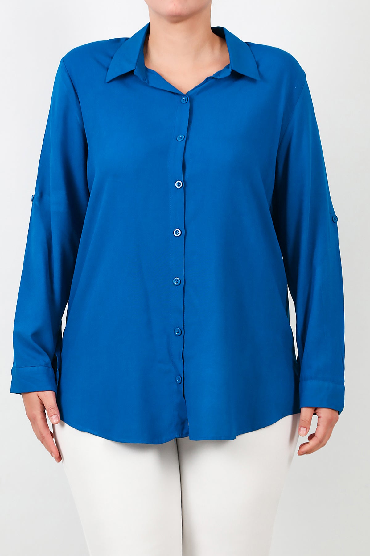Büyük Beden Kol Katlamalı Gömlek Saks