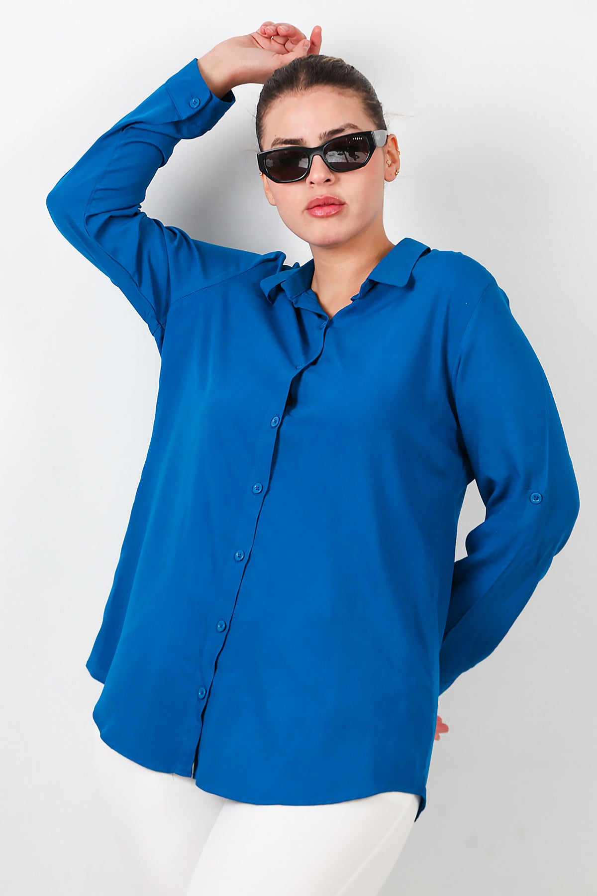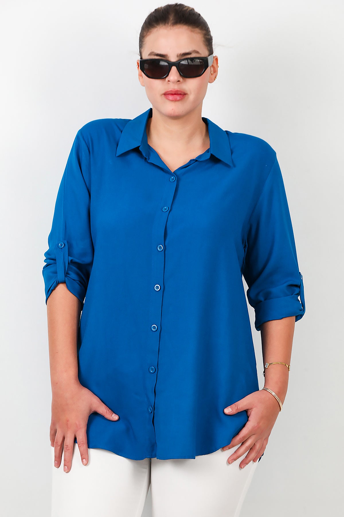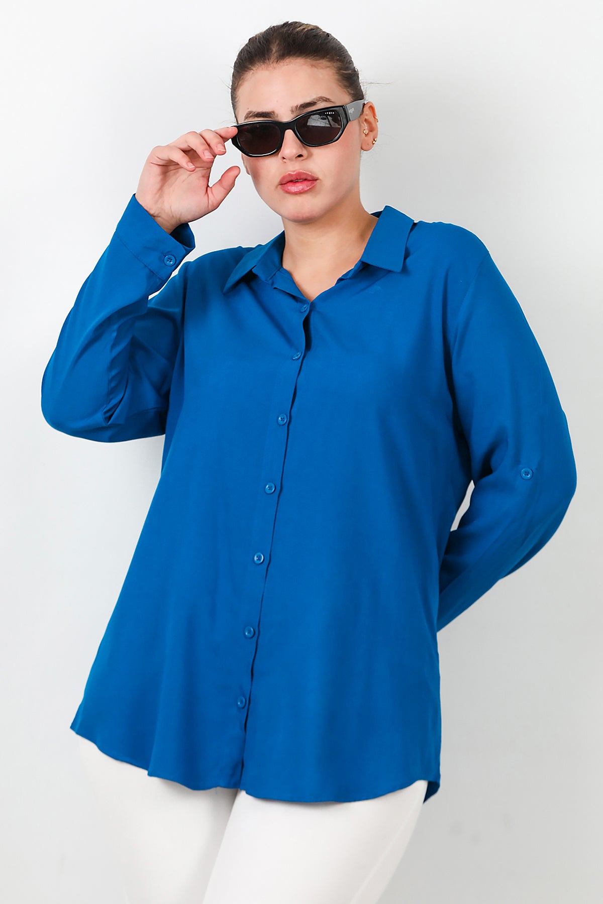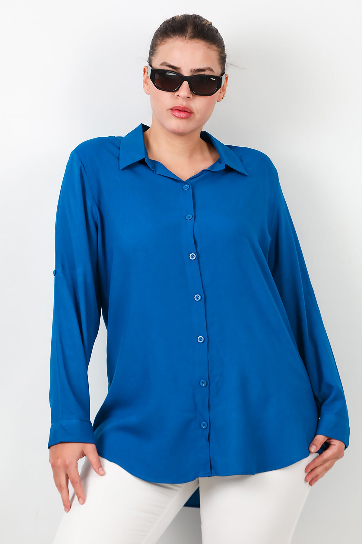 Büyük Beden Kol Katlamalı Gömlek Saks