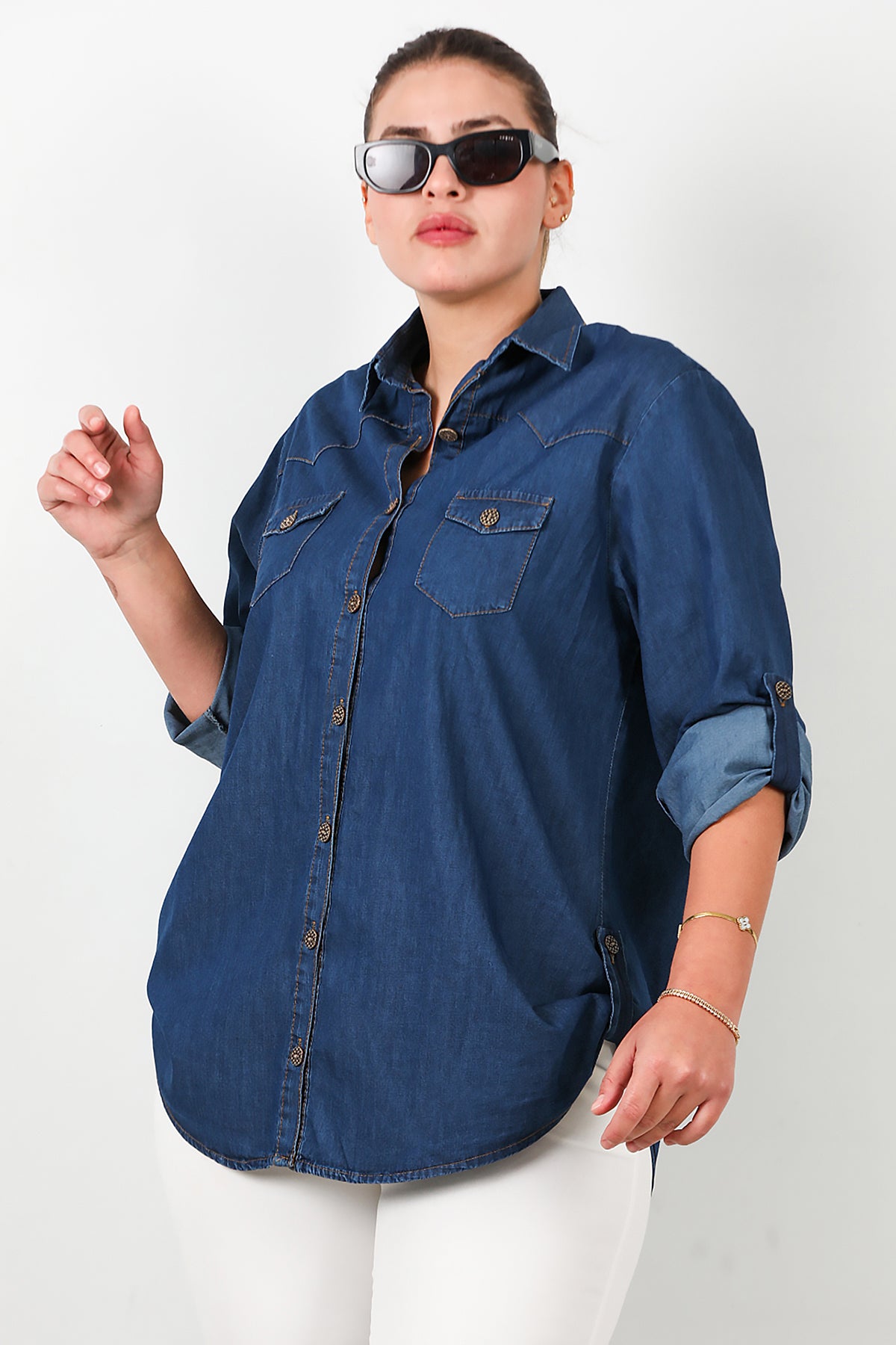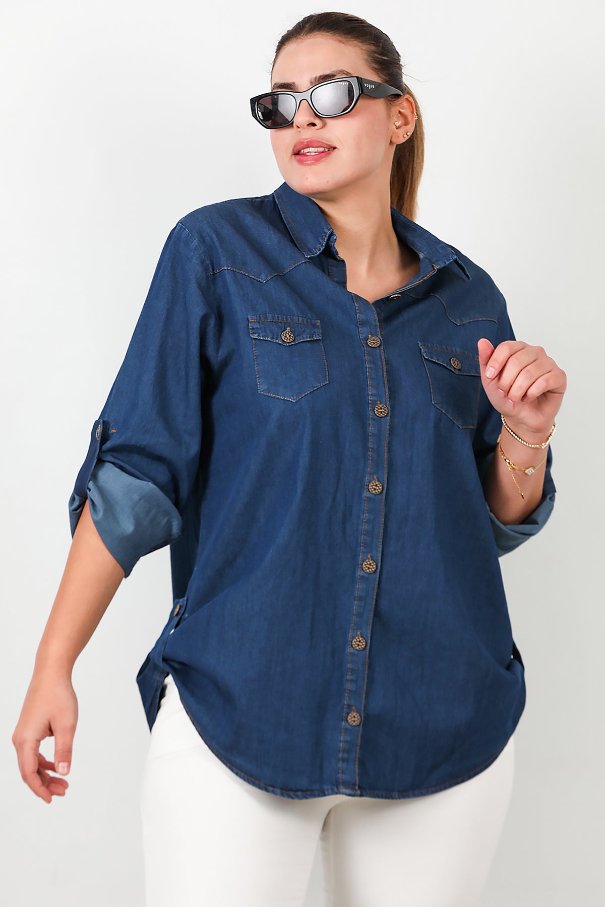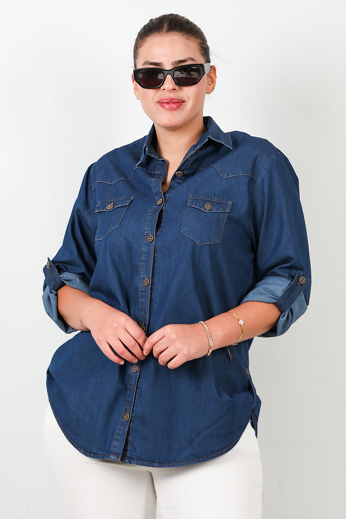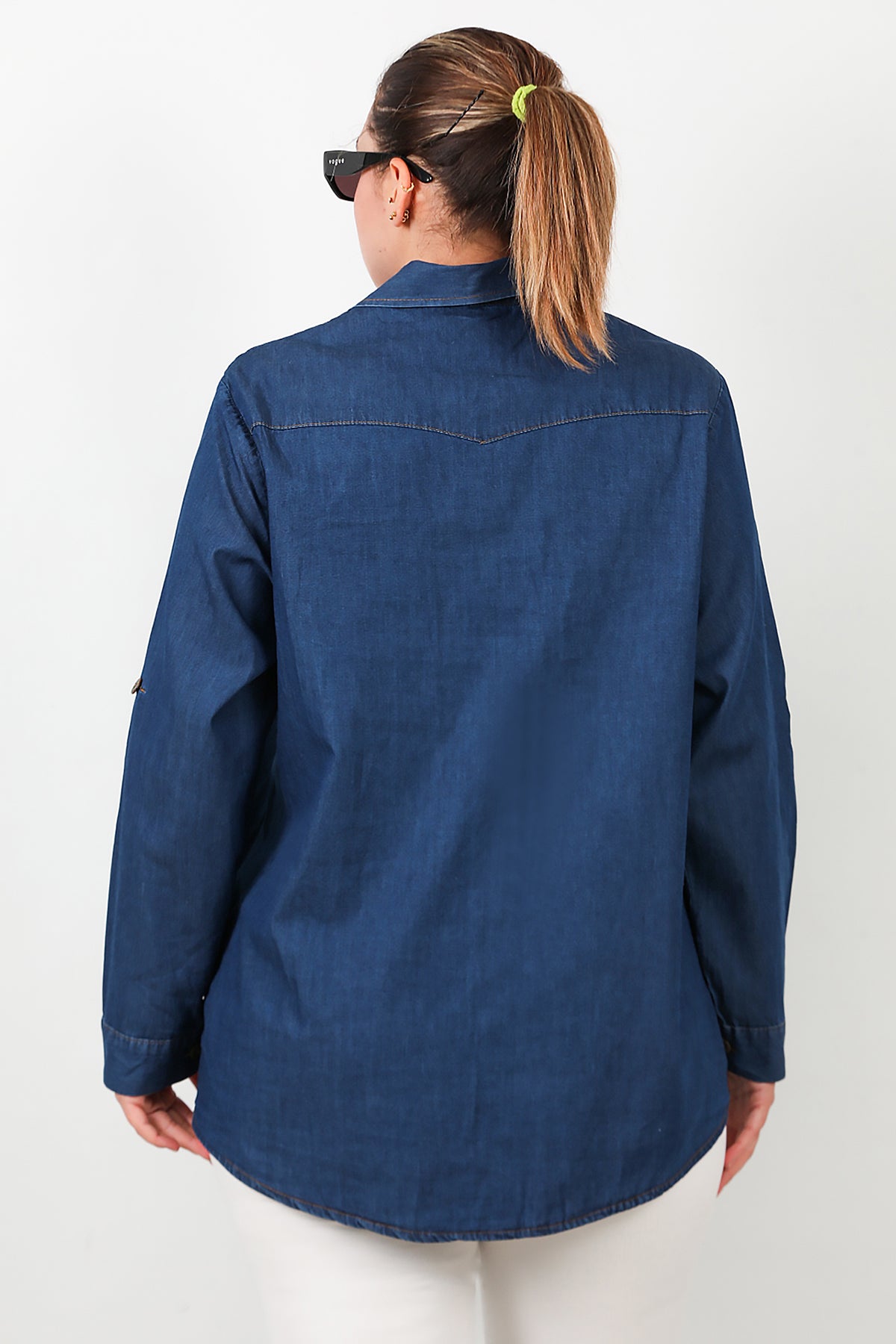 Büyük Beden Kol Katlamalı Kot Gömlek Lacivert