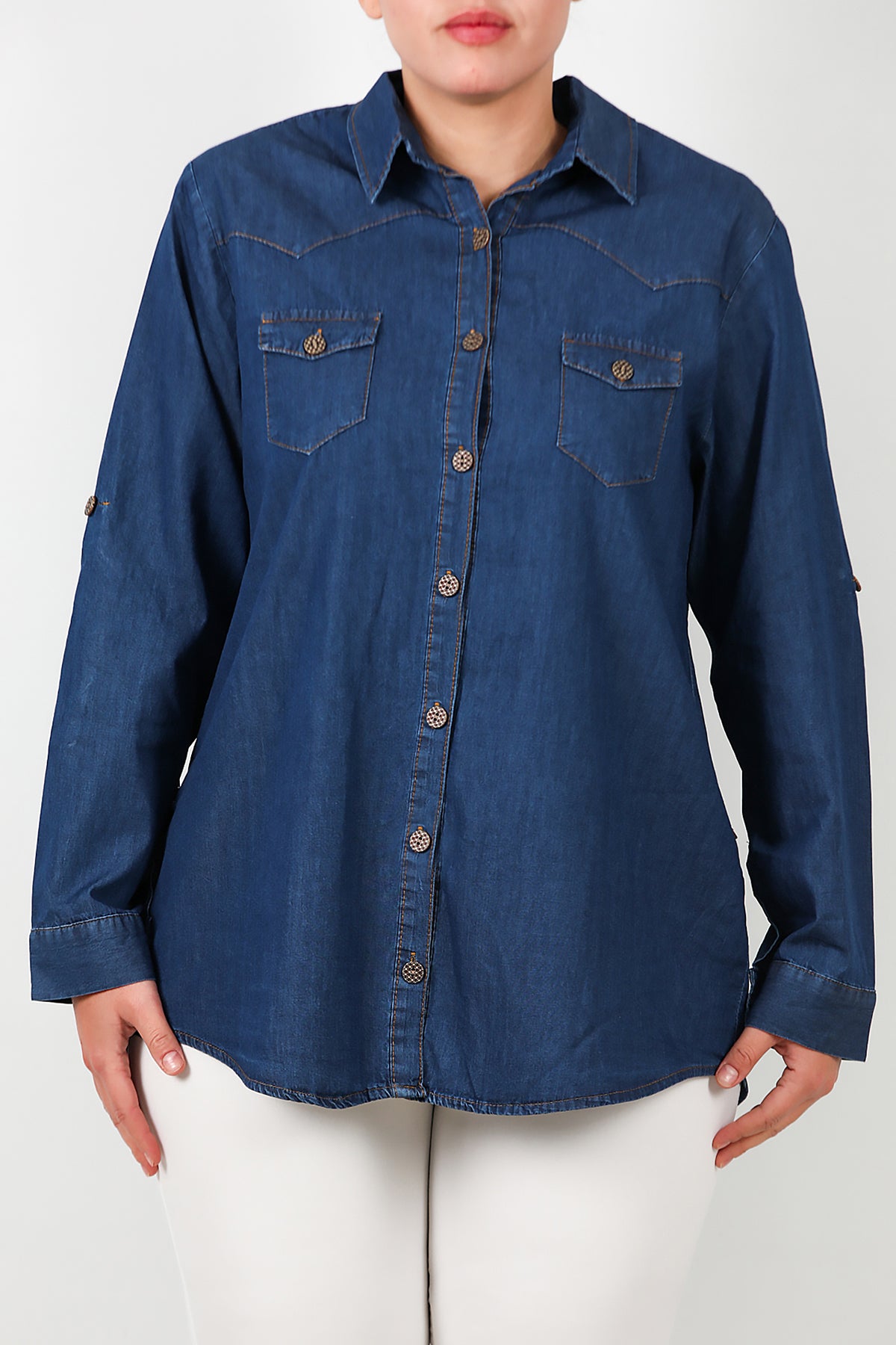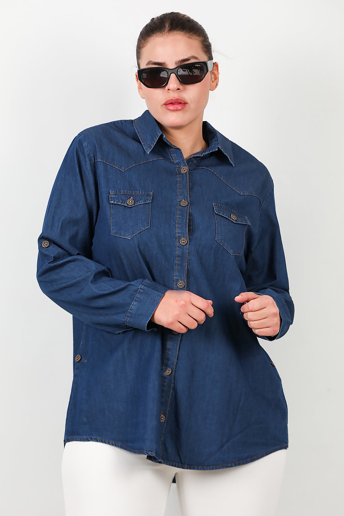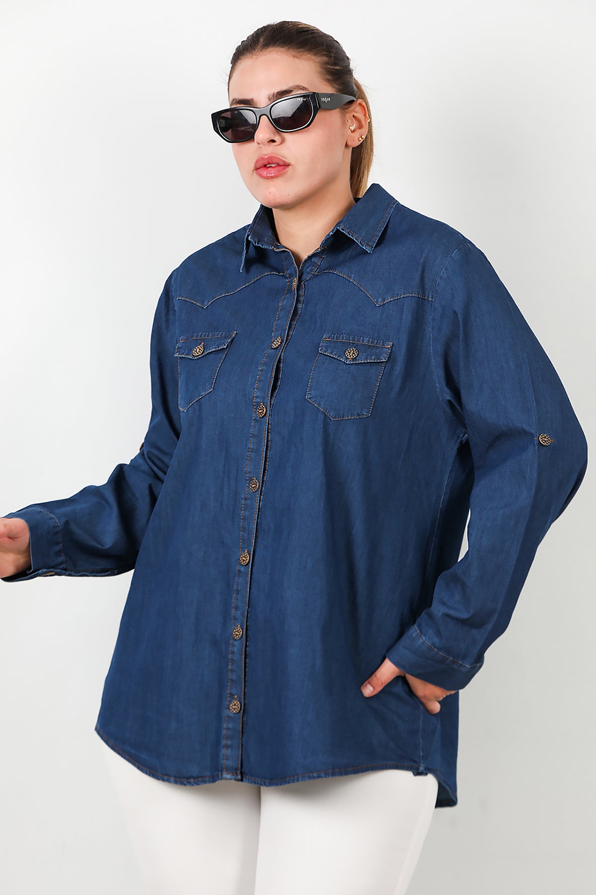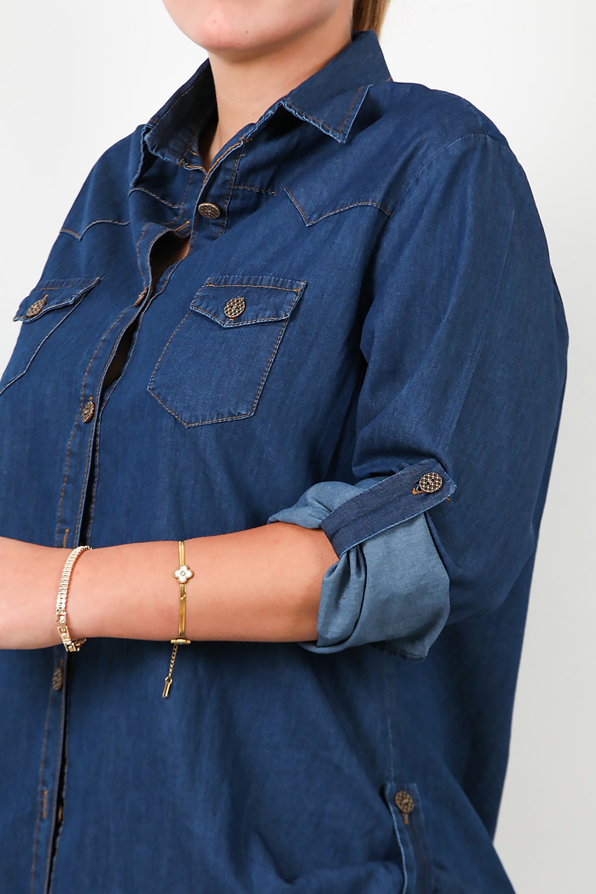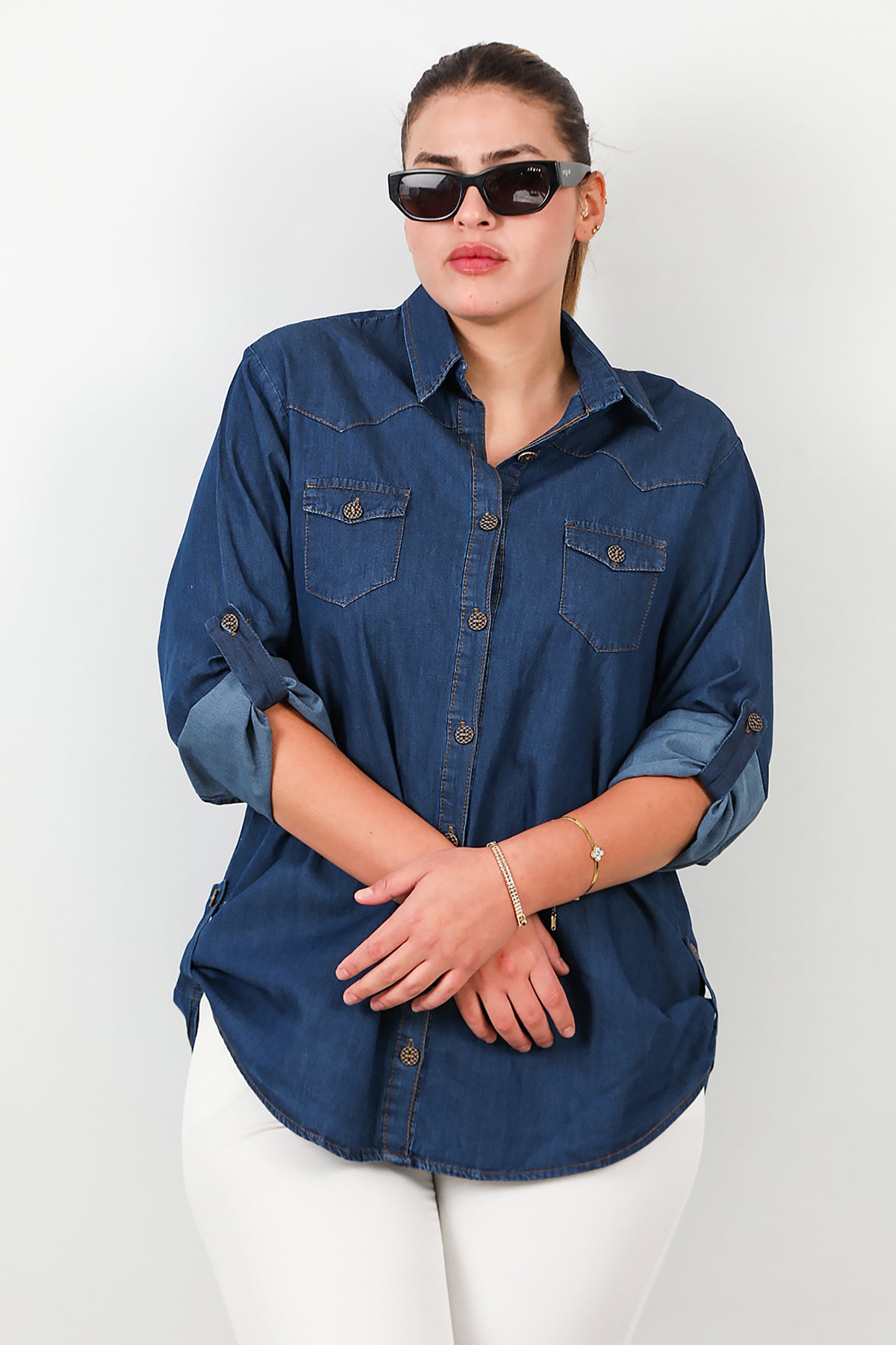 Büyük Beden Kol Katlamalı Kot Gömlek Lacivert