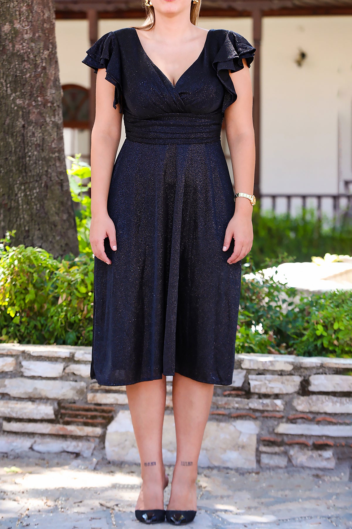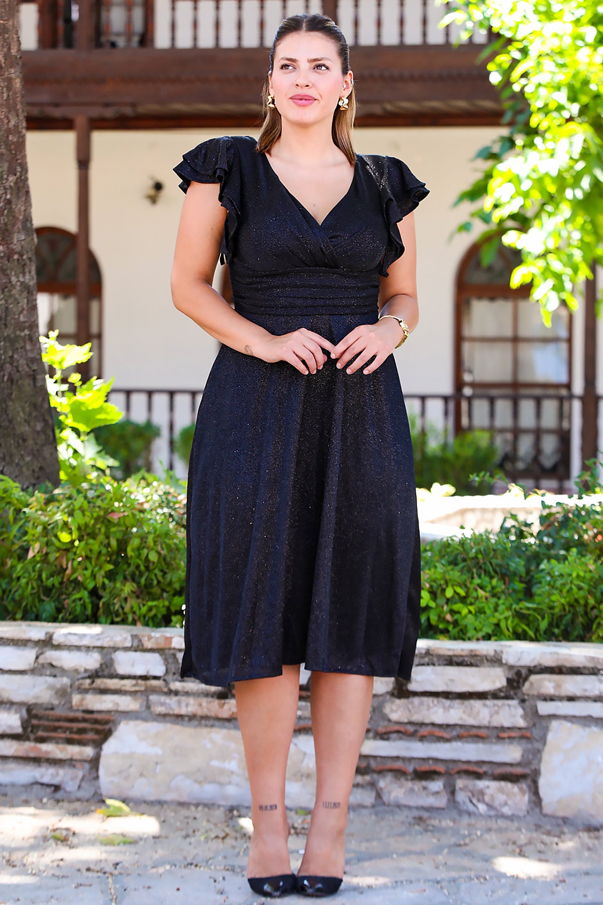Büyük Beden Kol Katlı Simli Kısa Abiye Siyah