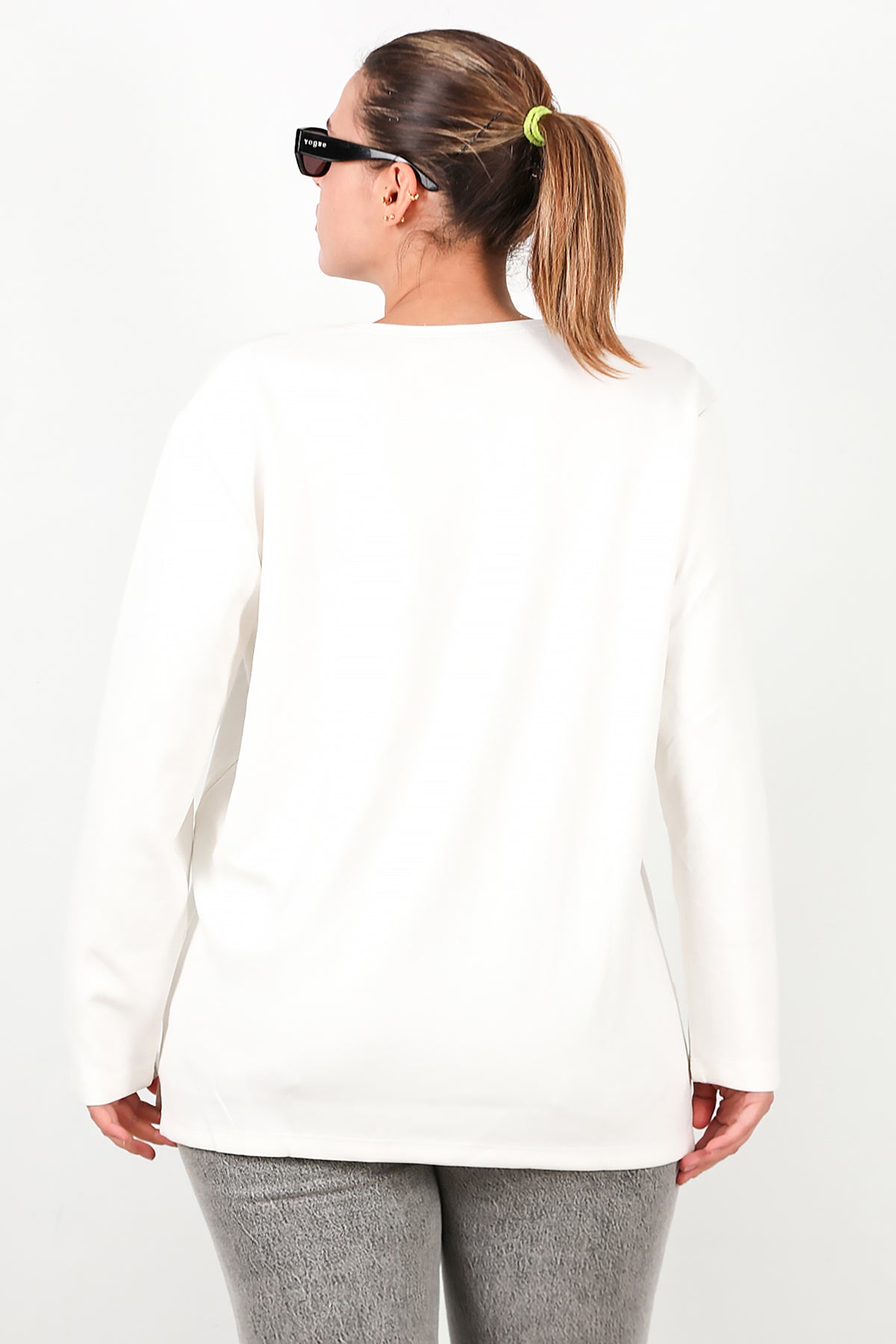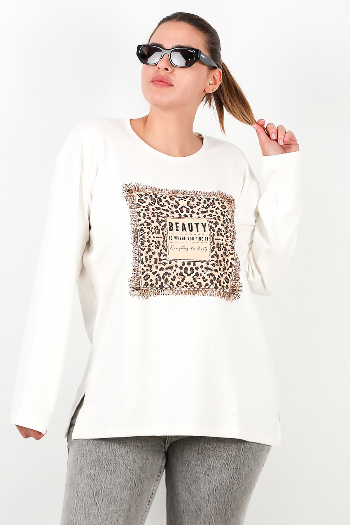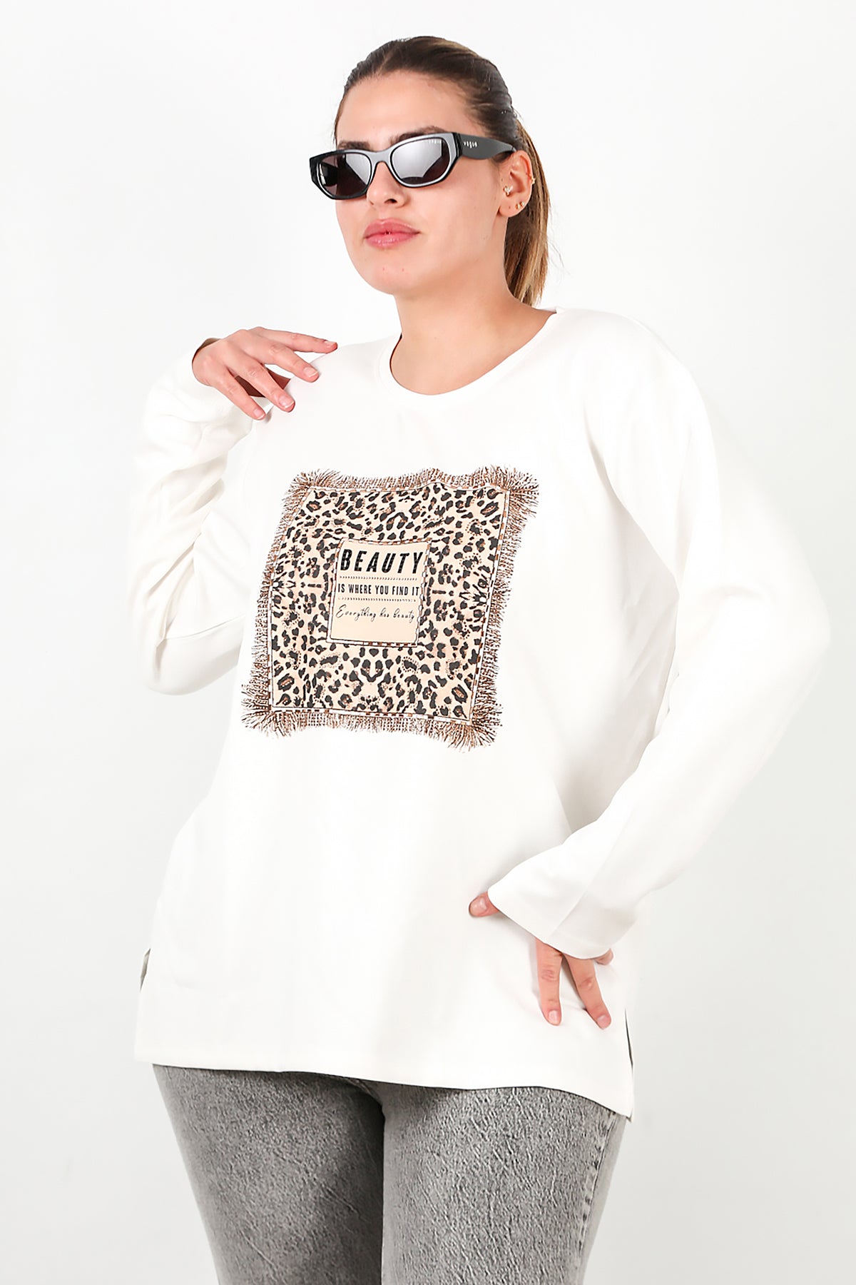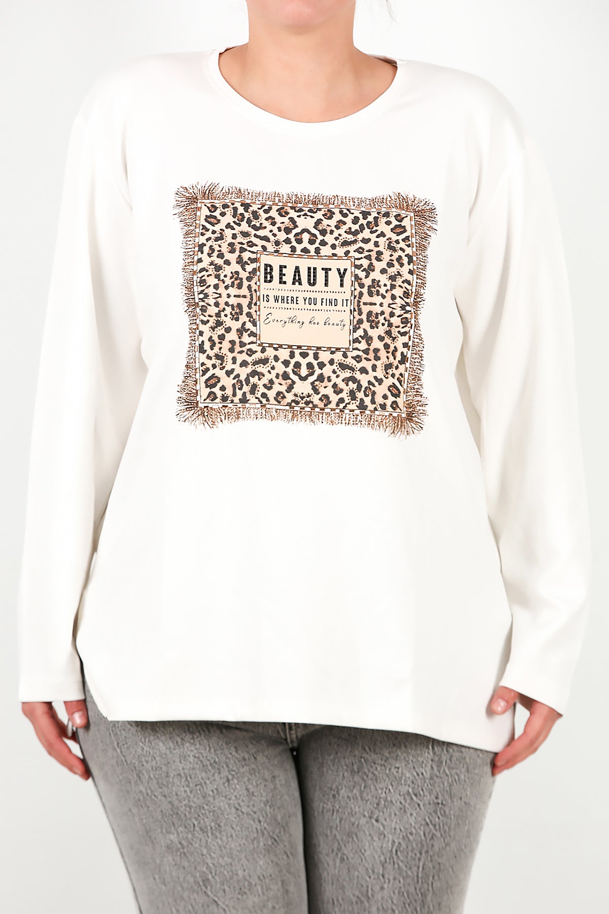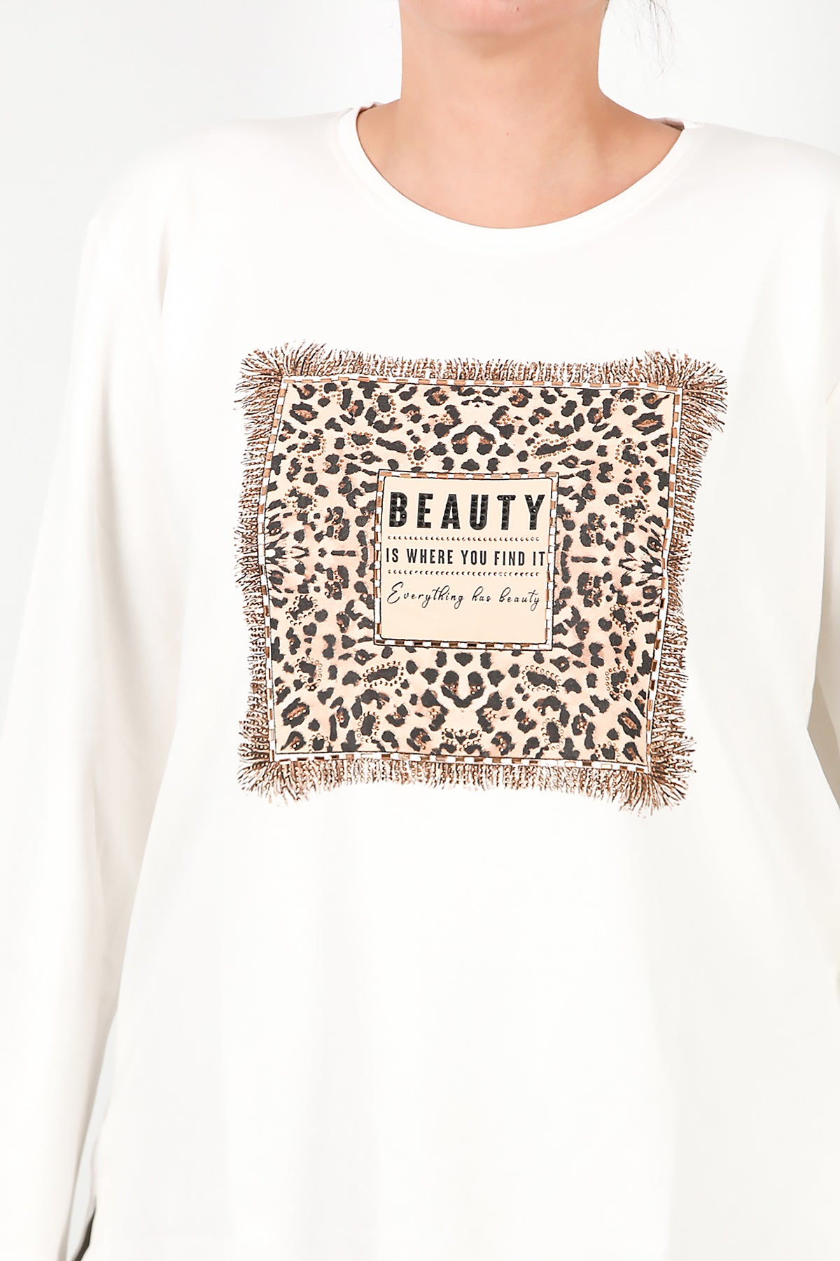 Büyük Beden Leopar Taş İşlemeli Bluz Ekru