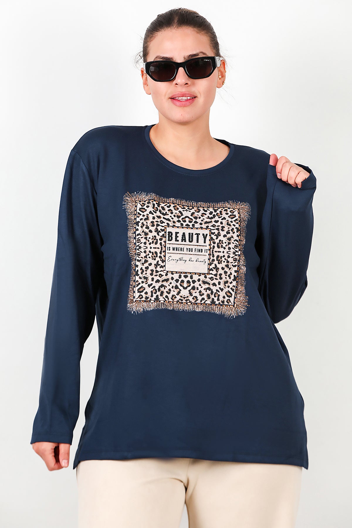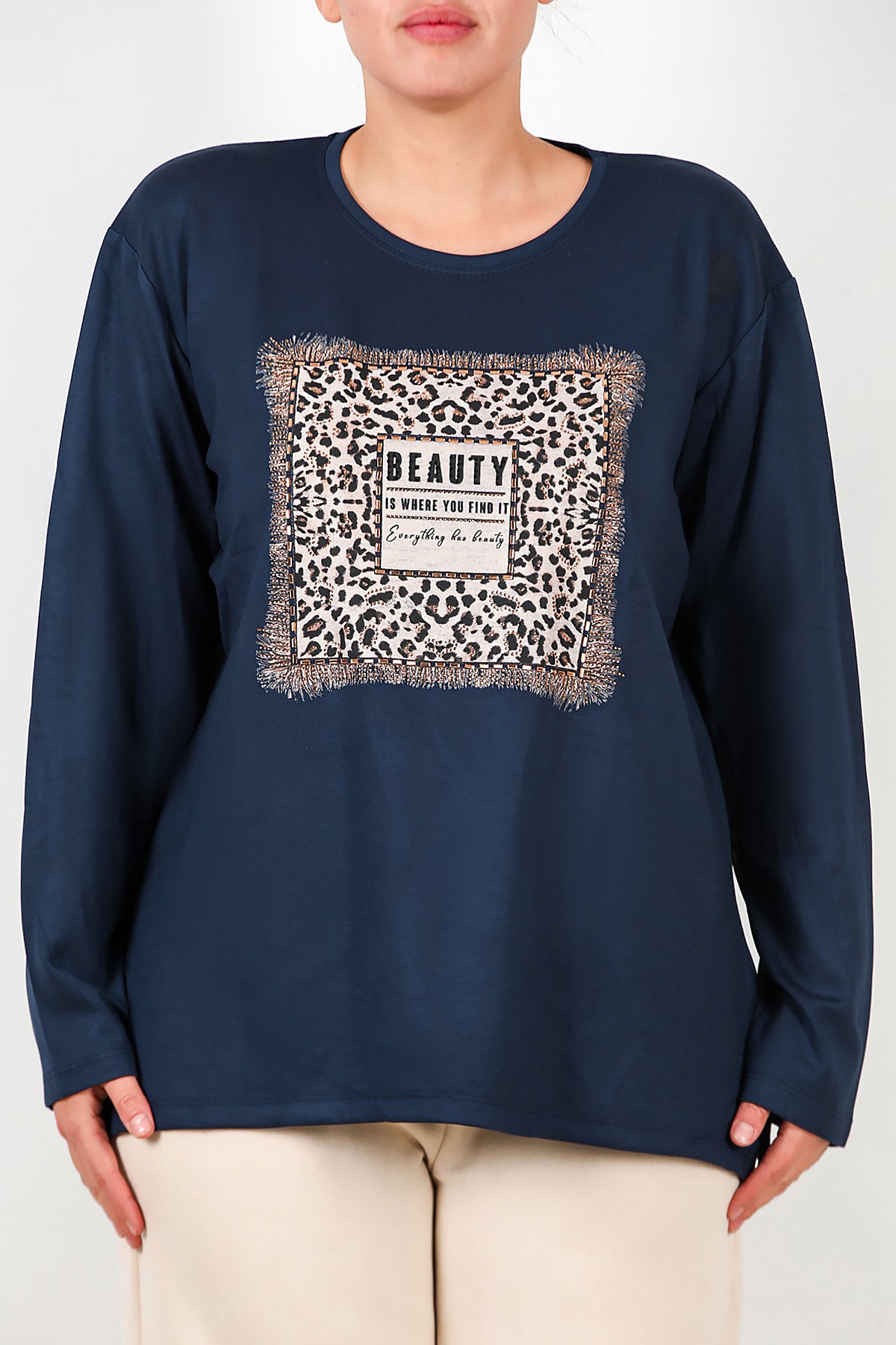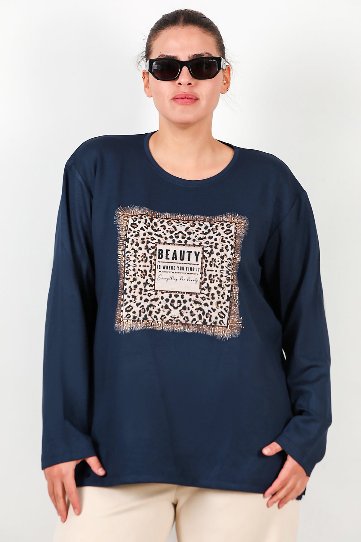 Büyük Beden Leopar Taş İşlemeli Bluz Lacivert