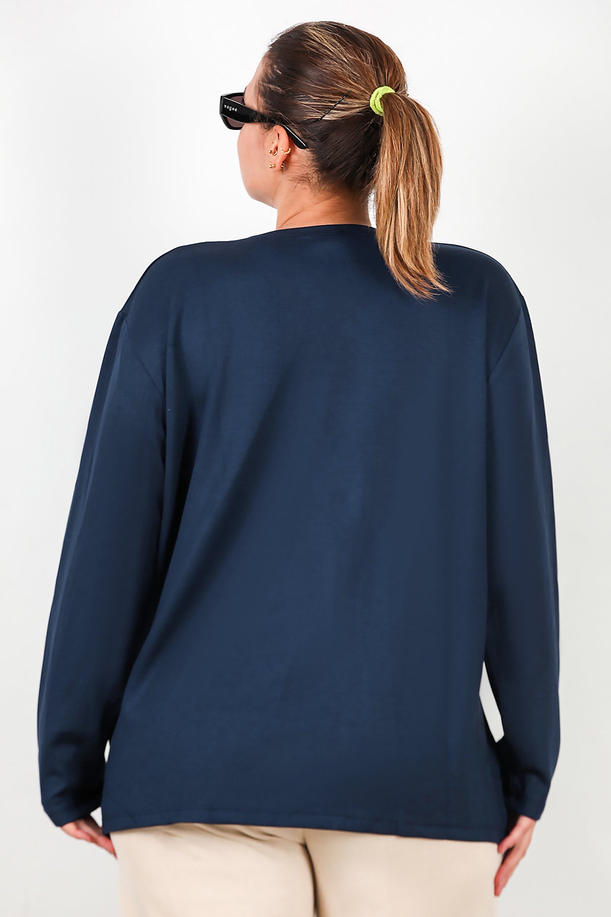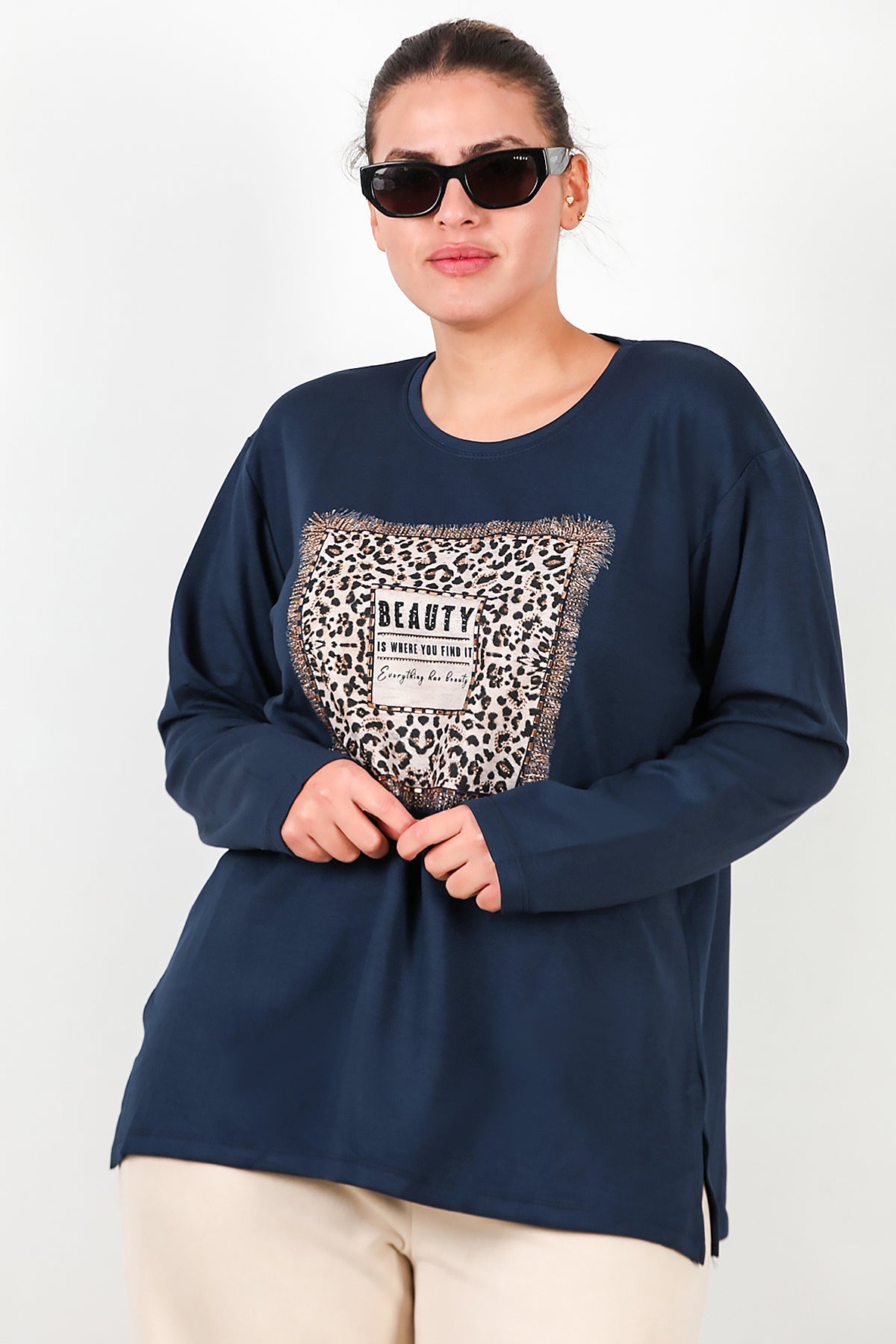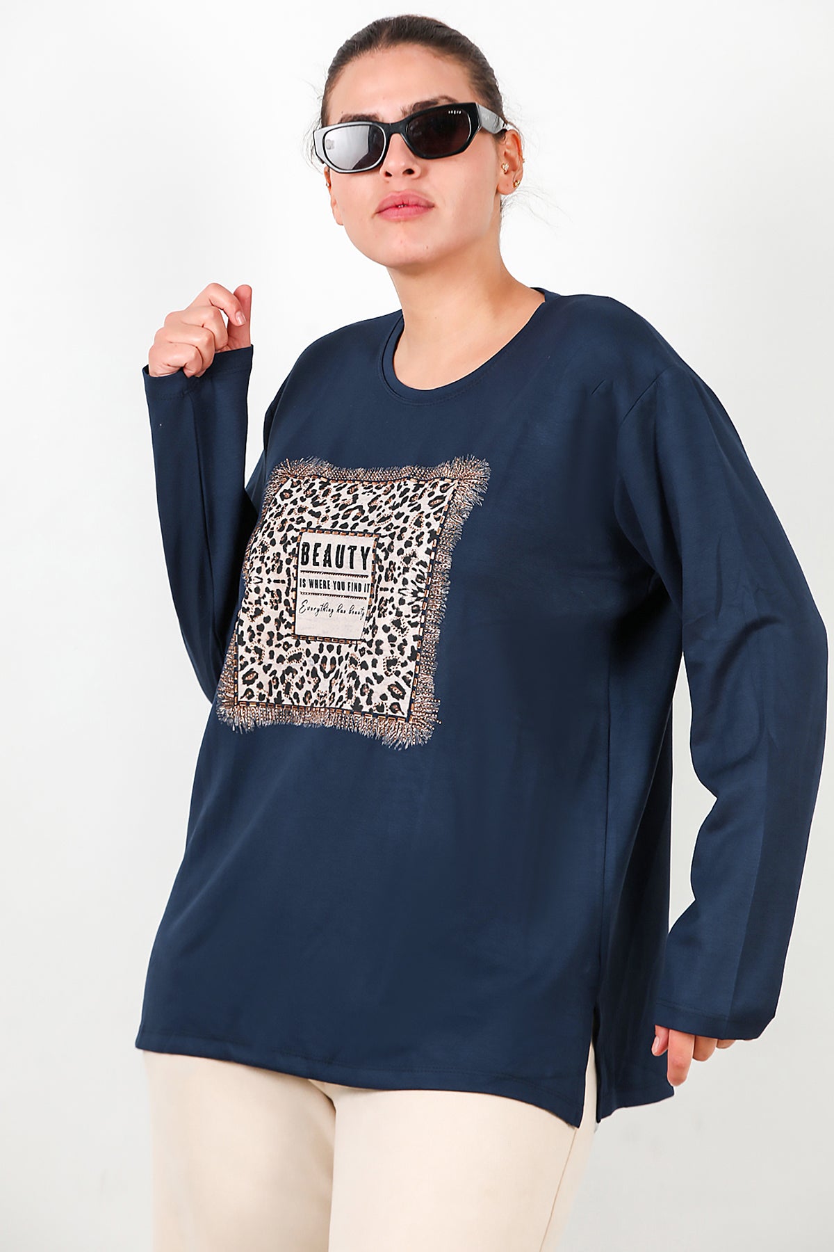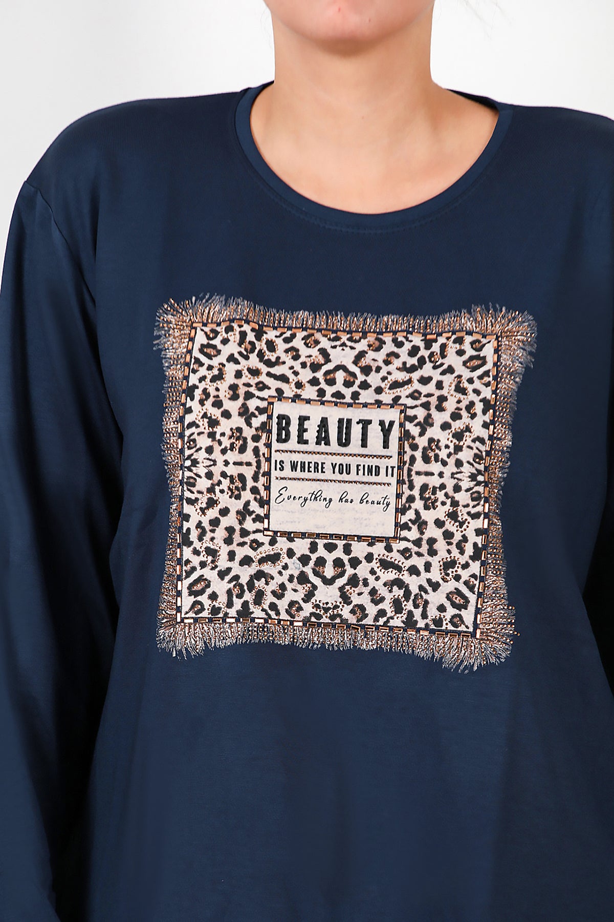 Büyük Beden Leopar Taş İşlemeli Bluz Lacivert