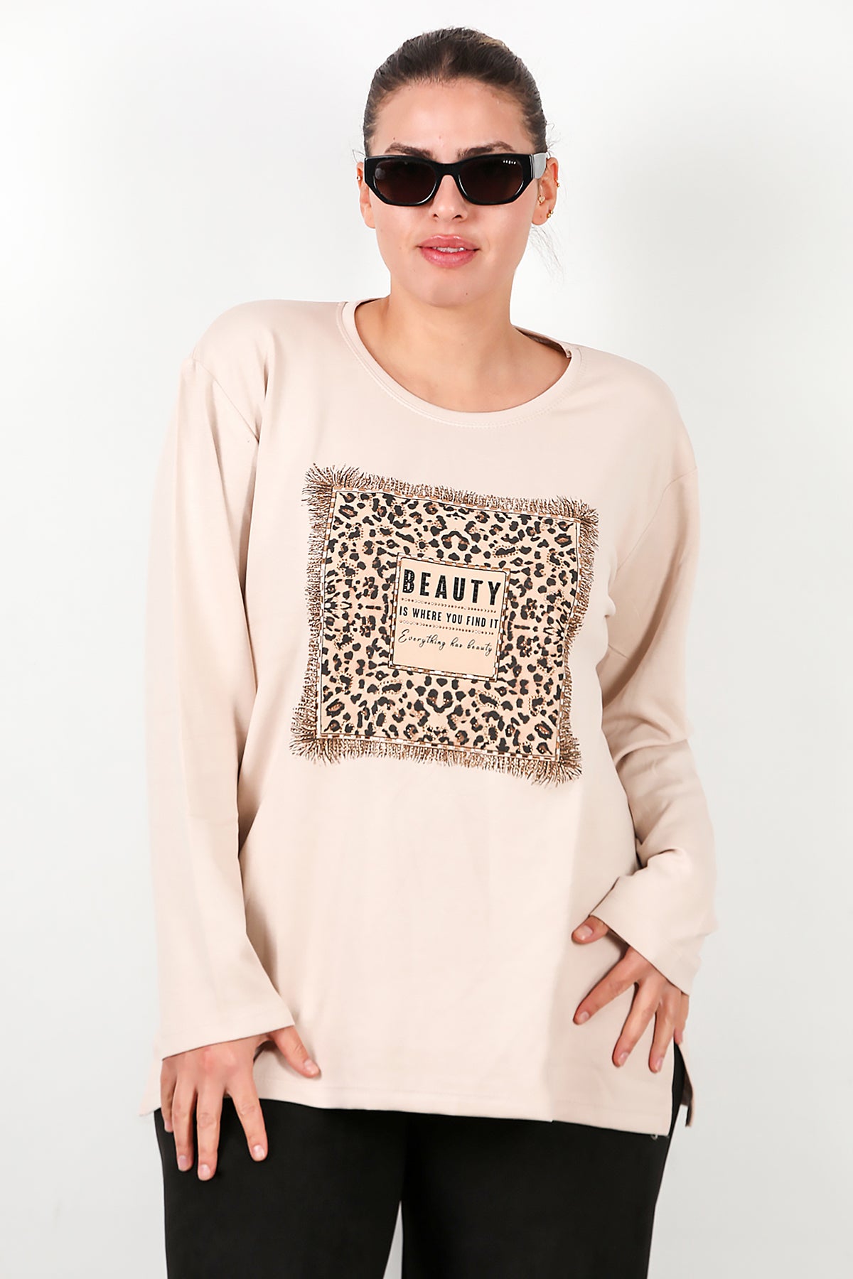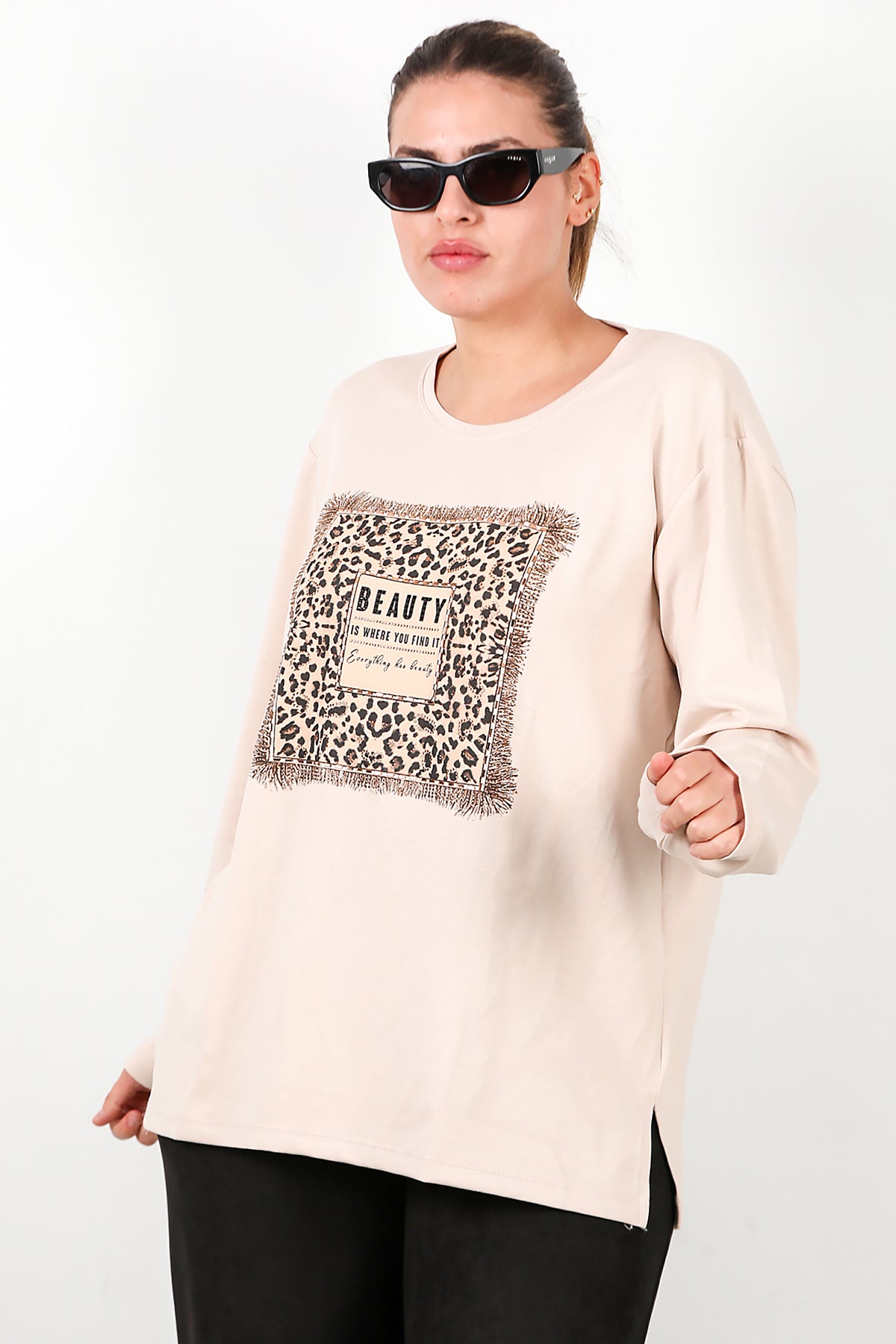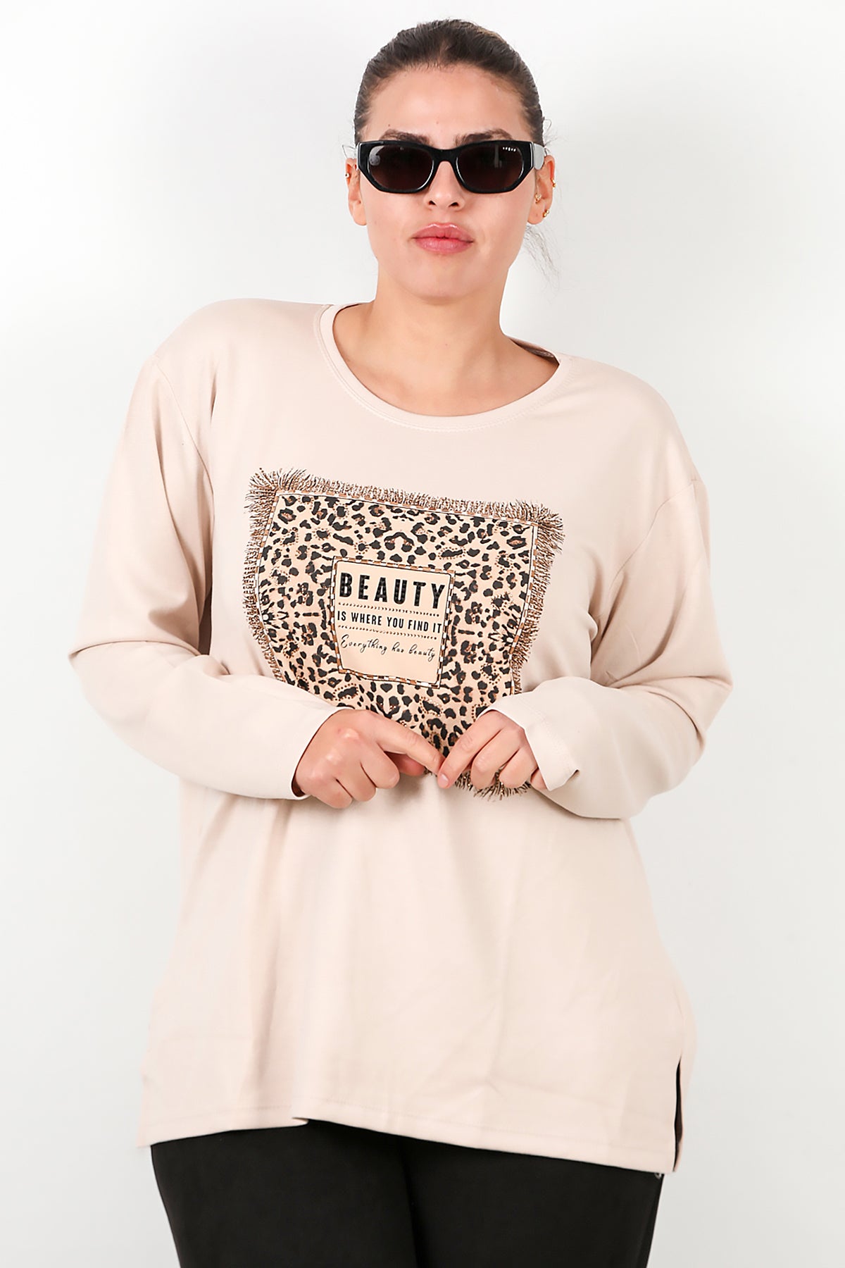 Büyük Beden Leopar Taş İşlemeli Bluz Taş