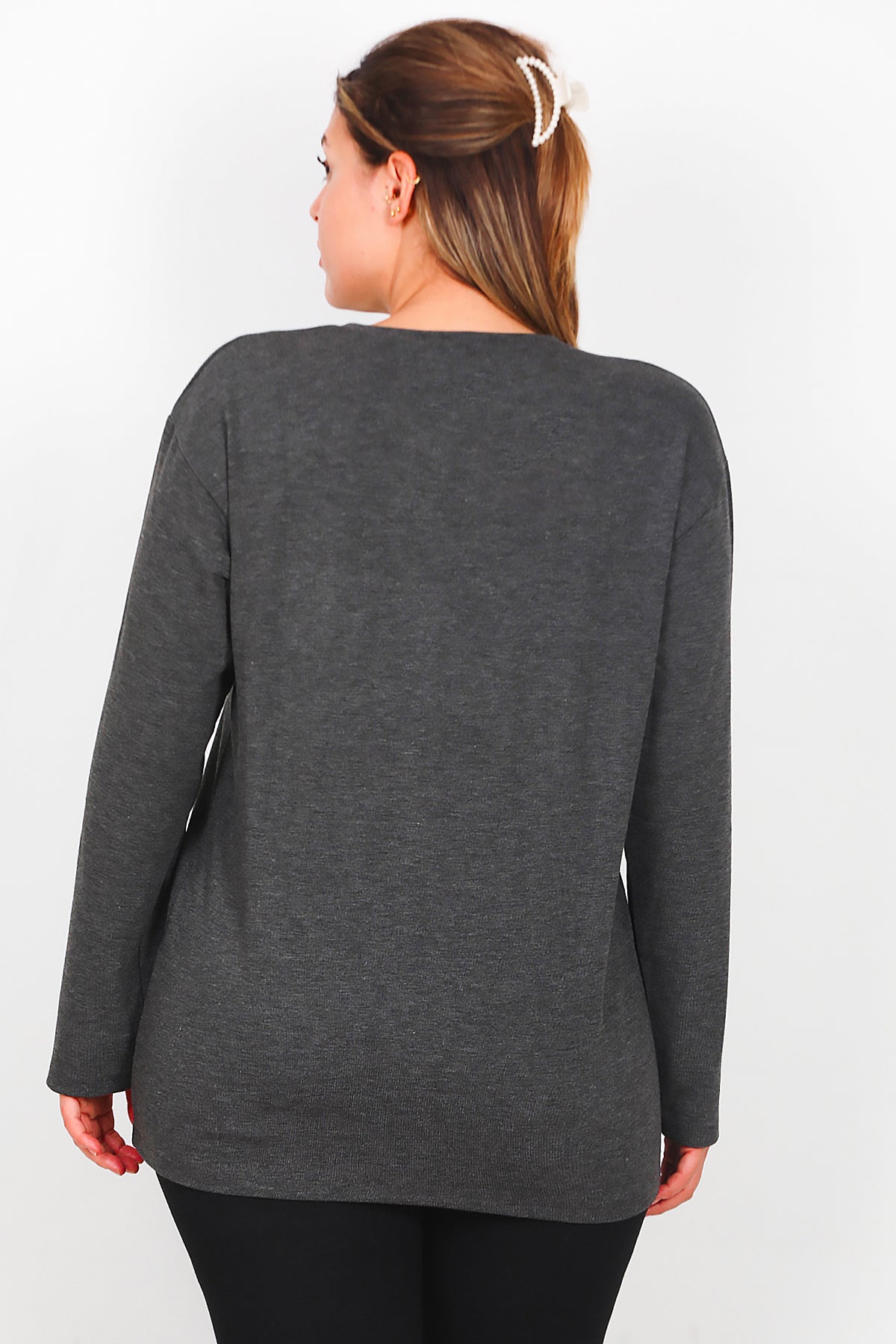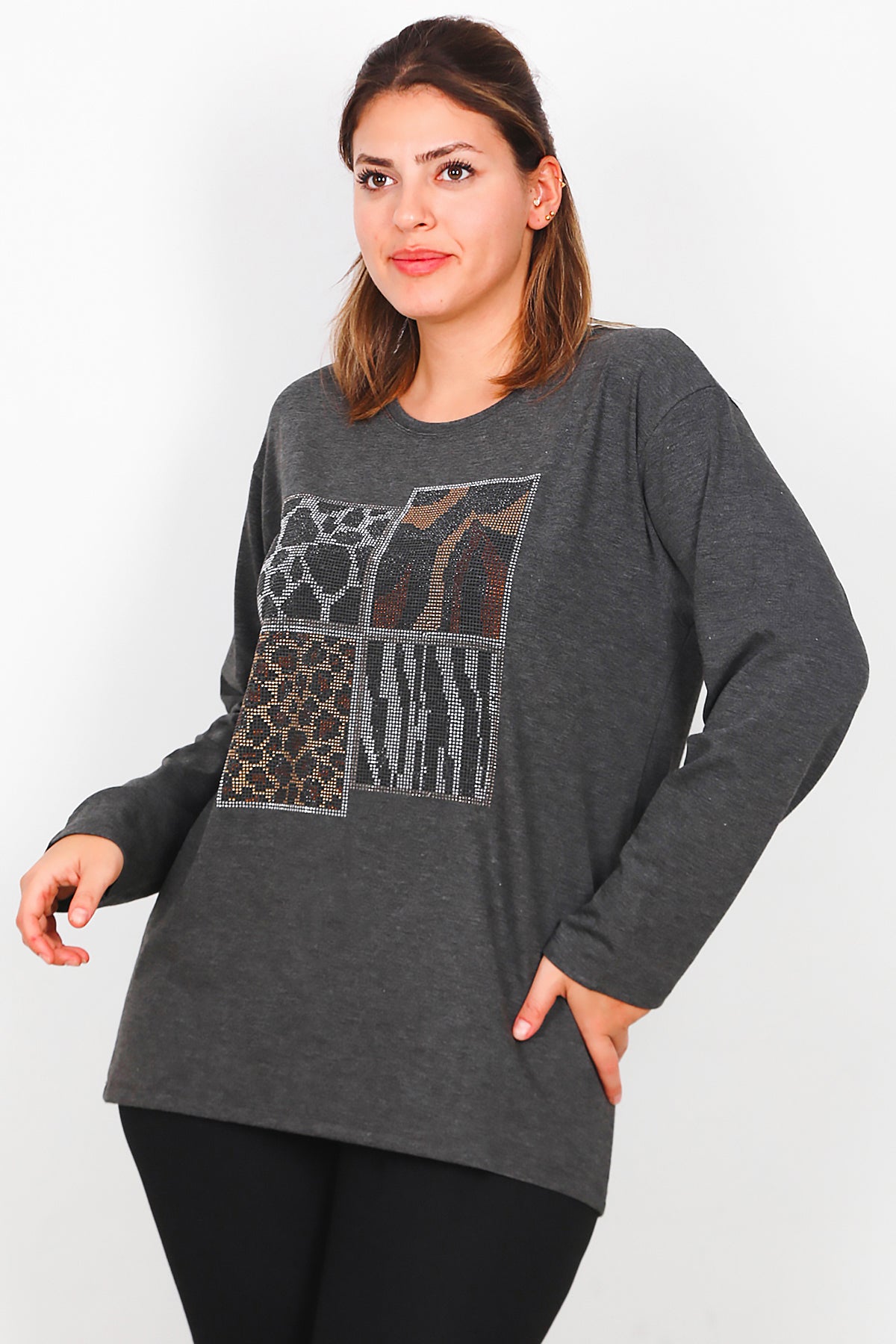 Büyük Beden Leopar Taşlı Uzun Kol Bluz Antrasit