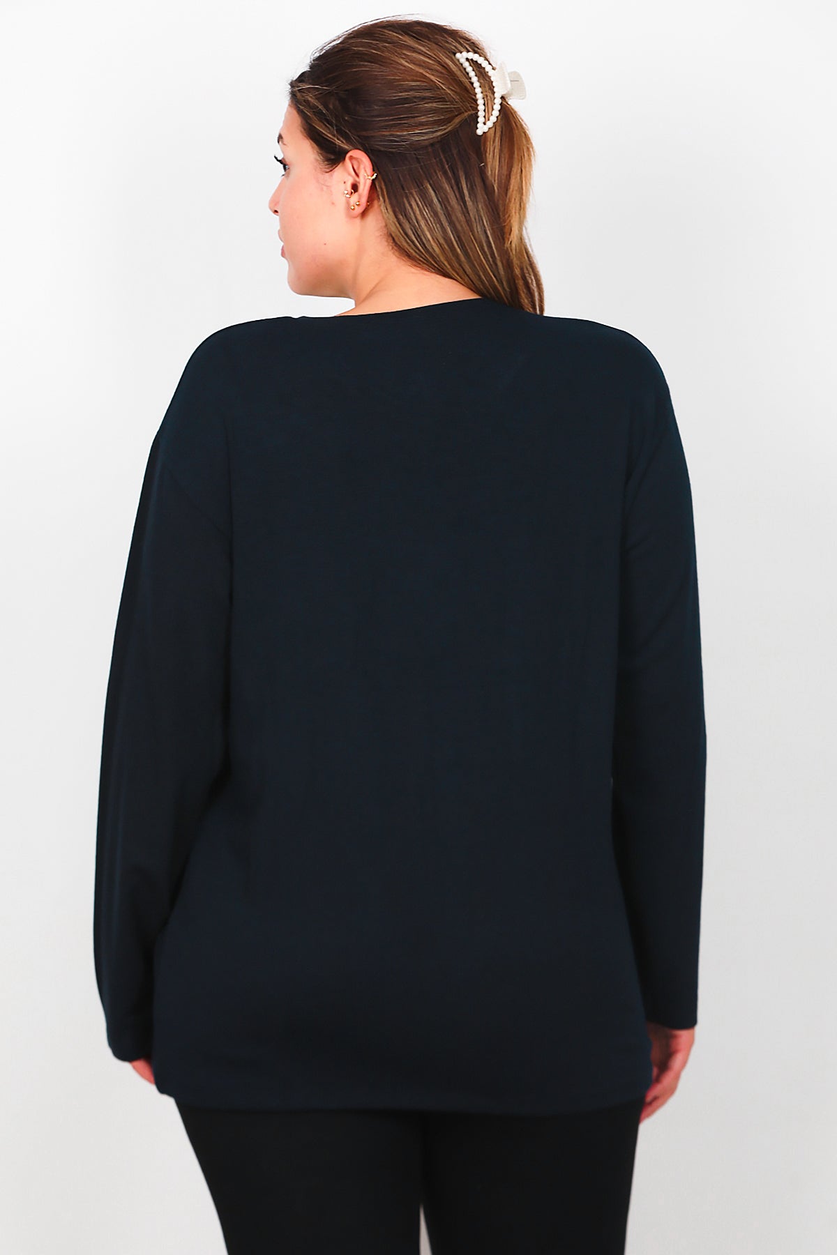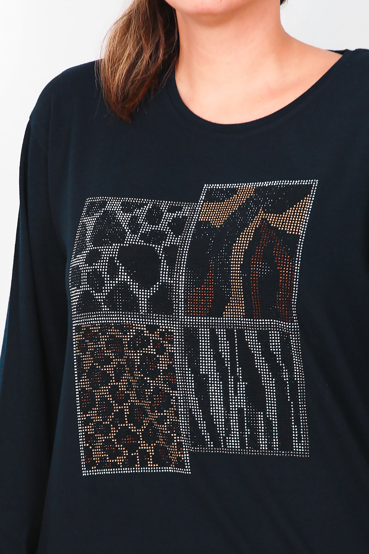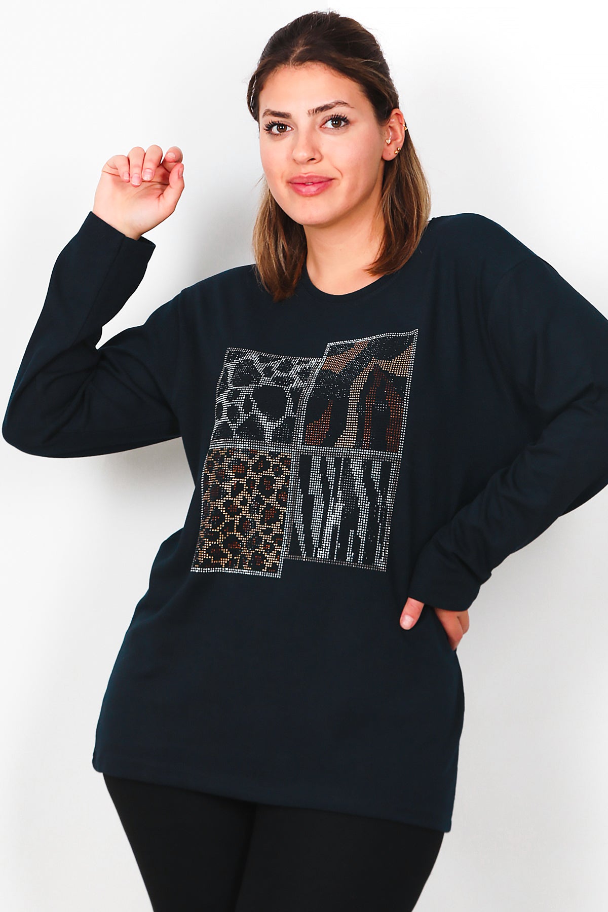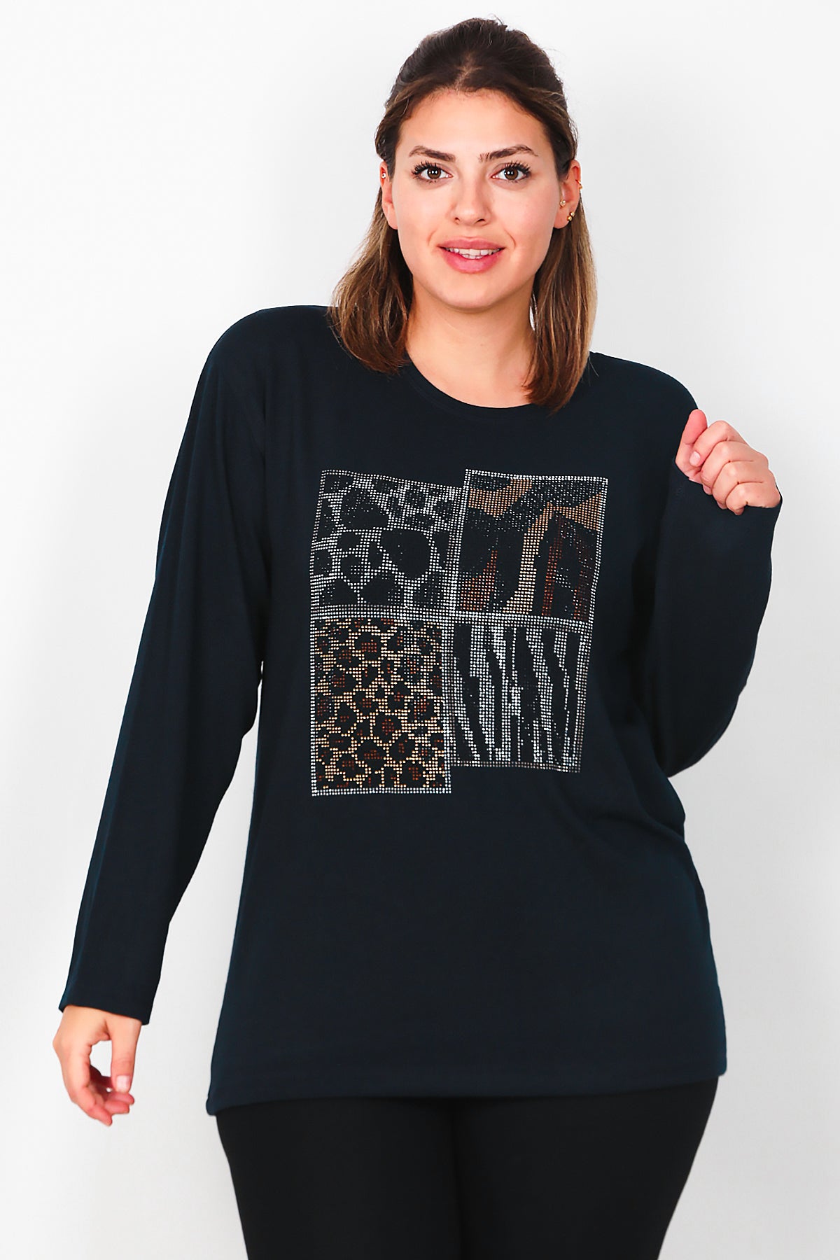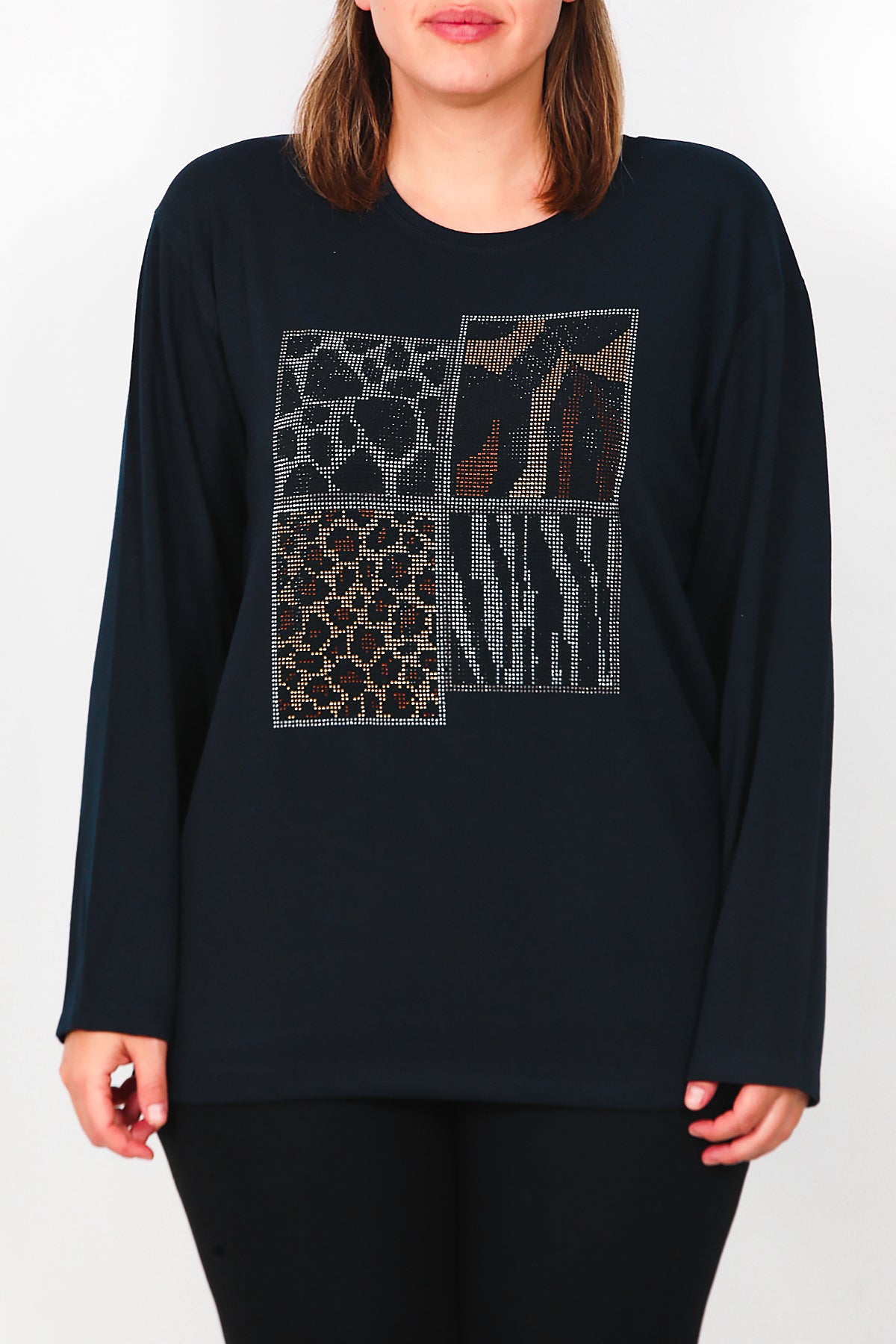 Büyük Beden Leopar Taşlı Uzun Kol Bluz Lacivert