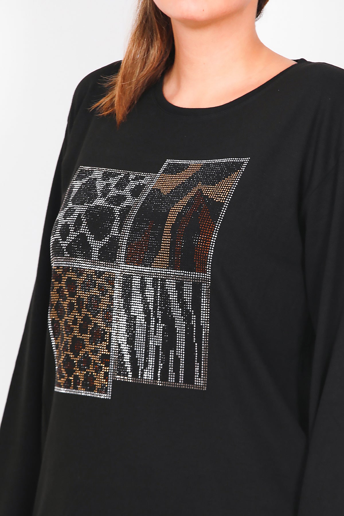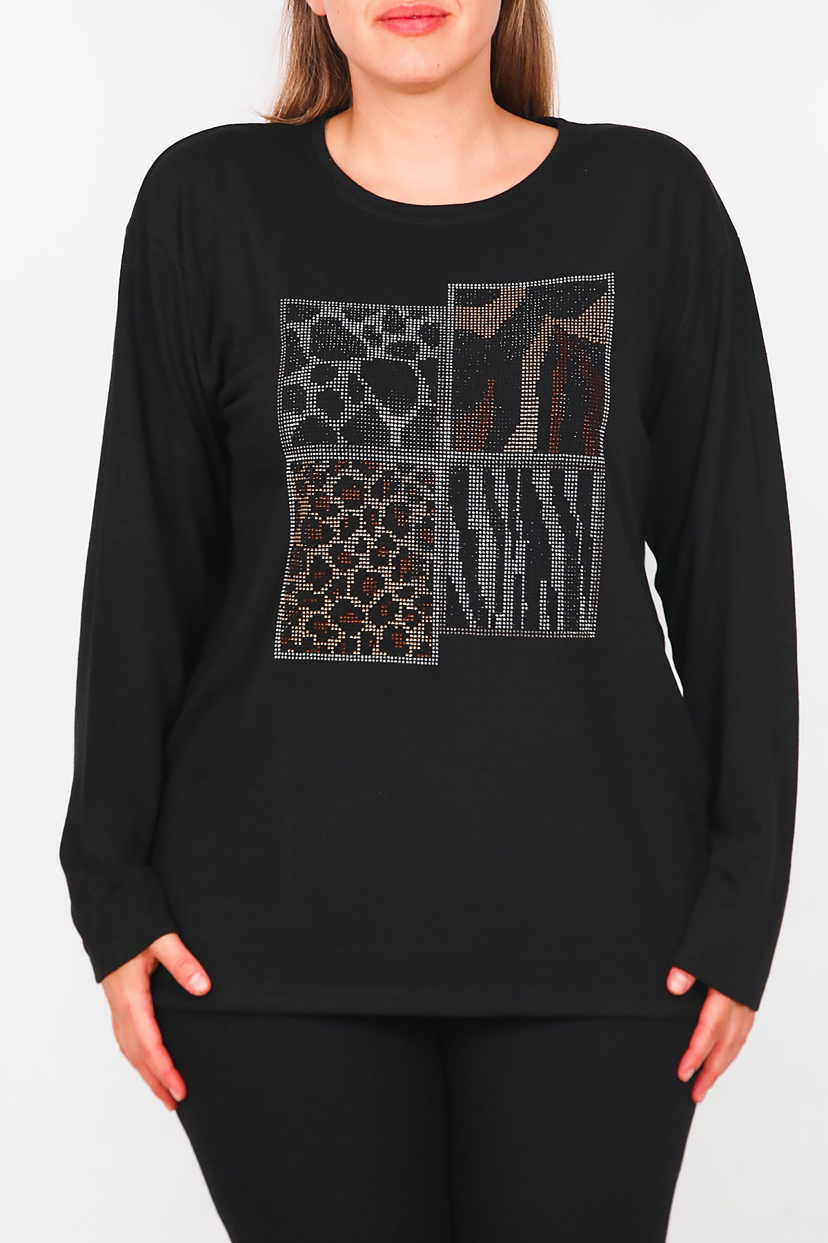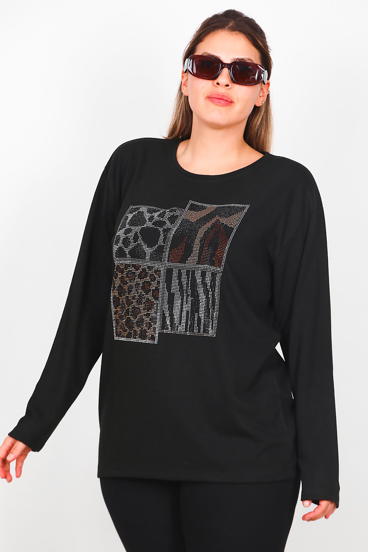 Büyük Beden Leopar Taşlı Uzun Kol Bluz Siyah